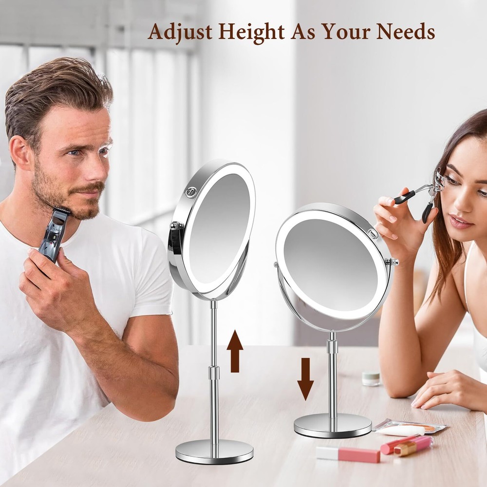 8 Inch Lighted Makeup Mirror with Magnification 1x/10x Magnifying Mirror with 3 Color Light 2500mAh Rechargeable Height Adjustable 360° Rotation Double Sided LED Vanity Mirror for Desk Upgraded Adjustable Height Light Up Mirror: Height adjustable makeup mirror, you can find the comfortable height you need, conform to any makeup table height, and do not have to bend over. The make up mirror with lighting is suitable for tables of all sizes. Convenient for people at different heights. Ideal for family use. Dual-Sided Mirror with 1X and 10X Magnification: Our makeup mirror features a classic design with a 1X mirror for everyday makeup application and a 10X magnification side for precision tasks like eyebrow threading, contact lens insertion, detailed shaving, and precise mascara application. It’s perfect for both your daily routine and those moments when extra care is needed. One-Touch Control for Custom Lighting: With a simple touch, switch between three different light colors and adjust the brightness to suit your environment. Short press the sensor switch to change the light’s 3 colors, long press to adjust the brightness. The smart memory function recalls your last brightness setting, ensuring consistency with each use. It’s the ideal lighting solution for your vanity, no matter the time of day. Full Charge in 4-5 Hours for Wireless Use: Enjoy up to 4-5 hours of wireless use on a single charge with the built-in 2500 mAh battery. The lighted mirror is 30% brighter than traditional power sources, and you can recharge it easily with any USB port, whether from a laptop, power bank, or wall charger. Large 8-Inch Mirror for Versatile Use: Our large 8-inch lighted mirror offers a wide-angle, high-definition view, ensuring you never miss a detail. The non-slip padding keeps the mirror stable on any surface. Additionally, the mirror detaches easily for travel. Use it as a professional vanity mirror at home, in the bathroom, hotel, spa, or beauty salon. It also doubles as a desk lamp, night light, or ambient lighting, making it a versatile and elegant addition to any setting, as well as a luxurious gift.