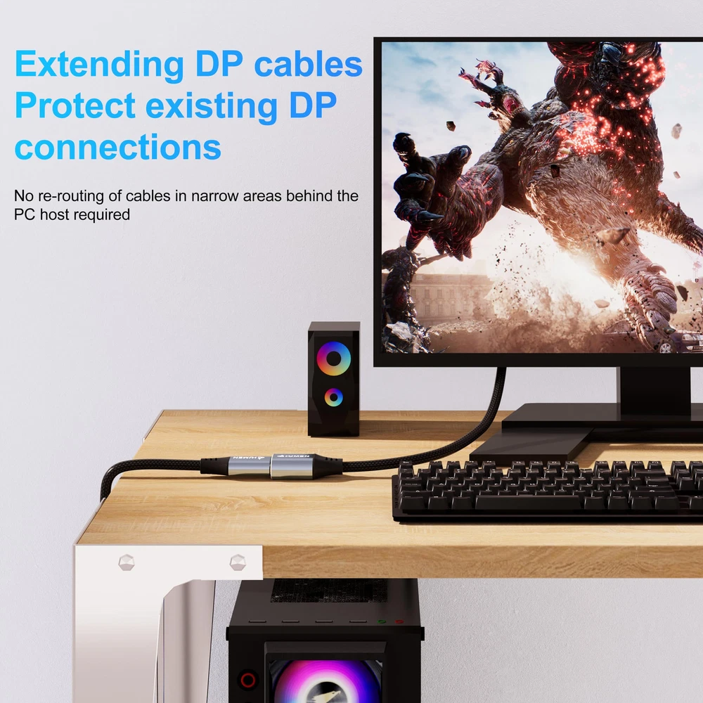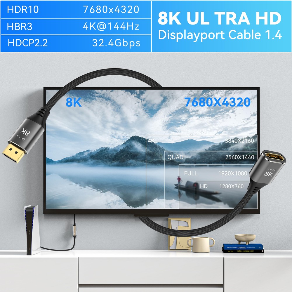 【8K High Resolution,DP1.4 Standard】- This Displayport extension cable supports 8K ultra-high resolution and is backwards compatible with 4K @ 144Hz, UHD and HDR. Upgraded to DP1.4, is also compatible with DP1.2 version. With a maximum bandwidth of 32.4 Gbps, signal transmission is smooth and stable. With HDCP 2.2 / Dynamic HDR / DPCP1.0 / DP++ / DSC / FEC / MST / HBR3 and more, you can enjoy perfect high frame rate video and multi-channel audio and stereo presence. 【Signal Extension and Freedom of Movement】- This DisplayPort extension cable connects a DisplayPort-compatible laptop or PC to a monitor/TV/projector equipped with DisplayPort inputs. A convenient accessory for extending the connection between DisplayPort input/output terminals, it provides stable transmission and can be applied when DisplayPort cable lengths are insufficient, giving you more freedom when wiring. It helps to increase the distance to the screen and expand the range of movement. 【Superior Stability and Durability】- DisplayPort extension cable has a 24K gold-plated connector that resists corrosion and oxidation. Assembled with an aluminum shell and copper foil spot welding, it provides better protection for internal materials and stable signal transmission. Made of flexible PVC and cotton braid, this DisplayPort extension cable is waterproof, handy and durable. No worries about failure or signal degradation, even after prolonged use, ensuring excellent durability. 【Wide Compatibility】: DisplayPort Extension Cable compatible with devices with DisplayPort terminals. DP input destinations can be connected to laptops, mainframes, etc., and DP output destinations can be connected to monitors, displays, projectors, etc. is a brand that specializes in the production of DisplayPort /USB/HDMI cables, we committed to providing quality products and services for customers, please us if you have any questions.