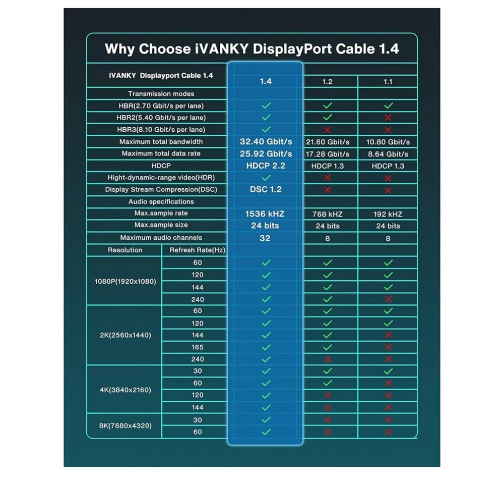 The IVANKY 8K DisplayPort Cable 1.4 is a high-quality, long DP cable that supports 8K resolution at 60Hz, 4K resolution at 144Hz, and 1080P resolution at 240Hz. It features a sleek black design and a length of 20 feet, making it ideal for connecting various devices for a seamless viewing experience. With a 30-day money-back guarantee and free fast shipping, this cable offers convenience and peace of mind for all your video needs. Box was opened but cable is brand new