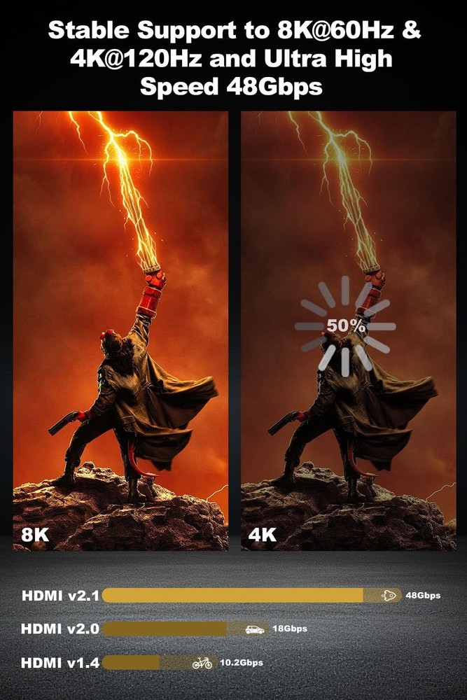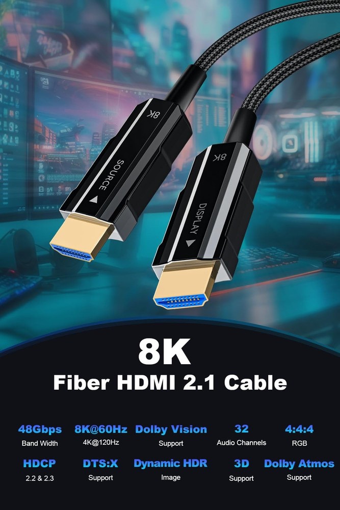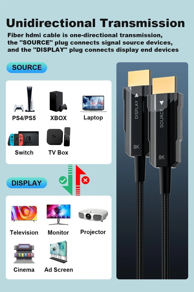 8K Long HDMI 2.1 Cable 66ft, Fiber Optic Braided Cord, High 66ft/20m Product Details Package Dimensions : 8.9 x 8.82 x 2.04 inches; 1.33 Pounds Manufacturer : AST Brand: RUBMUD Connector Type: HDMI Cable Type: HDMI Compatible Devices: DVD Player, Gaming Console, Laptop, Monitor, Projector Special Feature: Braided, Data Transfer, High Speed 8K Fiber HDMI 2.1 Cable -- HDMI cable 66ft supports High-speed 48Gbps, 8K@60Hz, 4K@120Hz, 2K@240Hz, Dynamic HDR, Dolby Vision, Dolby Atmos, HDCP 2.2&2.3, 3D, 32 Audio Channels, 4:4:4 RGB, ALLM, QFT, QMS, VRR, DSC etc. Backward compatible with version 2.0 / 1.4 / 1.2 / 1.1. Slim & Flexible Fiber HDMI Cable -- Compared with traditional copper core cables, they have a greater bandwidth, faster speed, less signal attenuation, greater resistance to electromagnetic interference, are slimmer and more flexible, have a stronger bending strength, and a longer service life, which is the development direction of future cables. Long Distance Lossless Transmission -- Fiber optic hdmi cable can achieve lossless transmission, the longest transmission distance of up to 300m. Copper hdmi cord can't reach 18Gbps for more than 50 feet, while fiber hdmi cables can reach and without signal loss. Unidirectional Transmission -- Fiber optic hdmi cable is one-directional transmission. The plugs at each end are marked "SOURCE" and "DISPLAY". The "SOURCE" plug connects signal source devices such as TV Box, PS5, PS4, PS3, Blu-ray Players, Xbox Series, Laptop etc. The "DISPLAY" plug connects display end devices such as TV, Displays, Projector, Moniter etc. Please make sure you plug in each end correctly, you will not get signal from the device. High Quality HDMI Braided Cord-- The long hdmi cable feature gold-plated connectors to prevent oxidation and are protected by a zinc alloy housing. Nylon braided sheath and curved tail design, can withstand up to 25,000 bends, greatly extended use life. Superior Gaming Experience -- Compared to 4K hdmi cable, 8K hdmi cable deliver HD audio and the highest audio quality. It also support variable refresh rate (VRR), which solves the problem of freezing and tearing of the picture for smoother gaming. Compatible with HDMI Devices -- For set-top boxes, video games (ps3/ps4/ps5), blu-ray dvd players, xbox series, uhd tv, 4k hdtv, digital audio, various inch monitors, computer, projector, av receiver and other hdmi-enabled device. Easy to Use -- Plug and play, no extra power supply. High speed hdmi cable can be used in a variety of applications such as home theater systems, gaming consoles, audio equipment, as well as conference rooms and commercial venues.