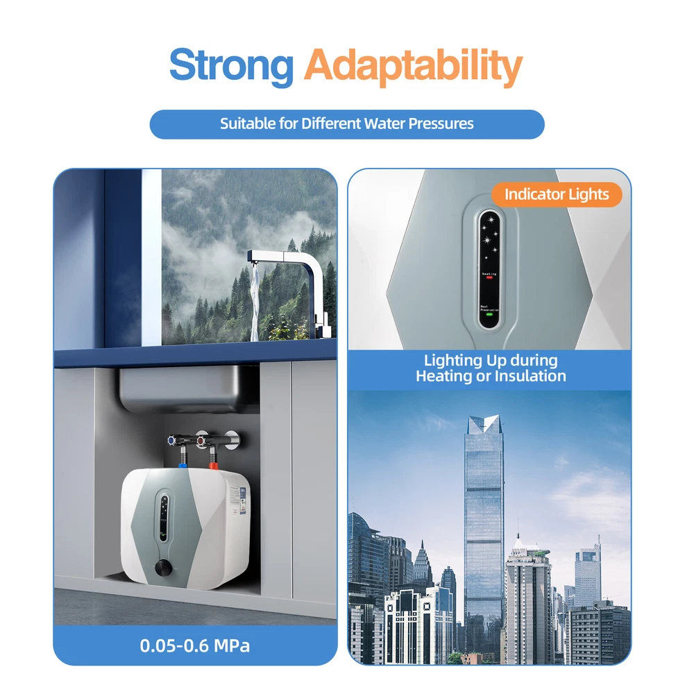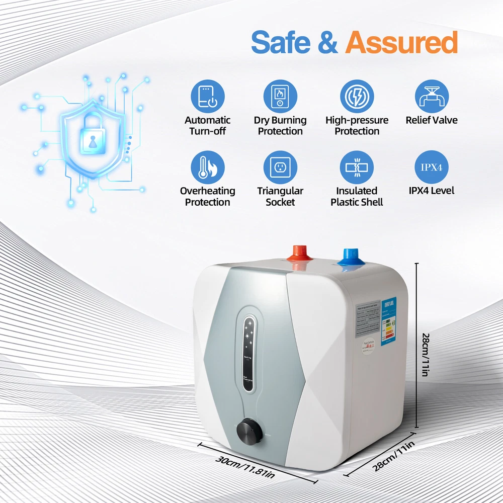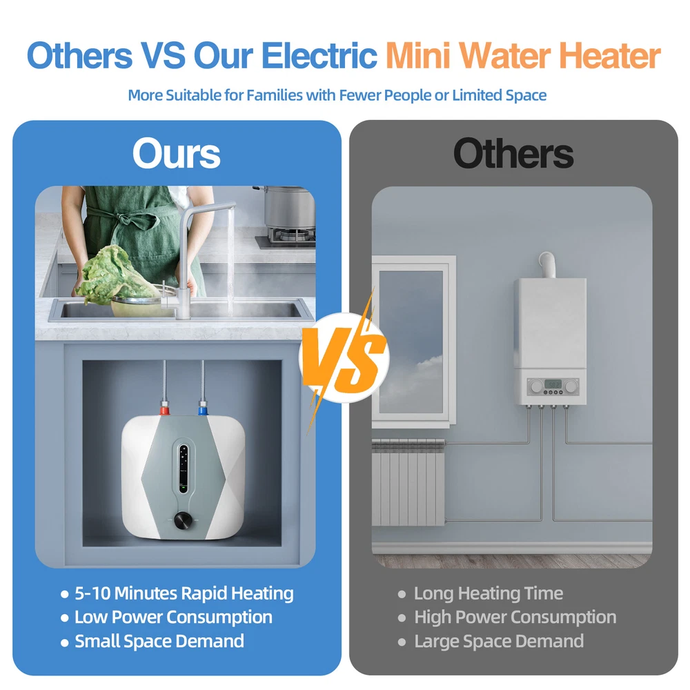 Package Included 1*Electric Water Heater 1*Safety Valve 1*Exhaust Pipe 1*Engliah Manual All Accessories for Assembly 8L 1500W Under Sink Electric Instant Hot Water Heater Mini Small Water Tank 8l 1500w Under Sink Electric Instant Hot Water Heater Mini Small Water Tank Application It Is Very Suitable for Installation in Small Residential Areas, Garages, Sinks, Kitchens, Apartments, Bathrooms, and Other Areas That Require Hot Water but Have Limited Space. Specifications Material: Plastic, Stainless Steel, 316l Stainless Steel Color: White Shape: Rectangle Plug: Us Standard Assembly Required: Yes Power Source: Corded Electric Water Onlet Mode: Upper Water Onlet Power: 1500w Capacity: 8l/2.11gal Voltage: 110v Waterproof Grade: Ipx4 Applicable Water Pressure: 0.05-0.6mpa Heating Time: 8-15 Minutes Temperature Adjustment Range: 30-65 ℃/86-149 ° F Power Cord Length: 81cm/31.88in Exhaust Pipe Length: 59cm/23.22in Gross Weight: 4.1kg/9lbs Net Weight: 3.35kg/7.38lbs Product Size: 30*28*28cm/11.81*11*11in Package Size: 38*34.5*34cm/14.9*13.58*13.38in Package Included 1*Electric Water Heater 1*Safety Valve 1*Exhaust Pipe 1*Engliah Manual All Accessories for Assembly Description Do You Live in a Place with Limited Space and Worry About Insufficient Hot Water Supply? We Have a Good Solution to Such Problems! This Electric Water Heater Can Quickly Heat Water in 8-15 Minutes and Has Good Safety, Allowing You to Enjoy a Continuous Supply of Hot Water in a Limited Space. It Can Make Your Daily Washing and Cleaning Activities Warmer, Making Your Winter No Longer Cold. Key Features Highly Efficient: with the Joint Efforts of 1500w Power and Fast Thermal Conductivity Heating Pipe, It Can Provide You with Uninterrupted Hot Water Within 8-15 Minutes, Easily Meeting Your Daily Hot Water Needs. Thermal Insulation: with the Polyurethane Foam Tier Combined with Seamless Stainless Steel Lining, the Hot Water Output Rate Reaches 80%, Which Can Provide an Excellent Thermal Insulation Effect and Better save Unnecessary Power Consumption for You. Large Capacity & Mini Size: Its Size Is Very Small(11.81*11*11in), but Its Capacity Can Reach 2.1 Gallons. You Can Easily Install It on Walls or Floors Under Sinks or in Other Small Spaces to Meet Your Hot Water Supply Needs. Adjustable Temperature: the Heating Temperature Can Be Freely Adjusted Between 86-149 ° F Using a Knob. Low Temperature Can Be Used for Daily Washing, Medium Temperature Can Be Used for Washing Vegetables, and High Temperature Can Be Used to Connect to the Dishwasher, Providing More Convenience for Your Life. High Safety: When the Set Temperature Is Reached, the Power Will Automatically Turn off. It Also Adopts Various Protective Measures, Such As Dry Burning Protection, Overheating Protection, High-pressure Protection and a Three-pin Plug. in Addition, Its Ipx4 Waterproof Rating Can Effectively Protect You and Your Family. Easy to Operate: It Supports Automatic Insulation, Automatic Cold Water Replenishment, and Power Outage Memory Functions. You Only Need to Control the Temperature Through a Knob, Which Is Easy to Operate Even for the Elderly and Children. Good Material: the Inner Liner Is Made of Stainless Steel, Which Is Pressure-resistant and Explosion-proof. the 316l Stainless Steel Heating Tube Has Good Thermal Conductivity and Can Accelerate the Heating Process. Strong Adaptability: It Is Suitable for Different Water Pressures (0.05-0.6 Mpa) in Different Regions and Can Also Be Used for High-rise Residential Buildings. You Don't Have to Worry About Water Pressure Issues Affecting Your Use. Protective Packaging: This Product Comes in a Custom Foam That Resists Common Compression and Falls to Prevent Product Damage in Transit As Much As Possible. Details Rounded Corners: the Entire Body Adopts a Cute Rounded Design to Avoid Unnecessary Scratches. Indicator Lights: They Light up During Heating or Insulation, Making It Easy for You to Track Their Operation. Notes Please Carefully Read the Manual and Strictly Follow the Precautions to Have a Better Experience. Please Note That This Product Can Only Be Installed Vertically. It Is Recommended to Install It Below the Water Tank. For Your Safety, Please Connect All Wires Correctly and Do Not Use Mobile Sockets. When Using It for the First Time, Please Fill It with Water Before Turning on the Power. It Is Recommended to Reserve 3.93in More Installation Space than the Product Size. Please Note That the Connecting Pipes Between the Water Supply Pipeline and the Water Heater Must Be All Metal Pipes, Not Plastic Pipes. When Not in Use for a Long Time (over 24 Hours), Please Turn off the Water Supply and Disconnect the Power Supply. Please Allow the Slight Color Difference Caused by the Shooting Light and 1-3cm Error Due to Manual Measurement, and Make Sure You Do Not Mind Before You Order. Welcome to ryx20000 . If you have any questions, please feel free to consult. I will answer them within 24 hours. I wish you a pleasant shopping experience. Payment Delivery details Terms of sales About us Contact us Payment We accept ebay payment 。 Fees such as import duties, taxes are not included in the item price or shipping costs. These charges are the buyer's responsibility. Delivery details Shipping: 2-9 working days to: USA Terms of sales We maintain high standards of excellence and strive for hundred percent customer satisfaction. Feedback is very important to us. We hope that you contact us immediately before you give neutral or negative feedback, so that we can address your concerns. It is impossible to address issues if we do not know about them! About us Your satis faction is our ultimate goal. We work hard to earn your trust and future business. Our certified technicians have tested each item before shipping. The unit comes with 1 year limited warranty on all manufacturing defects. a) If you receive a defective item, you may return it or ask for a discount. Please contact us within 14 days after you receiv