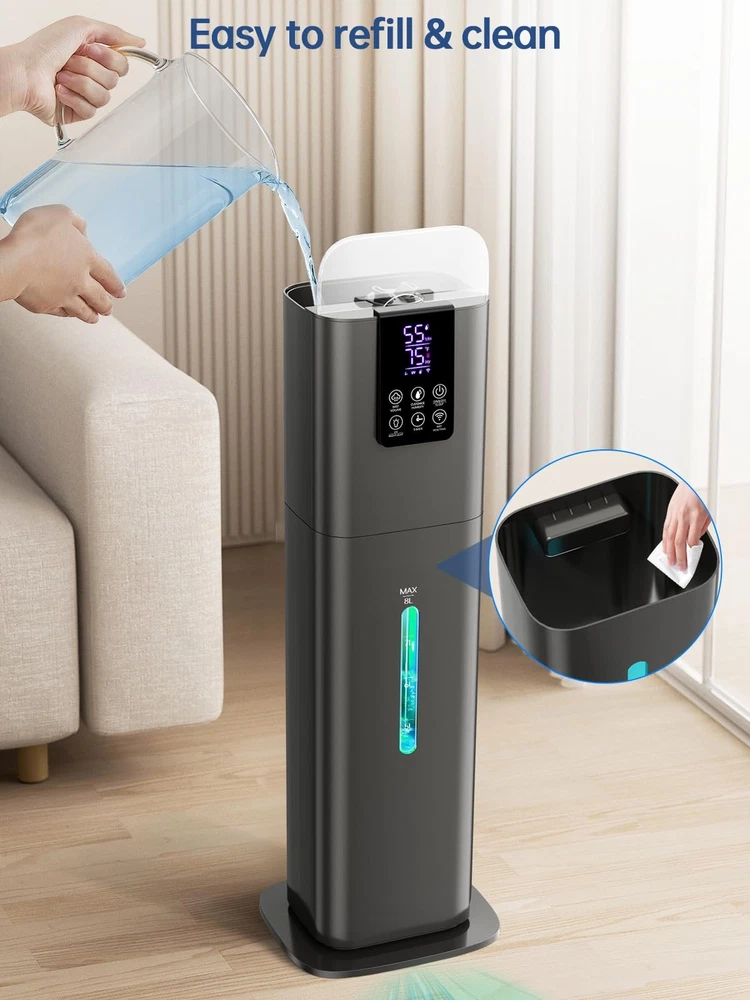 Smart Humidifiers for Bedroom Large Room Smart App Control: Manage your humidifier anywhere with the free Tuya app. Turn it on/off, set custom humidity levels, adjust mist output, use timers, schedule runs, and control the night light - all from your phone. ใ๐ฎ.๐ญ๐๐ฎ๐น ๐๐ฎ๐ฟ๐ด๐ฒ ๐๐ฎ๐ฝ๐ฎ๐ฐ๐ถ๐๐ & ๐ฆ๐ฝ๐ฎ๐ฐ๐ฒ-๐๐ฎ๐๐ถ๐ป๐ดใThis large humidifier features a spacious 8L water tank that enables a robust mist output of 350ml/h, capable of running continuously for up to 40 hours on a single refill. Unlike other desktop humidifiers that take up space on your desk or bedside table and are prone to tipping over, the floor-standing humidifier (8.6 ร 7.4 ร 25.1 IN) can easily be placed in any bedroom, office, large room, or living room, reducing clutter. ใ๐ฃ๐ฟ๐ฒ๐๐ฒ๐ ๐๐๐บ๐ถ๐ฑ๐ถ๐๐ ๐ ๐ผ๐ฑ๐ฒ&๐ฏ ๐ ๐ถ๐๐ ๐๐ฒ๐๐ฒ๐นใAdvanced sensors adjust humidity levels to maintain a consistent and healthy environment. You can customize the humidity level to your liking (up to a maximum of 90% RH), and the humidifier will automatically activate or deactivate to maintain the set humidity, catering to your personalized humidification requirements. The large humidifier has 3 levels of mist volume. The maximum mist volume is suitable for a space of 505 square feet. ใ๐ค๐๐ถ๐ฒ๐๐ฒ๐ฟ ๐ง๐ต๐ฎ๐ป ๐๐๐ฒ๐ฟ ๐๐บ๐ฎ๐ด๐ถ๐ป๐ฒ๐ฑใThis cool mist humidifier operates with a noise level as low as 35dB in sleep mode. It can create a tranquil and relaxing bedroom environment while providing reliable air humidification effects. Enjoy fresher air while sleeping without interruption. Equipped with a user-friendly touch screen and remote control, it's effortlessly operable for users of all ages. ใ๐๐ฟ๐ผ๐บ๐ฎ๐๐ต๐ฒ๐ฟ๐ฎ๐ฝ๐ & ๐๐บ๐ฏ๐ถ๐ฒ๐ป๐ ๐๐ถ๐ด๐ต๐ใThis air humidifier has a built-in aromatherapy function, with a fragrance pad placed on the back of the humidifier to add 4-5 drops of your favorite essential oil. Combine air humidification with a pleasant fragrance to elevate your home to more comfortable and peaceful levels. The bedroom humidifier comes with ambient light in various colors. It automatically changes color in the form of a breathing light. ใ๐ฃ๐ฟ๐ฎ๐ฐ๐๐ถ๐ฐ๐ฎ๐น ๐ฎ๐ป๐ฑ ๐ฆ๐๐๐น๐ถ๐๐ตใThe large humidifier features a clear window and scale lines for convenient water level checks and refills. Safety is paramount for , as it includes an automatic shut-off function that triggers when the water is low, ensuring peace of mind even if you overlook refilling it. Both practical and aesthetically pleasing, it is a great gift for seniors, Mother's Day, and Father's Day. ใ๐ช๐ต๐ฎ๐ ๐ถ๐ป ๐๐ต๐ฒ ๐๐ผ๐ ใSmart Humidifier*1, Remote*1, User Manual *1. Please Note: "Download our app via Google Play, Apple Store, or scan the QR code on the manual and instruction manuals. Our customer service team is available around the clock and committed to resolving any issues within 48 hours, prioritizing your satisfaction and peace of mind.