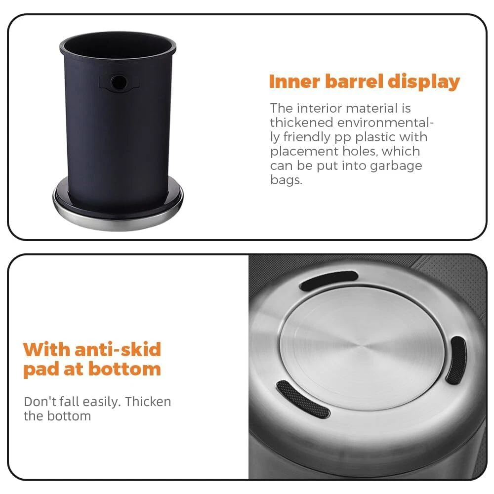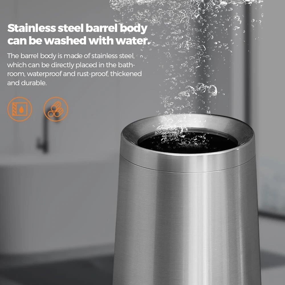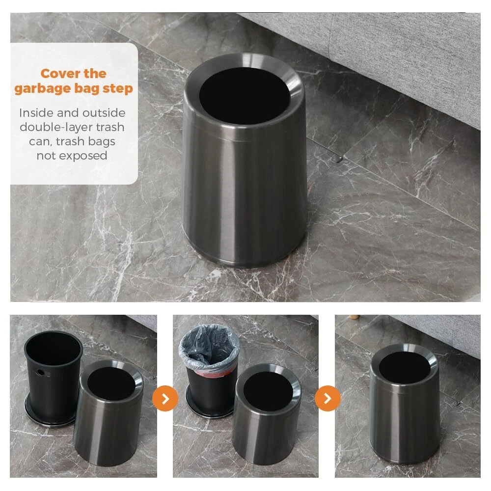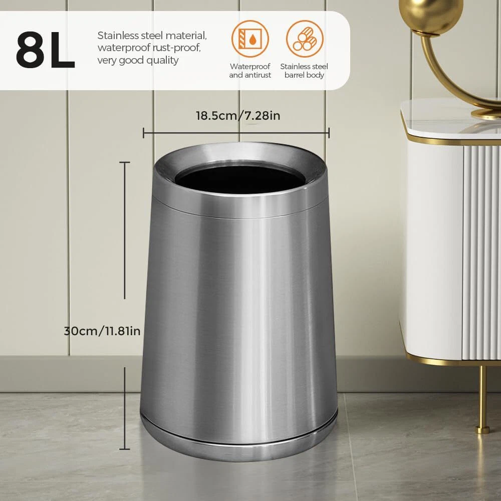 【Appearance and material】 This stainless steel trash can is gold, thick and will last a long time. Stainless steel gold is beautiful, suitable for elegant decoration 【Small capacity】 2.1 gallons /8L Small capacity gold trash can ,Comes with plastic inner bucket, suitable for office or bathroom use 【Open Top Trash Can】 Very convenient and fast The living room garbage can without the lid is easy to use, no need to open the lid. Very convenient and fast 【Usage scenario】: This metal silver trash can is suitable for high-end decoration scenes, bathrooms, kitchens, living rooms, high-end hotels, guesthouses, offices. 【Unique shape】Unique conical design, heavy bottom, avoid trash can dumping. The small opening at the top allows our vision to see the beautiful trash bin instead of the garbage, truly a perfect bathroom trash can 【Promise 】 Your 100% satisfaction is assured and backed by a Full-Service Manufacturer's Promise including Parts and Dedicated Customer Support.