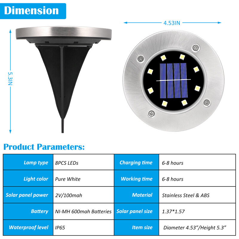 Color: Black+silver MPN: Does not apply Color Temperature: 5600 - 6400 K Daylight/Cold Installation Area: Outdoor Working time: 8-10 hours Sensor Type: Light Type: Pathway Charging time: 6-8 hours Material: ABS, Stainless Steel Solar panel: 2V 130MA Battery: 800MAH NI-MH Size: 13.5*11.5cm Features: Waterproof, Energy Efficient, Dusk-to-Dawn, Energy Saving, Even Lighting, Weather Resistant Bulb Type: LED gtin13: Does not apply IP Rating: IP65 Light Color: White Lighting Technology: LED UPC: Does not apply Mounting: Ground Brand: MUCH LED Quantity: 8 LED Power Source: Solar