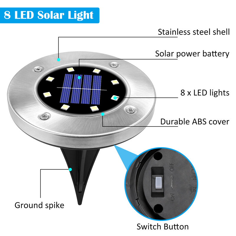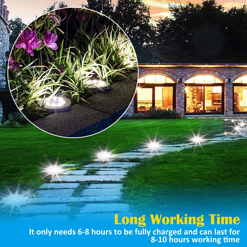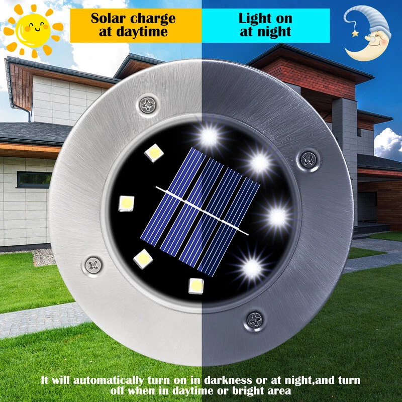 8LED Outdoor Disc Flat In-Ground Solar Garden Buried Light Garden mark Lights FEATURE: * Unique appearance design: Perfect for Outdoor Landscape, Walkway, Lawn, Steps Decks, Pathway Yard Stairs Fences and etc. * Solar powered & Environmentally friendly: No electricity cost, 6-8 hours charging during the day. * Intelligent light control sensor: Adopt light sensor system, automatically turn off the lights during the day to charge, and automatically turn on the lights at night. * Large-capacity battery: Built-in 800mAH battery can last for 8-10 hours when fully charged, and it can be charged for 6-8 hours during the day. It can last up to 8-10 hours. * Professional IP65 waterproof protection level: Suitable for outdoor use and outdoor lighting .Excellent waterproof standards can still work for 1-2 days in rainy seasons. * The lamp housing is made of stainless steel: Waterproof and rust-proof. * Easy to install and replace: Equipped with ground Spikes, wireless design. SPECIFICATION: Material: Stainless steel and ABS Continuous lighting time: 36 hours or more Waterproof level: IP65 Light source type: LED Rated power: 2 (W) Voltage: 1.2 (V) Life: 10000 (h) Size:Diameter:11.5cm/4.53inch,Height:13.5cm/5.3inch Solar panel: 2V 130mA Battery type: NI-MH(including) Battery capacity: 1.2 V 800mAH Light color: pure white Housing color:black+silver Working temperature: -10°C-40°C Protection level: IP65 Service life: 10,000 hours PACKAGE INCLUDING: 1 x Solar Lawn lights 2 x Spikes Payment Delivery details Terms of sales About us Contact us Payment Payments: Paypal, Google Pay, Visa, Master Card, Amerian Express, Discover. Delivery details All items are shipped from US warehouse located at NJ . We ship to your eBay or Paypal address. Please make sure your eBay or Paypal address is correct before you pay. Terms of sales Free return About us Pls contact our customer service firstly if have any problems , we will help to solve the issue, and could offer free return service for full refund or free replacement after confirming. You can buy from us with confidence Contact us If have any problems, please feel free to contact us.