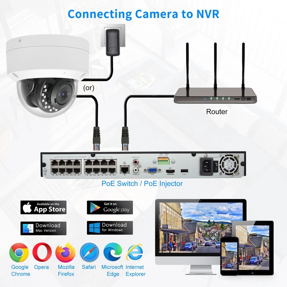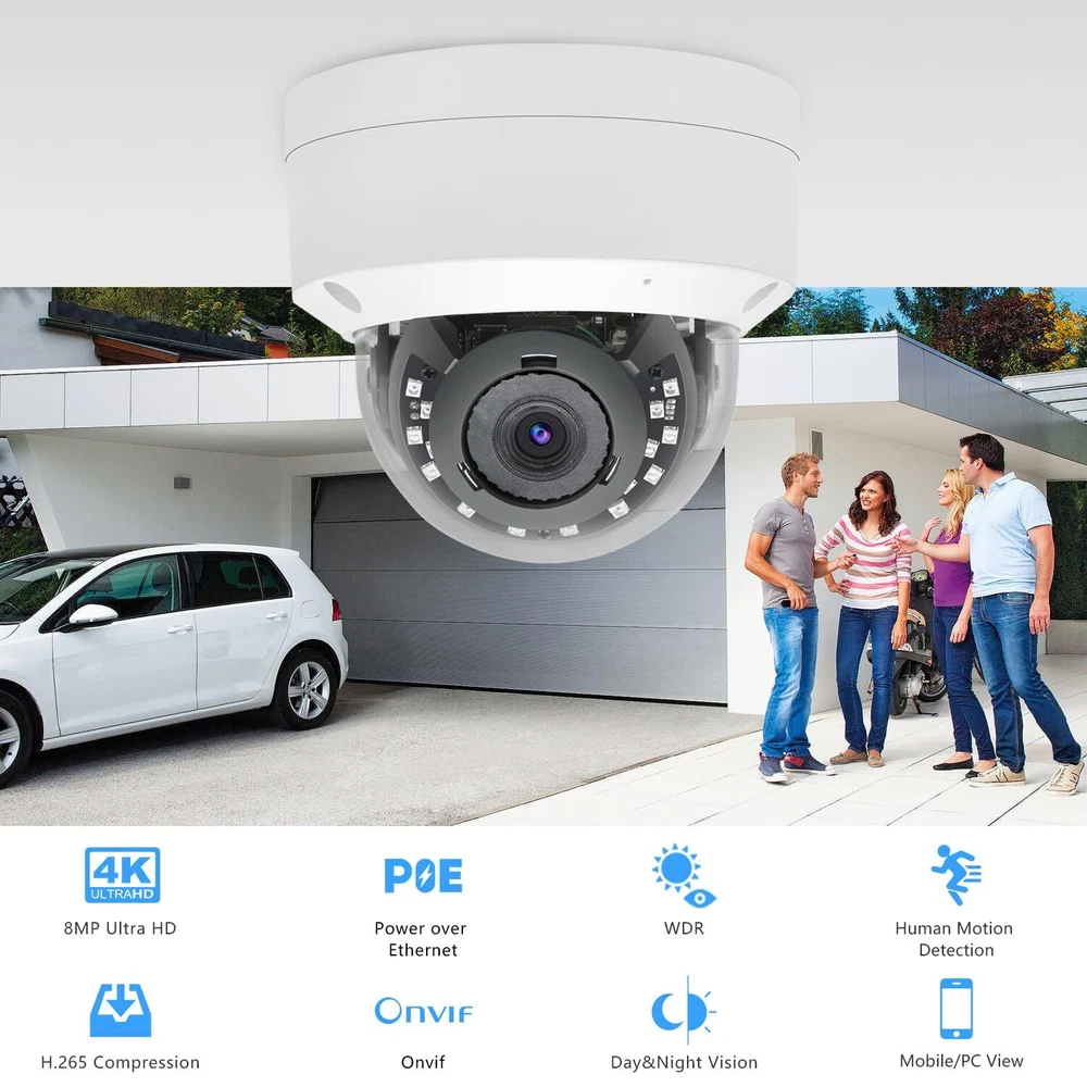 【4K 8MP ULTRA HD+POE+2.8MM LENS】This PoE ip dome camera has equipped with 8Megapixel (3840x2160) Ultra high definition and 2.8mm lens, which can provides you a more clear image than 5mp/6mp/full HD 1080p cameras. With PoE (Power over Ethernet) function, you can use a single Ethernet cable to transmit both data and power, and no need power adapter( PoE switch/PoE Injector required, not included). 【H.265/H.264 AND COMPATIBLE WITH NVRs】This 4k 8mp ip network PoE camera supports H.265/H.264 dual compression(Default H.265) and compatible with multiple 4K H.265/H.264 PoE NVRs and compatible with QNAP, NAS, FTP, Blue Iris and Ispy; Plug&play with Hikvision,LTS, EZVIZ, Dahua, Uniview, TVT and Raysharp NVRs after DHCP enable.(Default DHCP enable). SDK for our IP cameras could be provided for profesional customers. 【IP66+VANDAL PROOF+80FT NIGHT VISION】This 4k 8mp PoE ip security camera has designed with microphone, the case of camera is made of metal, special design with IP66 waterproof level and is very convenient for installation. Besides, this camera adopts IR LEDs providing excellent night-vision up to 80 ft. 【HUMAN AND MOTION DETECTION】The 4k 8mp vandal dome ip camera support human motion detection, when the camera detects person, they will be marked in square, and this camera can provides 105°wide viewing angle for more information. 【AFTER SALES SERVICE】We provide 1 year warranty for this 4k 8mp ip PoE camera, and if you have any problem about our vandal dome security ip camera, please contact us or leave your question for us.