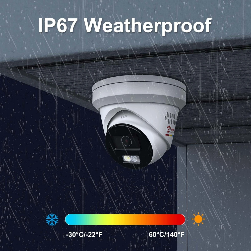8MP PoE Camera with Active Deterrence: 8mp ip camera provides ultra HD images with a resolution of 3840x2160. Update with advanced active deterrent feature, when the poe ip camera detects people or vehicles, the speaker and light alarm will be triggered: flashing white light and warning sounds from the speaker help deter unwanted individuals. Human/Vehicle Detection and Smart Alerts: This 4k ip camera utilizes AI technology for precise human and vehicle detection, reducing false alarms. You can receive notifications with human or vehicle alerts and enjoy two-way audio capabilities, help you make real time talk with anyone near the turret poe camera. Enhanced Night Vision and Compression Technology: Experience clear imaging in low-light conditions with F1.6 super wide aperture of this 8mp poe security camera. The H.265+ coding technology allows for efficient video compression, maximizing storage capacity. A perfect choice for outdoor use, this 8mp ip security camera has metal housing and IP67 waterproof rating. Easy Installation and Remote Access: With advanced PoE technology, you can easily use only an ethernet cable to power and transmit data, meantime, with 6×6×5.7 inches and 1.8lb weight, this poe turret camera can easily installed in indoor and outdoor. Connect to NVR or compatible third-party NVR/DVR for smooth use. With the ability to support remote access, you can monitor your property from anywhere anytime. Ideal for both indoor and outdoor surveillance applications. Enables continuous protection: Ensure the safety of your premises with 8mp poe camera featuring a wide range of advanced security features. From intelligent person/vehicle detection to active deterrent alarm, this 8mp camera keeps your property secure round the clock. Moreover, this 8mp poe ip camera supports up to 512GB SD card storage for continuous monitoring and protection, help you less storage worry.( 512GB SD Card is not included)