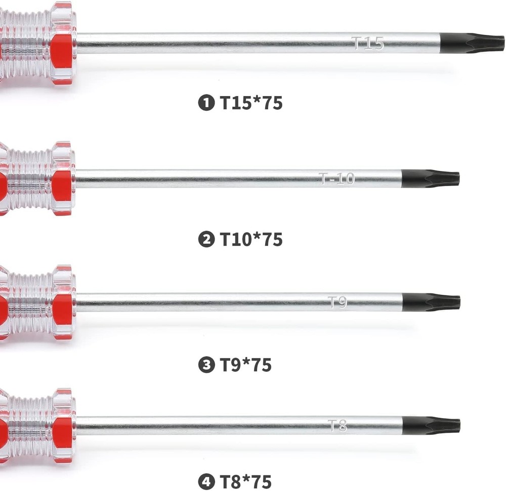 Piutouyar 8PCS Magnetic Torx Screwdrivers Set Security Screwdriver T8 T9 T15 T15 Size:T8,T9,T10,T15 Number of Items: 8 Head Style: Torx Material: Chrome Vanadium Steel Color Silver What You Will Get:T8, T9, T10, T15 Torx Head Magnetic Screwdriver(2 of each size),torx diameter :3mm/5mm;security hole:1mm/2mm Sturdy:Black finish blade with magnetic tips which could conveniently attracts screws, The hole in the center in each bit causes it to be tamper resistance, Chrome vanadium steel with heat treatment, high hardness and good toughness and resistance Wide Application:Ergonomic handle for a comfortable and non-slip grip,Widely used in electronic repair, computer hard drive or mobile phone repair Easy to Use - The handle is coded with size for easy identification. With magnetic, can be operated efficiently Return Policy: We offer a 30 day return policy from the receiving date. Please contact us for a Free Return Label. Please use our return label so it will go back to our supplier and we can do a refund or replacement afterwards. Feedback: Your satisfaction is very important to us! If you have any problem with your order, please contact us and we will do our very best to make you satisfied. As long as you are happy with your purchase, please leave a positive feedback for us. We will always leave you a positive feedback in return. If you have any problem with your purchase, please do not leave a negative feedback. Please Contact us ... and your issue will be solved quickly and positively We are a small family-owned business trying to make a living, not a huge company that does not care ... We will ALWAYS do our best for you!