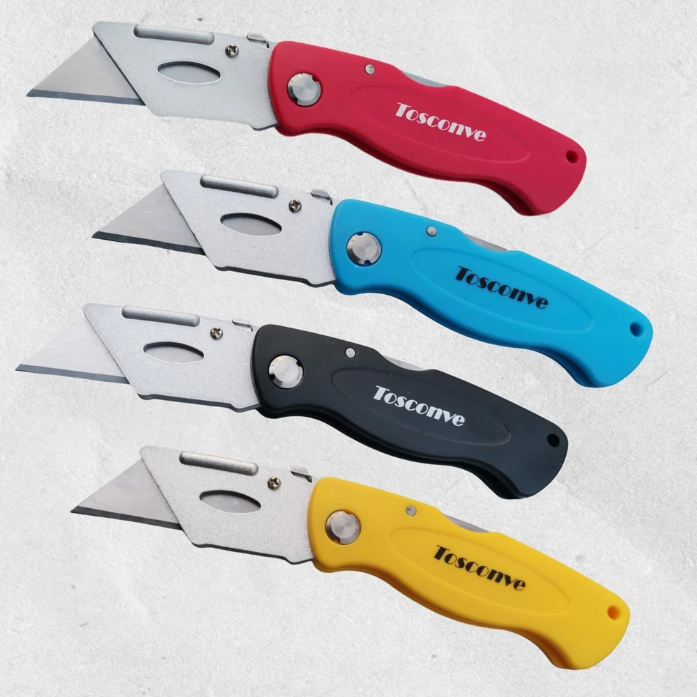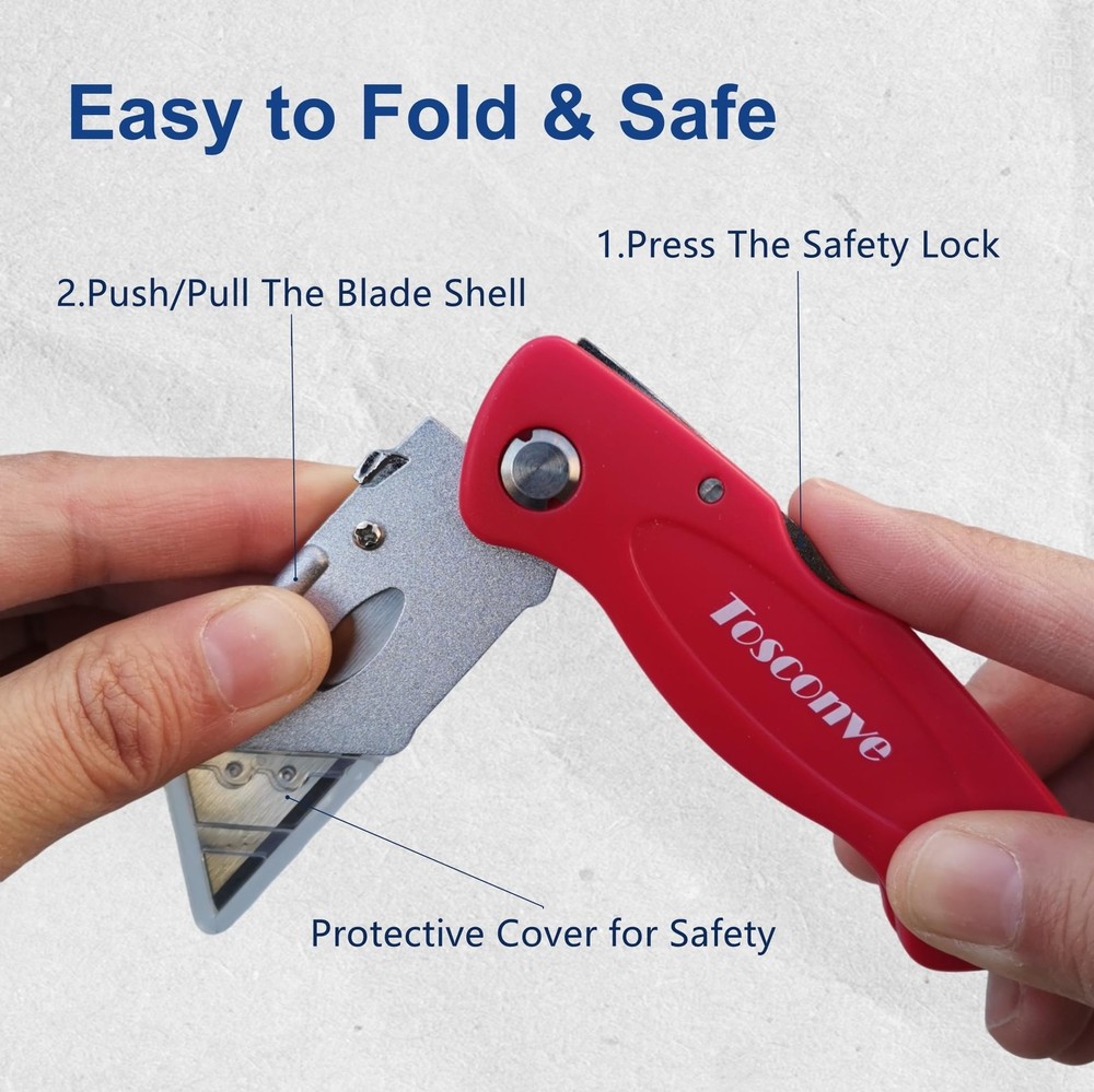 The mini box cutter is compact and foldable, measuring only 4.0 inches * 1.6 inches when folded, making it easy to carry around.When you need to go out, the small box cutter is definitely a good choice, you can put it in your pocket.This is also a good razor knife utility. It comes with 8 pack of box cutters retractable heavy duty (red/yellow/black/blue) and extra 30 replaceable blades, which are enough for a long time. Blades are made of steel for high hardness and sharpness.The blades are very sharp and ensure smooth cutting of different materials. Press the silver button on the Aluminum alloy shell to replace blades for the retractable box cutter knife. When replacing the blades, you need to handle it carefully to avoid cuts. The blade has a plastic protective cover. The ergonomic plastic handle provides a firm, comfortable grip and reduces hand fatigue during prolonged use. Pull the knife sheath away from the handle to open the folding utility knife folding. The folding knife locks automatically when unfolded. The self-locking mechanism ensures that you never have to worry about the box cutter folding or slipping while cutting.Press the folding button on the back of the handle to close the box opener cutter.This is a good razor knife utility and box knife. Our box cutters knives for heavy duty is widely used in homes, offices, warehouse and yards for cutting plastic sheets, boxes, cartons, rope, carpet, cloth, bags, leather, wallpaper and more. With our razor utility knife, cutting will be easy and efficient. Economical & Practical Folding Utility Knife - Comes with 8 folding box cutters (red, yellow, black, blue) and extra 30 blades.The back-lock mechanism ensures that you never have to worry about the utility knife folding or slipping while cutting with the box cutter knife Extra 30 Blades & Tough Tools - Our razor blade utility knife comes with extra 30 replaceable blades for longer use. Easy blade change design allows you to safely and quickly change the razor knife blades for our folding razor knife, no screwdriver required.The handle made of tough plastic makes it a sturdy and lightweight blade cutter. Besides, the blade has a plastic protective cover for safety 4 Color Box Cutter Pack - 4 bright colors (red, yellow, black, blue) for different purposes and easy to find. You can even leave one folding razor knife in every room or place you need it for easy access. Great gifts for the one you loved with frequent cutting needs Foldable & Portable Design – The compact size (4 inches when folded) makes it a great choice when carrying a utility knife on the go, and more convenient than normal retractable box cutter. The lightweight plastic handle provides a firm, comfortable grip and reduces hand fatigue during prolonged use Ready for Multi Purpose -Our utility knife for heavy duty is widely used in homes, offices, warehouse and yards for cutting plastic sheets, boxes, cartons, rope, carpet, cloth, bags, leather, wallpaper and more. With our razor utility knife, cutting will be easy and efficient