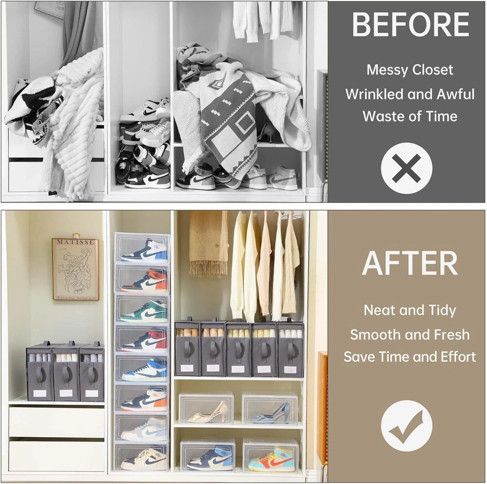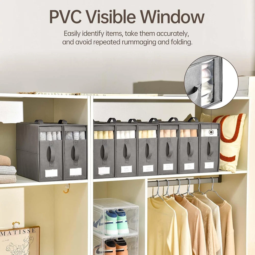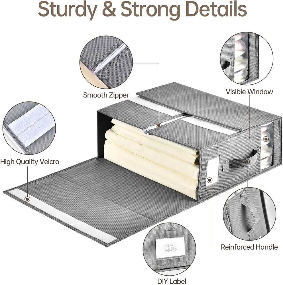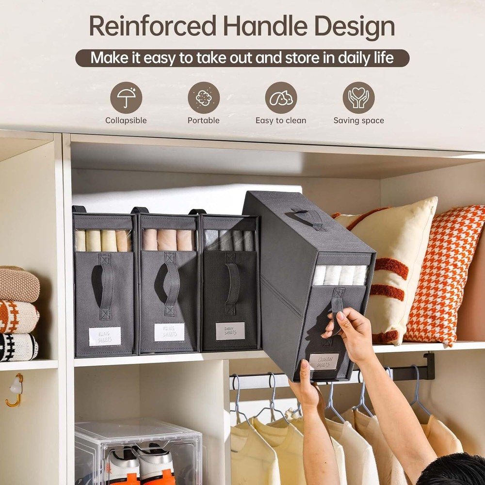 【Visible Window and Label Design】 linen closet organizers and storages is designed as a transparent window composed of PVC material, with removable tabs on the sheet storage for closet, you can clearly and quickly see the color and pattern of the fabric inside, without having to open the each sheet organizer, which will save you a lot of time. 【Strong & Sturdy Fabric】 The bed sheet organizers and storage are made of high-quality non-woven fabric, which is strong and sturdy. and sheets storage with breathable fabric to keep your items clean, neat, and orderly. reinforced cardboard keeps the bedding storage keep good shape, and won't be bent and deformed even after a long time of use. 【 Multifunctional Sheet Storage Organizer】 Our bed sheet organizer can not only help you organize your bedding but also serve as an under-bed storage container to organize, storage for sheets and blankets can store sheets, pillowcases, duvet covers, sofa covers, and bed curtains. Cube shape, suitable for storage in storage cabinets, drawers, wardrobes, and storage shelves, meets all your storage needs. 【Easy to Fold and Use】 With a foldable design, The sheet organizers and storage can be folded to a 1-inch thickness when not in use, making storage for sheets easy to carry and store. Keep your linen closet neat. In addition, the 2 handles on each sheets organizer for linen closet are convenient for taking out and storing in daily life, and it is very convenient to use. 【Save Time and Space】 Each sheet storage size 16*12*6inch, fits most closets and shelves. These 8-pack bed sheet organizers keep your linen closet organized. our foldable linen closet storage is easy to use, efficient sheet organizer that saves time and effort by avoiding repeated folding and prolonged rummage. Sturdy bedding organizer storage can be stacked to save space. Material Fabric Color Grey Product Dimensions 16"L x 13"W x 6"H Special Feature Stackable, Foldable Recommended Uses For Product For storage, Bed sheets Closure Type Zipper Shape Square Number of Items 8 Size 8 Pack Number of Sets 8 Item Weight 11.64 pounds On Feb 11, 2025 at 18:59:57 PST, seller added the following information: