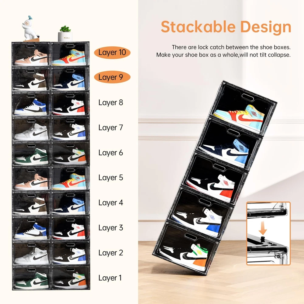 [Transparent New Style Display Design] The clear shoe boxes designed with transparent characteristic,you can quickly choose the shoes which you want at a glance.The Black shoe organizer is also equipped with clear door. Therefore,our shoe display case can be extensively used in entryway,bedroom and closet. [Extra Large Capacity]13.4’’L*10.6”W*8.3”H-The upgraded large shoe display boxes are suitable for US shoe size up to 14,which designed with a larger storage capacity.So don’t worry about the shoe boxes space. The shoe display case can keep your messy shoes well organized.which is suitable for many types of shoes such as boots, leisure, sneakers and high heels. [New Stackable Design & Space Saving]Our shoe storage boxes are equipped with new stackable design,Which you can stack them by placing them directly.In addition,the stackable function can keep the shoe boxes whole very firmly and can be Multi-layered Stacked.And each stackable shoe bins can stay sturdy and easy to carry when integrated. [Magnetic Door and Easy to Open with Single Hand]The shoe storage boxes have built-in magnetic function.The door can be easily opened and closed by the upgraded magnetic suction.In addition,we set vents in the door.Our stackable shoe box has excellent breathability to prevent the accumulation of odor. [Sturdy Material] The shoe organizer is made of sturdy plastic. The stackable shoe boxes can effectively prevent dust from entering in.Easy daily care – clean with mild soap and water.