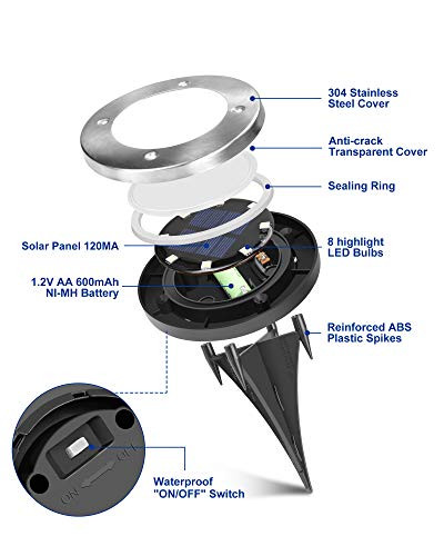 30 Days Return Policy Fast Delivery Trusted seller 8 Pack Solar Ground Lights, Waterproof Solar Lights Outdoor Garden Decor, Disk Solar Deck Lights, Landscape Lighting for Patio Pathway Yard,Outdoor Lights (Cold White) Product Description SOLAR POWERED BRIGHT LIGHT - 8 highlight LED in each solar disk light makes Solar Ground Lights are brighter than other solar lights. Equipped with improved solar panel 120mA, which is better than most others with 100mA on the market, and a built-in 600 mAh Ni-MH rechargeable battery, during the day the solar panel converts sunlight into electricity, at night lights are powered by the battery using the electricity stored SMART AUTOMATIC ON AND OFF - Push button to ON switch for the first use, the smart garden lights will automatically turn on in the dark or at night and turn off in bright area or at dawn, greatly saving energy, typically illuminate for 8-10 hours with full day charging (6-8 hours) (Charging and working time will change depending on the weather, season and location conditions) EASY TO INSTALL, WIRELESS - Only seconds to install, no additional cables, wires, tools required, place two spikes together, insert the spikes into the bottom of the light, push the spikes into the soil in a sunny location; You can also put it on the deck or stairs without spikes WATERPROOF, SAFE AND DURABLE DESIGN - IP65 high level waterproof, 304 stainless steel cover with sealing ring and 4 screws fixed, upgraded anti-crack transparent lamp shade, reinforced ABS plastic spikes, all the modern materials make the solar disk lights are suitable for outside use in inclement weather, no need to worry about heavy rain, snow, frost, etc. As the disk lights are strong enough to withstand weight or more than 100kg, it's safe for children and pets to play on the grass SUITABLE FOR ANY PLACE YOU LIKE,BRIGHTEN UP YOUR LIFE - As outdoor lighting products, the Solar Ground Lights can be used to decorate your house, provide perfect lighting for your garden, backyard, lawn, flowerbeds, sidewalk, steps, deck, corridor, swimming pool, or to be the boundary of a walkway and driveway from dusk to dawn. It's also portable and can be used as a camping solar light. Pleg brilliance adds a beautiful scene for the night view Shipping Returns Payment Shipping Shipping is FREE to all addresses other than APO/PO boxes in the lower 48 states. All our stock ships from US-based warehouses. Shipped via USPS or UPS (depending on location and package weight) Unless stated otherwise, all orders will ship within 24-72 hours of your payment being processed. Check our feedback to see the great reviews of FAST shipping we offer. Returns As our valued customer, we will do our best to make sure the product you receive arrives to you on time and as expected. If you are not satisfied with your purchase, please contact us within 30 days of receiving your order to process a return. Payment We currently accept payment via eBay managed payments only. Once payment is cleared, we will dispatch your shipment within 1-3 business days. Please refer to the "Shipping" tab for more information regarding shipping speed to your destination.