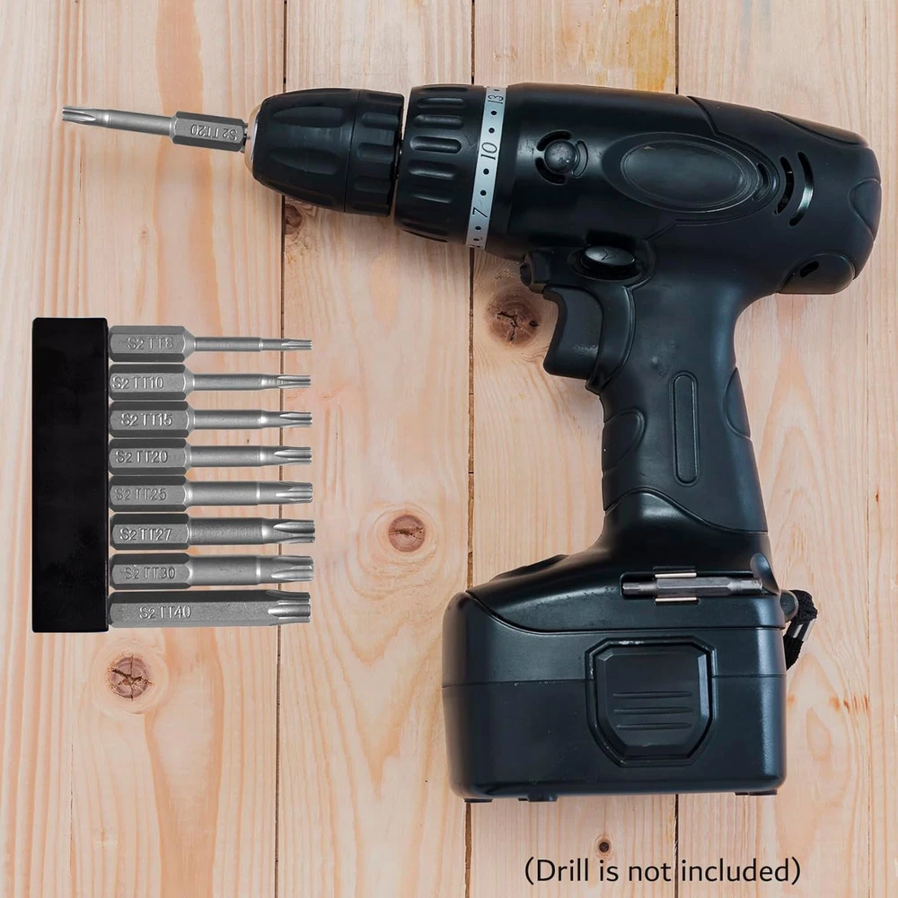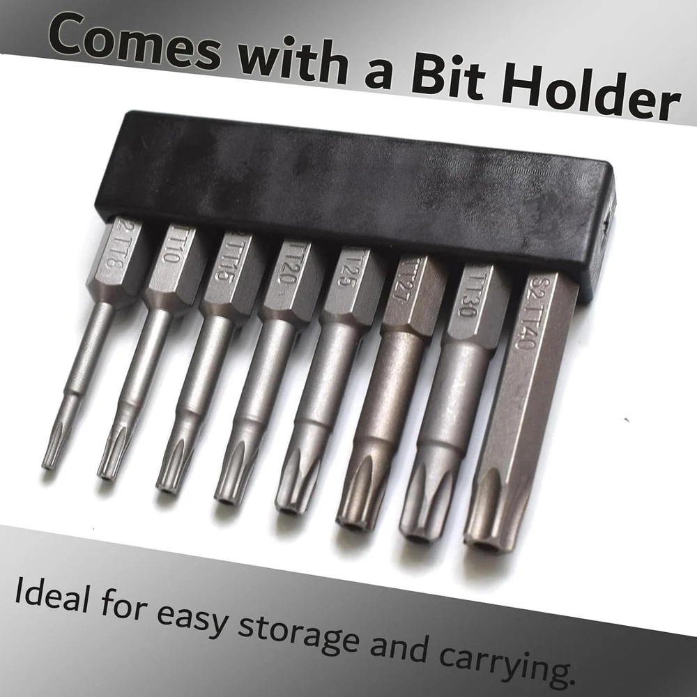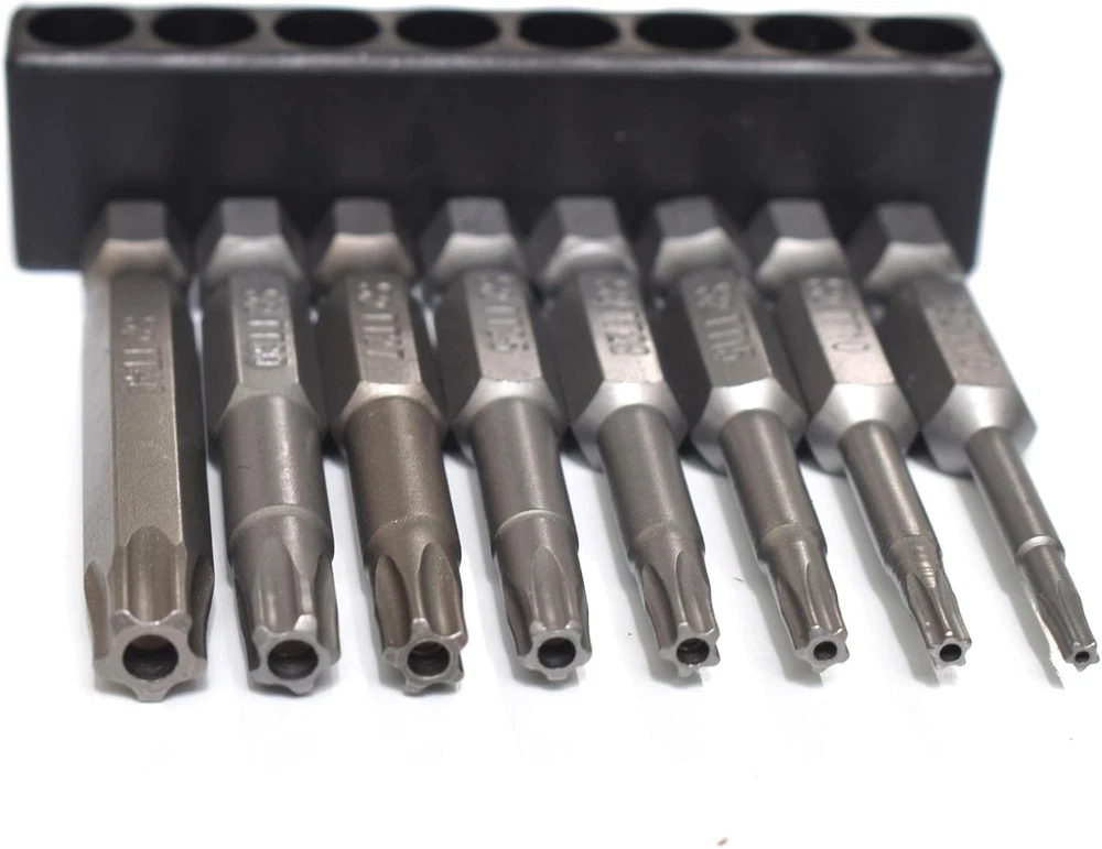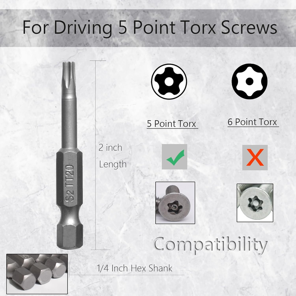 What’s in package: 5 Point Torx TT8 TT10 TT15 TT20 TT25 TT27 TT30 TT40 Screwdriver Bits. Screwdriver Bits Length: 2 inch. 5 Point Star Security Screwdriver Bits are made from shock-resisting S2 steel for maximum durability. These Screwdriver Bits are designed to drive 5 Point Star head screws. Strong Magnetic tip can attract screws easily, and make it easy to take the screw out after unraveling. Can be widely used in electric drills, electric screwdrivers, hand screwdrivers, and air drills., etc. 5 Point Torx Star Security Screwdriver Bits