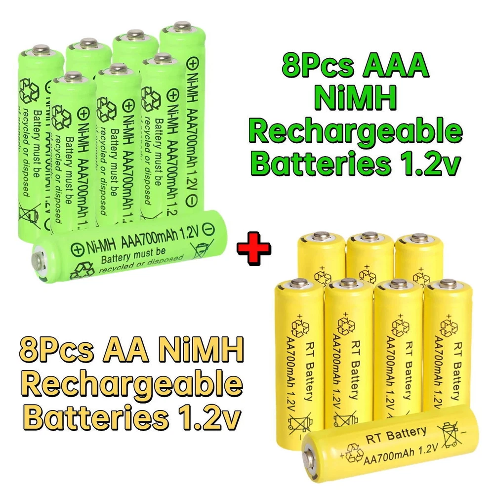 8Pcs AA & 8Pcs AAA Ni-MH Rechargeable Batteries 1.2v 700mAh for Solar Light Warm Tips: Before use, please remove the plastic packaging film of the battery. AA / AAA NiMH Battery 1.2v Features: 1.【Widely used】 The AA batteries rechargeable 1.2v is perfect for solar garden lights, landscape lights, lawn lights, etc.It can replace all disposable alkaline batteries for low power electronic products. 2.【Easy to Charge】 The AA rechargeable batteries Ni-MH can be charged by solar lights or standard charging devices. Better high-temperature performance than other types of batteries, can be used from -4℉ to 140℉, and can be charged from the sun even in the snow. 3.【Safe and Reliable】 The Ni-MH AA 1.2v rechargeable battery is very safe and reliable. For transportation safety, these Ni-MH AA batteries are only pre-charged to 30%, so please charge them before use for longer working time. 4.【Durable】 Our Ni-MH AA batteries rechargeable have a capacity of 700mAh and can be recharged at least 500 times continuously. Save you the cost of buying disposable alkaline batteries and reduce the harm to the environment. 5.【Suggestion】 Please charge the battery after each power exhaustion, otherwise it will affect the capacity and life. In addition, charge every 3 months to extend the life of the battery. NiMH AA Battery 1.2v Specification: Capacity: 700mAh Voltage: 1.2V Size: diameter 14mm*50 mm Terminal Type: Button Top Chemistry: Ni-MH (Nickel Metal Hydride) Rechargeable Times: Up to 1000 times No Memory Effect Note: Do not disassemble or modify the rechargeable battery NiMH AAA Battery 1.2v Specification: Capacity: 700mAh Voltage: 1.2V Size: diameter 10mm*44 mm Terminal Type: Button Top Chemistry: Ni-MH (Nickel Metal Hydride) Rechargeable Times: Up to 1000 times No Memory Effect Note: Do not disassemble or modify the rechargeable battery Package Included: 8X Ni-MH AA 1.2v Rechargeable Battery 700mAh 8X Ni-MH AAA 1.2v Rechargeable Battery 700mAh Warm Tips: 1. Before use, please remove the plastic packaging film of the battery. 2. Please check the "+" and "—" directions of the battery before you charge the battery. 3. Do not put the product into fire, short circuit, dissassemble and extrude. 4. Do not mix charging with different type of batteries, which may explode or leak, causing personal injury. 5. Please use up the power each time, then recharge it otherwise it will affect its capacity and lifetime. 6. Please take out the battery if you won't use for a long time to avoid battery leakage. 7. Note:Please find us in first time when you find the parcel Broken/Scratch/Function Error/Miss Parts/Unwork/has not arrived etc, we always have more details and solutions, even duty for your order. On Jan 4, 2025 at 14:01:29 PST, seller added the following information:
