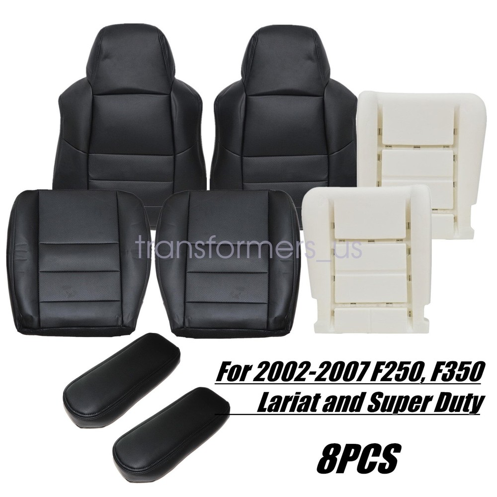 AC Seats Compatibility: Yes, Fits AC Seats Fitment Type: Direct Replacement Years Fitted: 2002 2003 2004 2005 2006 2007 Model Fitment: 2002 2003 2004 2005 2006 2007 F250, F350 Lariat and Super Duty How difficult is installation: We Provide professional install Video Compatible Brand: Ford Surface Finish: Leather Manufacturer Warranty: 5 Years OE Spec or Performance/Custom: OE Spec Seat Cover Design Type: Factory's OEM Replacement gtin13: Does not apply Type: Seat Cover Replacement Brand: Soillar Number of Pieces: 8 Seat Type: Bucket Seat Without Headrest, Full Set Compatible with: Manual & Powered Seats Does it fit Extended Cab?: No. It doesn't fit extended cab Placement on Vehicle: Front, Left, Right Custom Bundle: No Inner Liner: 1/2 & 1/4 Inch Padding like OEM Material: Microfiber Leather Package Include: 2x Bottom & Back Seat Cover & 2x Foam Cushion & 2x Armrest Cover Make & Model: Ford F250, F350 Lariat and Super Duty Seat Type Compatibility: Heated & Non-Heated Seats Year: 2002 2003 2004 2005 2006 2007 Install it yourself and save money: Most of our customers do the installation at home Color: Black w/ Perforated insert - Factory Original Color Select Side: 8Pcs Front Seat Cover & Both Side Bottom Foam UPC: Does not apply Product Name: Driver Passenger Bottom Top Armrest Seat Cover Manufacturer Part Number: Does Not Apply Side: Driver / Passenger Side