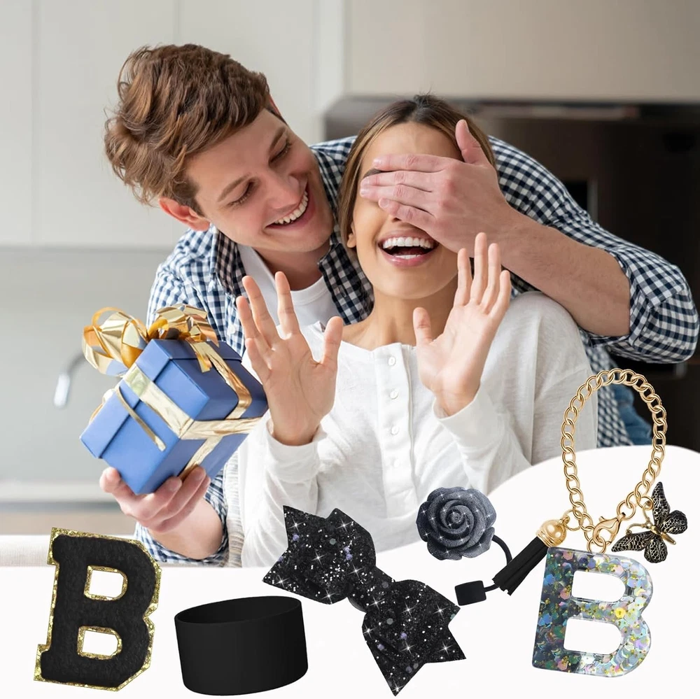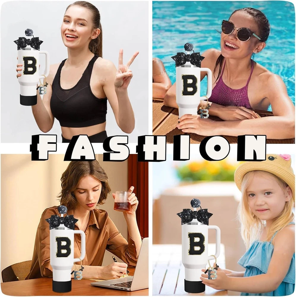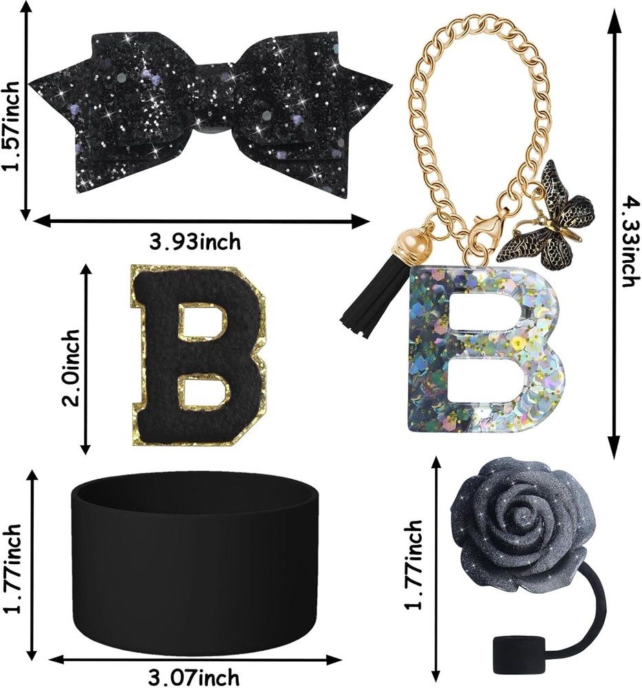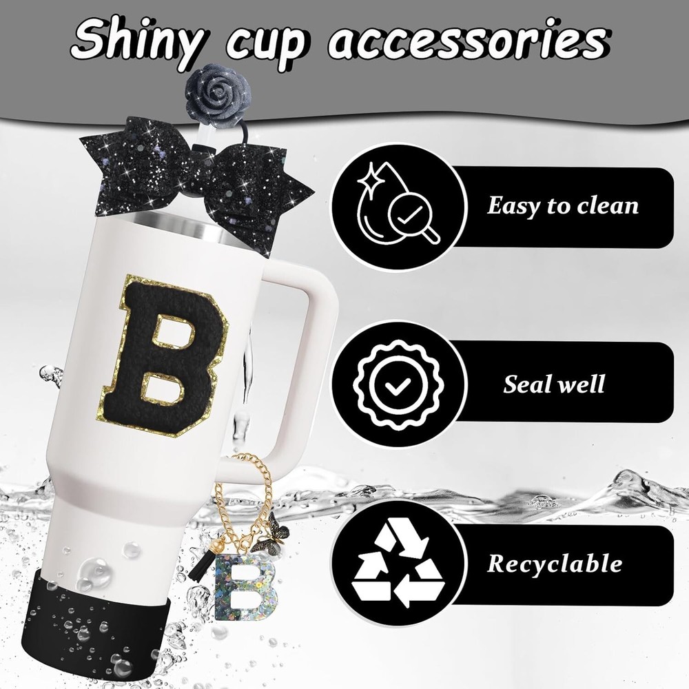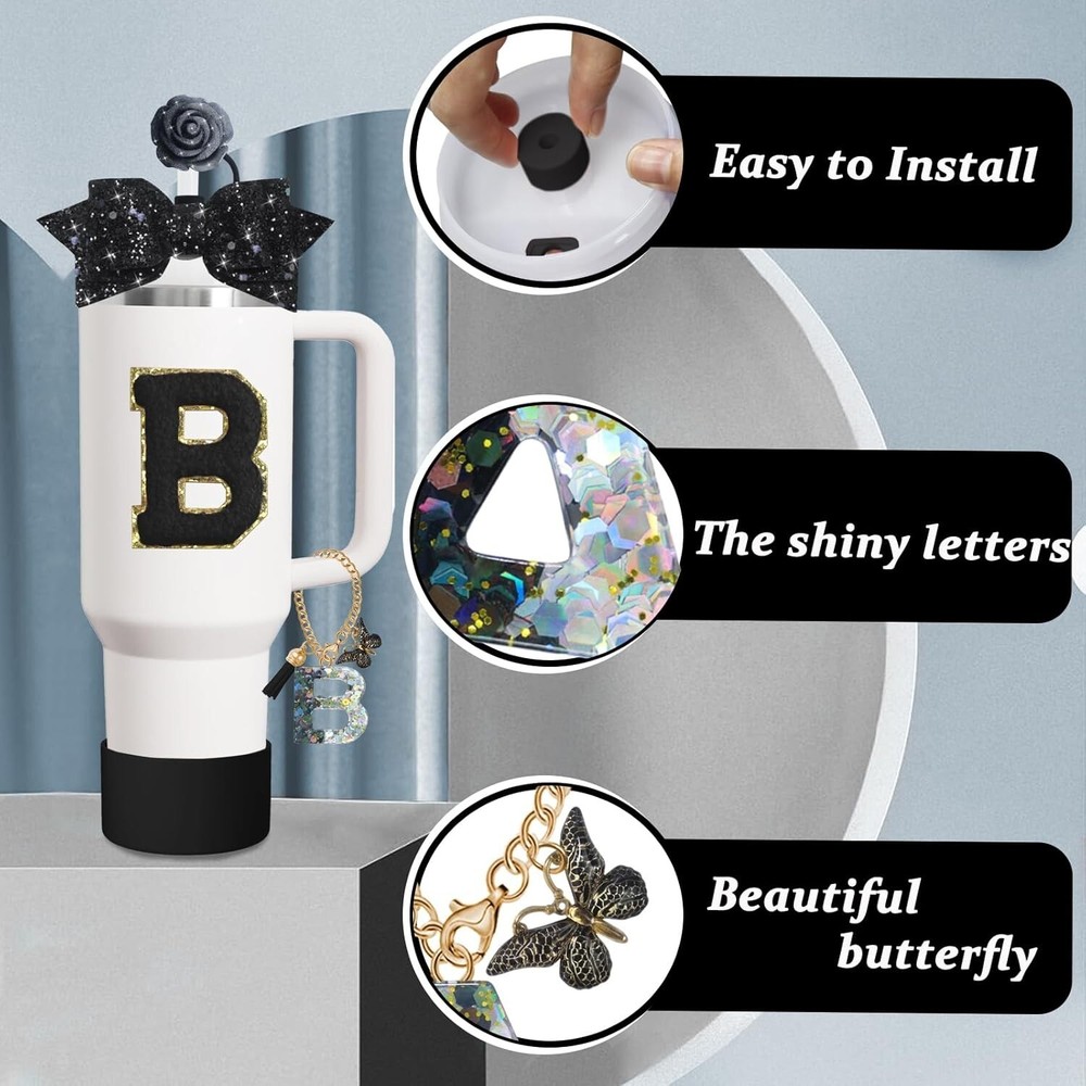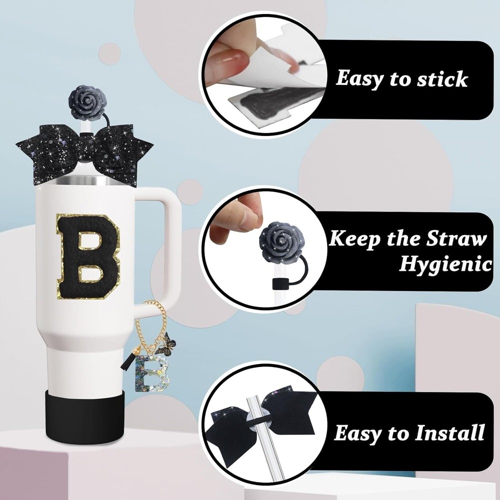 8PCS Cup Accessories Set for Stanley Cup 30oz 40oz tumbler with handle,Including Silicone Straw Topper Cover Cap and Boot,Spill Proof Stopper,Handle Charm,Initials Sticker (Black rose B) About this item : Personalized Set:initials cute accessories for Stanley cup are very popular now,very suitable for giving as gifts,friends and family will love the initials decoration,which makes the cup unique,personalized and not easy to be confused Good Protection:Anti-spill stopper ensures you no longer worry about accidental leakage of glass.The water bottle's silicone cover prevents unwanted scratches and dents,reduces noise,and extends the life of your water bottle.The silicone straw cover has good sealing performance Practical and Cute:Not only functional, but also adds a cute touch to your cup.It serves as a decoration while ensuring the cleanliness and hygiene of your cups and straws.You can take the bottle with you for walks,parties,traveling and cycling Package Includes:The accessory set is a must-have for anyone who owns a cup for Stanley 40oz or 30oz.1pcs pink butterfly straw cap,1pcs square spill-proof stopper and 1pcs round lid leak-proof stopper,1pcs replacement straw cover,1pcs towel embroidered letter sticker,1pcs Black Rose Straw Cover,1pcs pink silicone boot cover.It enhances the functionality of the Stanley Cup,making it more suitable for various occasions,sufficient quantity for your daily use. For Men/Boys/Women/Girl: This Cup Accessories set for stanley comes in a bold yet not flashy blue hue, making it a look that both genders will love.This makes it irresistible for all boys/Girl to use them to enhance their tumbler look. Become an expression of personality for all genders and add a fun element to everyday life.