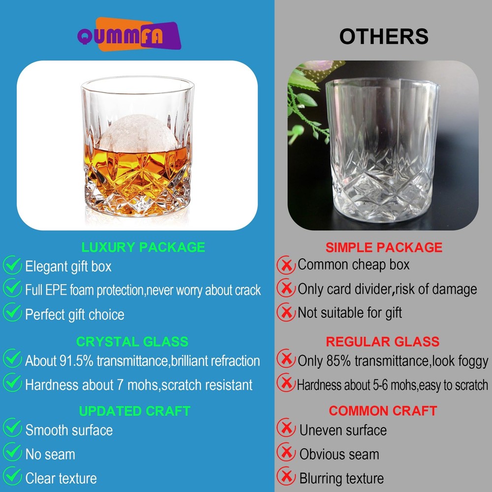 A Tasteful Life Starts with Whiskey Glassware Enjoy every wonderful moment with our whiskey glasses, feeling the mellowness and charm of your liquor Premium Quality Whiskey glasses are made from high quality lead free crystal glass, classic design with durable thick walled and heavy weighted base, the solid design is virtually unbreakable, premium material makes it dishwasher safe and also meet hotel and service industry quality standards. Safe Package the whiskey glasses are well packaged in the inside with tight seating and heavy foam to ensure safe shipping. The beautiful package makes our whiskey glass set an ideal gift for Men or Women on any occasions. Unique Design The bourbon glasses with embossed diamond design make it easier and better to grip, you will feel much different and comfortable in your hand than other cheap made glasses. Wide shaped on the top to ensure a smooth drinking and sipping experience, a high quality scotch glass creates a truly enjoyable whiskey tasting experience PERFECT CAPACITY 10 oz capacity is suitable for virtually any type of drink, rocks glasses with enough room to average ice block or hold an ice sphere. These glasses are perfect for malt scotch, bourbon, beer, vodka, old fashioned cocktails, gin and tonic and much more. Great for home bar or both casual gatherings and formal dinner parties. Great Thanksgiving Day Christmas New Year whiskey gifts for men and women. Premium Quality Whiskey Glasses - Made of lead free crystal glass, clean and clear, no heavy metal included.Perfect for serving scotch, whiskey or mixed drinks. Use for drinking your Single Malt, Tennessee Rye, Brandy, Beer, Vodka, Old Fashioned Cocktails, Gin and Tonic or any liquor you like, or even as a classy way to serve water or juice at your dining table Durable Old Fashioned Glasses - Thickened wall and heavy weight bottom promise a long service time. The full capacity is 11 oz, standard 10 oz Volume, comfortable hand feeling, suitable for ice cube. Budget- friendly set of 8 lowball glasses that you can use for whisky, scotch, bourbon, vodka and almost any cocktails you can think of Engraved Design Rocks Glass - Serving your drinks in these elegant engraved glasses will surely impress your party guests. Ideal for proposing a toast on special occasions with family or clients, or playing poker and party with friends. Easy to clean and dishwasher supported Perfect Gift For Whiskey Lovers - This Glasses Drinking Set is an excellent gift for all kinds of liquor lover. Perfect gifts chocie for Men or Women on Birthdays, Mother's or Father's Day, Engagement, Wedding Anniversary, Christening or Christmas Safe Package - Full EPE foam cover protection for the whiskey glasses, which greatly reduces the risk of damage during shipping. If you have any question about these rocks glasses or your order, please do not hesitate to contact us immediately. We will provide you with satisfactory service