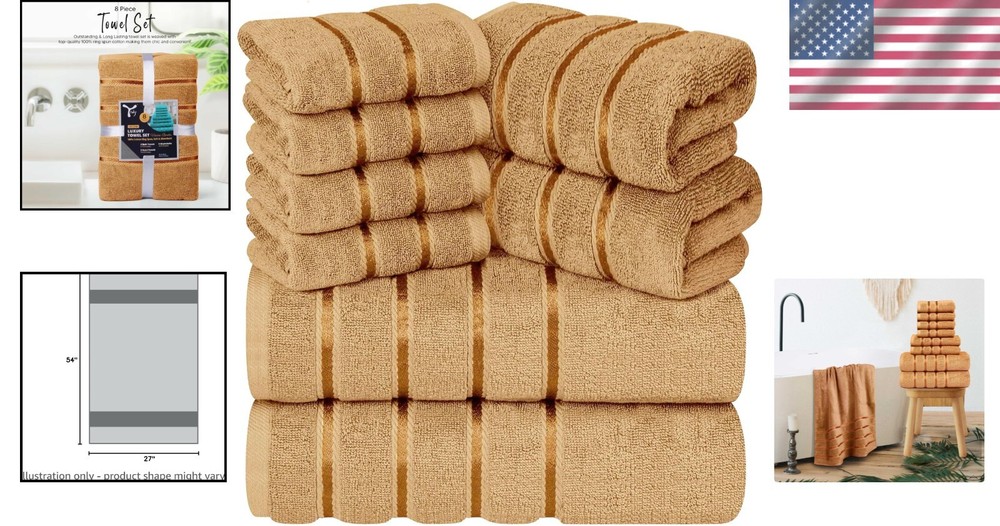 Softness: Extra Soft Unit Count: 1.0 Count Department: Adults, All Ages UPC: Does Not Apply GSM (Grams per Square Meter): 600-900 GSM Type: Towel Set Pattern: Bordered Age Range (description): All Ages Color: Beige Set Includes: Bath Towel, Hand Towel, Washcloth Style: Viscose Stripe Plush Towels 600 Gsm Number Of Items: 8 Product Dimensions: 54"l X 27"w Care Instructions: Machine Wash, Do Not Iron, Do Not Tumble Dry, Dry Clean Only Size: 54 in x 27 in Number of Items in Set: Eight-Piece Material: 100% Cotton, Ring Spun Cotton Theme: Luxury Room: Bathroom Fabric Type: 100% Ringspun Cotton Item Weight: 3.9 Pounds Item Thickness: Not specified Brand: Unbranded gtin13: Does Not Apply Personalize: No Features: Highly Absorbent, Soft, Lightweight Shape: Rectangle Special Feature: Highly Absorbent, Lightweight, Soft