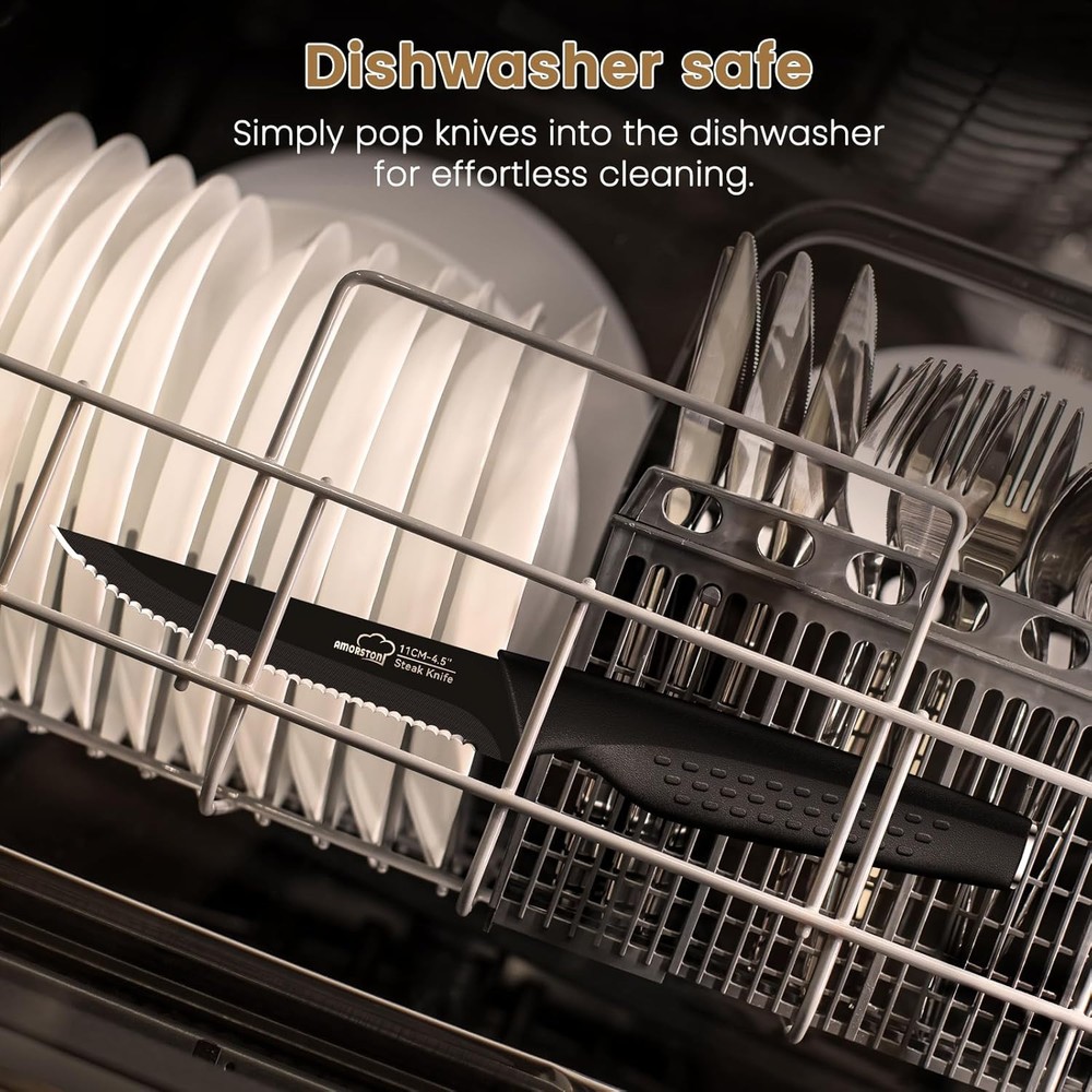 Steak Knives, Knives Set of 8, Stainless Steel 8 Piece, 8 Piece - Black Product Details Blade Material: High Carbon Stainless Steel Brand: Amorston Color: 8 Piece - Black Handle Material: Polypropylene Blade Edge: Serrated Blade Length: 4.5 Inches Construction Type: Forged Item Weight: 16 ounces Blade Color: Black Is Dishwasher Safe: Yes Item Length: 11 Inches Manufacturer: Amorston Size: 8 Piece Item Weight: 1 pounds Item model number: 1 【Sharp, Non-Stick & Rust-Resistant】The steak knives body uses a unique anti-rust, anti-stick and anti-oxidant coating, so that the blade is always in the best condition, extremely easy to clean, greatly extending the life of the knife. It's also a wonderful wedding gift for your friends or Mother's Day gift for your mother, or a gift for yourself! 【Comfortable and Non-slip Handle】The handle of the steak knife is made of the highest grade PP material. The ergonomic handle, made by the most professional designers, makes the steak knife extremely comfortable to use, and even after long hours of use, the hand will not feel any discomfort. In order to increase the safety of steak knife use, we have also added extra anti-slip air holes to ensure safety while enjoying the food. 【Dishwasher Safe】This steak knives set for kitchen is easy to maintain. Dishwasher safe. Perfect for storage after washing and drying. The whole body of the knives set for kitchen is made of premium stainless steel material. The surface layer has a high-grade anti-rust coating, which will not rust as easily as other kitchen knife sets, and will not cause damage despite the high intensity impact of the dishwasher. 【Multipurpose】: The 8-piece set of steak knives can be used for more than just slicing steaks, scenes can be used in barbecues, kitchens, dinners, parties, camping, restaurants, and hotels. They also work well for slicing and carving meat, cheese, butter, bread, baguette, turkey, pizza, ham, brisket, fish, vegetables, fruit, and especially beef and steak.