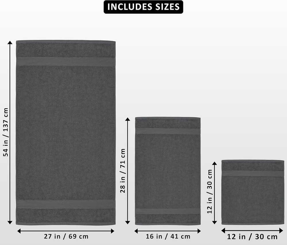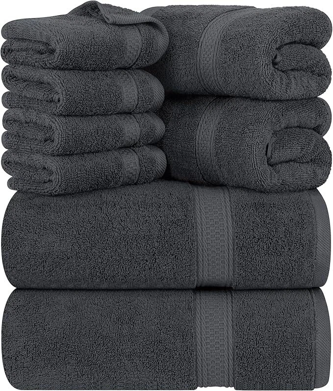 2 Bath Towels, 2 Hand Towels, and 4 Wash Cloths Set of 8- Our economic set of towels contain: 2 bath towels measuring 27 x 54 inches each; 2 hand towels of 16 by 28 inches each; and 4 washcloths of 12 inch by 12 inches each Enjoy a spa like experience with our luxuriously soft and absorbent towel set. Premium Quality Construction- Woven with 100% ring spun cotton that are supremely soft and breathable while being strong and durable to hold up to daily use. Enjoy the luxury of wrapping yourselves in bath towels after shower, drying your hands or cleaning your face with a washcloth. Multipurpose/Versatile/ Dynamic Use- Perfect combination of softness and strength, the towel set is ideal for everyday usage. Use the towels efficiently in a bathroom, at gym, beach, poolside, salon, spa or even camping trip. Double Stitched Hemmed Finish- Each towel is finished with a double stitched hems at the border to give them a clean edge while preventing it from unraveling. It also adds to the aesthetics of the towel set. Highly Absorbent- Our towels are super absorbent, yet light weighted. Gives the body a soft and delicate touch while helping you dry off your skin gently. To prevent unforeseen color discoloration, it is advised, to avoid the removal of the application of any form of cosmetics, facial creams, or scrubs directly with the towel.