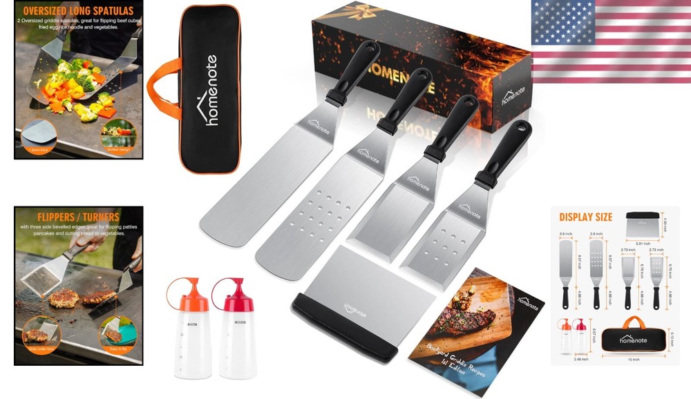 Number in Pack: 8 Style: Modern Size: Medium Item Weight: 1.3125 lb Item Dimensions L X W X H: 14.45 X 2.81 X 0.01 Inches Color: Black Material Type: Stainless Steel Item Dimensions: 14.45 X 2.81 X 0.01 Inches Number Of Pieces: 8 Brand: Unbranded Handle Material: Plastic Material: Stainless Steel Is The Item Dishwasher Safe?: Yes Type: BBQ Tool Set Head Material: Stainless Steel Features: Dishwasher Safe, Durable plastic handle, Hanging hole on handle, Stronger and thicker stainless steel, Multipurpose use, Great for outdoor cooking Item Height: 0.01 Inches UPC: Does not apply Number of Items in Set: Eight-Piece gtin13: Does not apply Personalize: No Finish: Polished Set Includes: Grill Set, 2 oversized griddle spatulas, 1 chopper/scraper, 2 squeeze bottles, 1 Homenote exclusive recipe, 1 storage bag