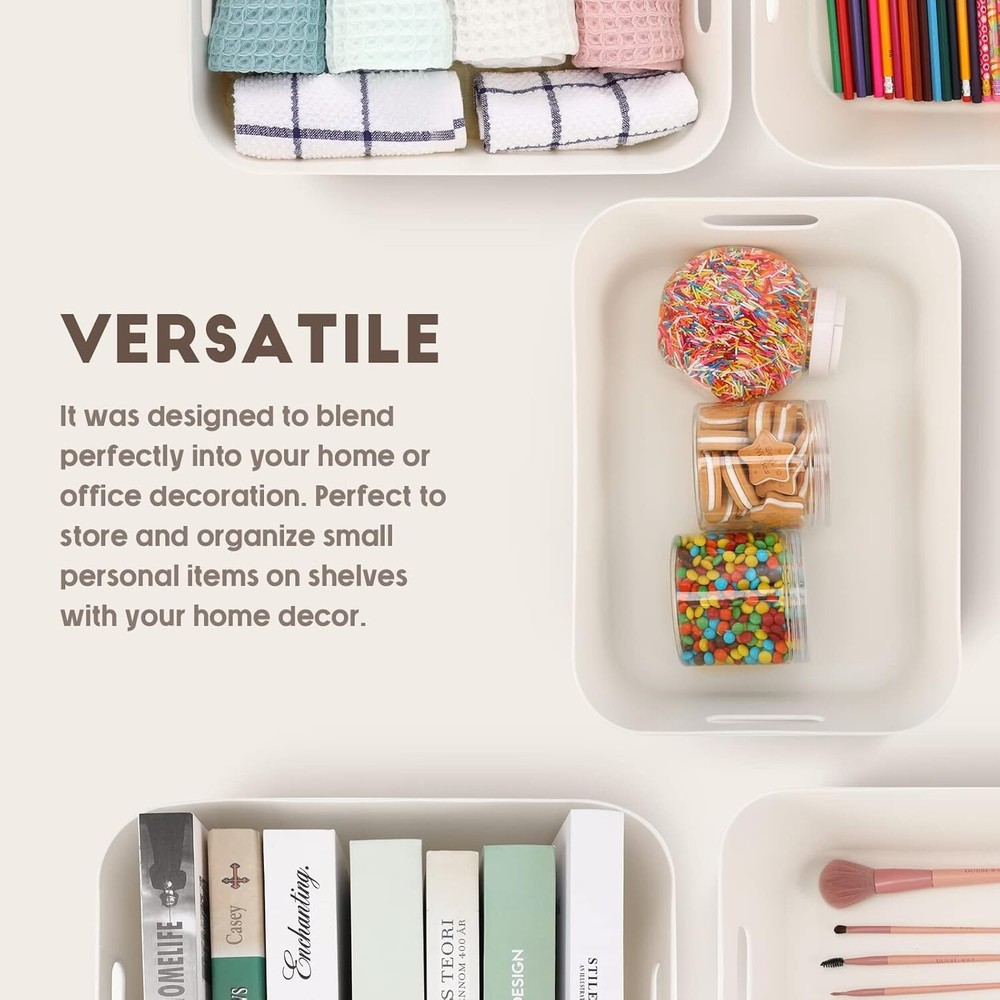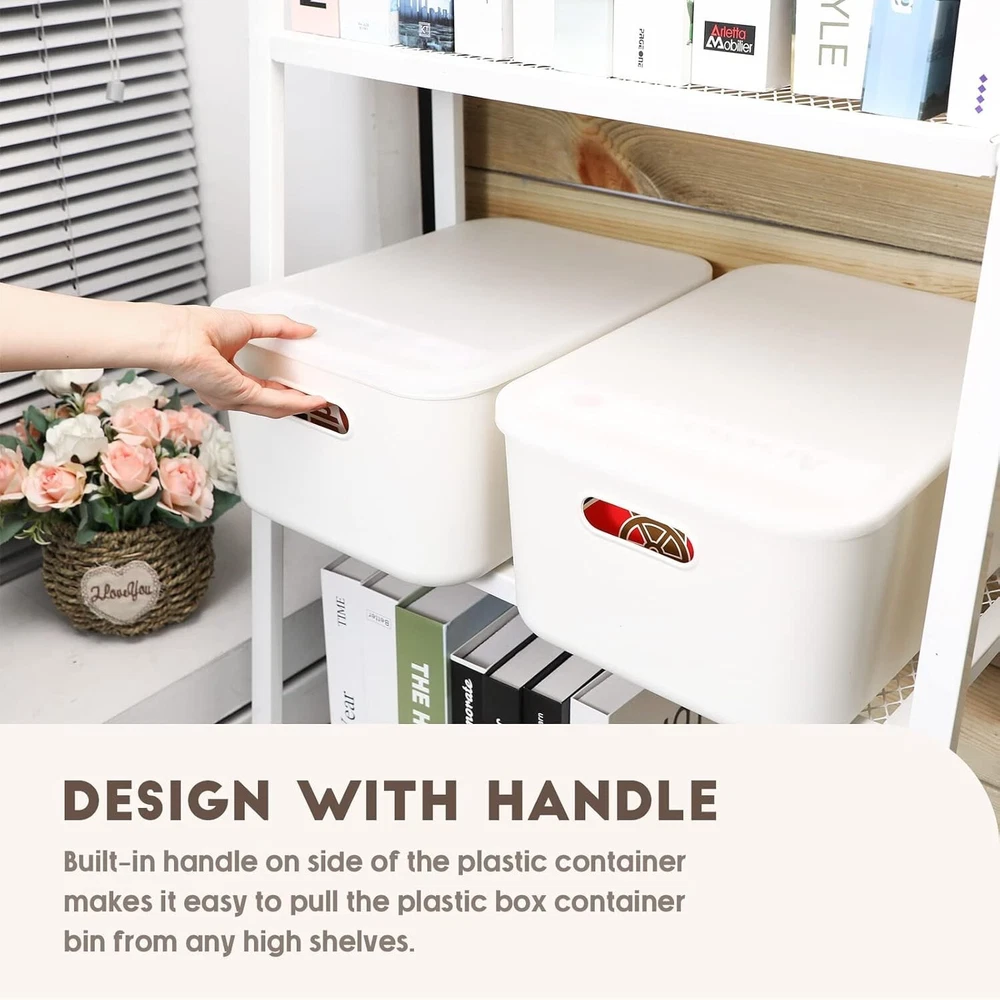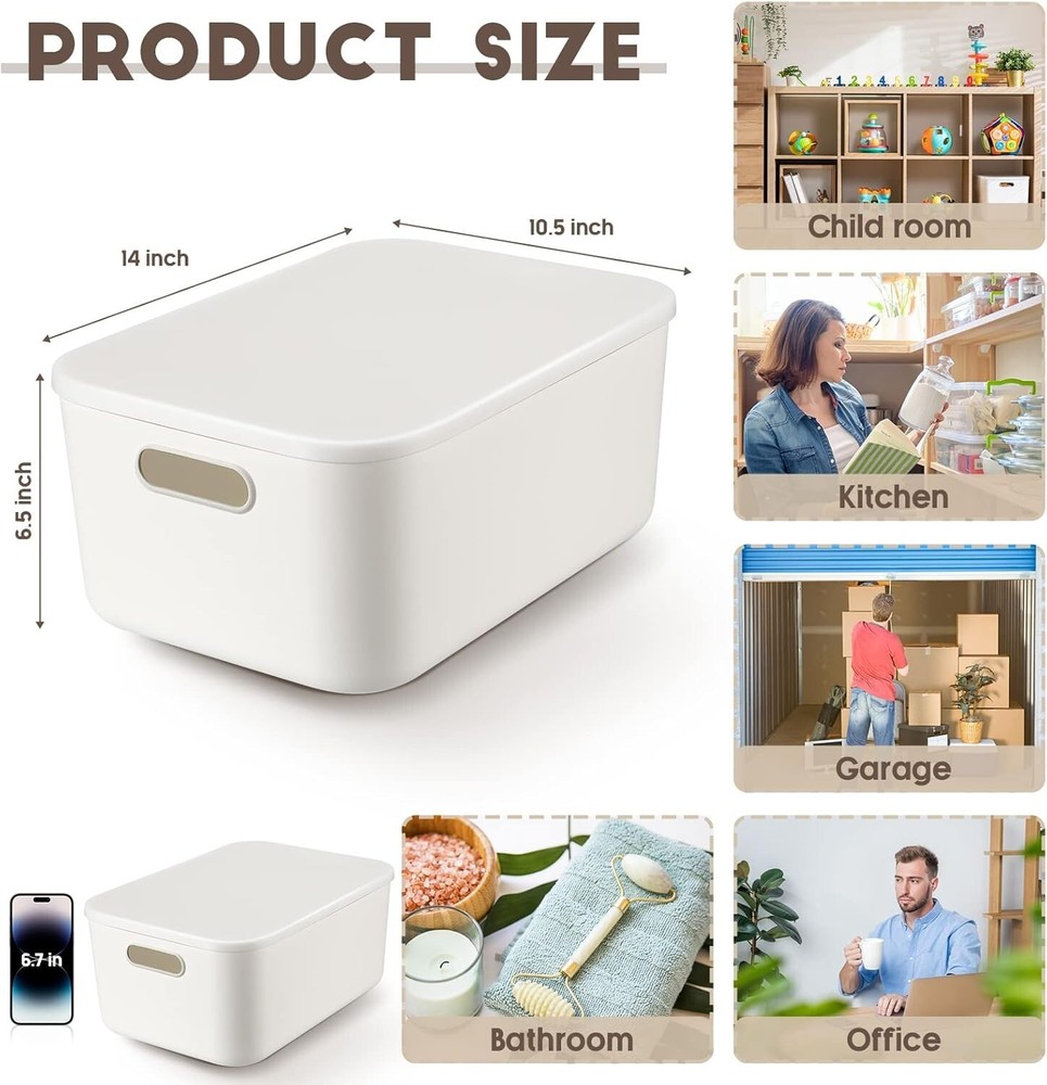 8 Pieces Plastic Storage Bins with Lids White Storage Box with Handle Stackable Containers with Lids for Organizing White Bins Small Storage Basket with Lid for Table 14 x x Inches Modern Design: the crisp white base pairs effortlessly with lid are easy on the eyes, 8 packs plastic storage bins are nice for use in the living area, bedroom, home, office, classroom, garage or even in a cabinet or closet Neat and Clean: the plastic storage bins with lids are about x x cm/ 14 x x inches, you can use them to store many things, such as holiday decorations, clothing, children's toys, office supplies, bathroom supplies, garage items, etc., to bring you a comfortable feeling Stackable and Dust Proof: our decorative storage boxes with lids are designed with lids, dust proof, which can keep your items clean and neat, feature a flat base, stable and lightweight, so you can stack them on top of each other, not take up much space, a good helper for your room Portable: built in handle on side of the plastic container makes it easy to pull the plastic box container bin from different high shelves, out of cabinets, and closets; Lightweight to carry around home, office, college dorm, RV and camper Wide Applications: with a proper capacity and handy design, you can use our white plastic storage bins to store many items, such as fruits, vegetables, packaged goods, yogurt, canned food, beverage boxes and so on, to keep them well organized