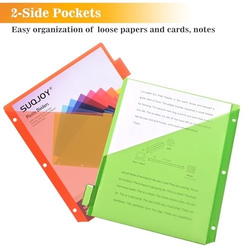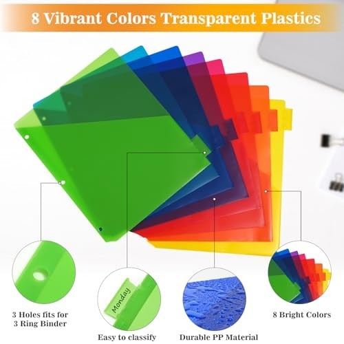 Organize Your Documents with Ease Transform your binder into a well-organized and efficient system with our versatile dividers. Designed to enhance your productivity, these dividers are perfect for home, school, or work. Fits Well for 3 Ring Binders These dividers come with 3 holes punched, making them compatible with standard 3-ring binders. They easily load into any binder size, whether it’s 0.5", 1", 2", 3", 4", or 5". Keep your binders neat and presentable while protecting your important documents. Multicolor Tabs for Quick Access Featuring 8 pre-labeled multicolored tabs, these dividers allow for effortless categorization of your documents. The large, clear labels make it simple to find what you need quickly, helping you stay organized even in a busy lifestyle. 8-Tab Dividers with Two Side Pockets Each divider includes pockets on both the front and back, providing a reliable solution for storing loose papers, notes, or other essentials. The easy categorization through tabs combined with additional storage makes organization a breeze. Durable Plastic Dividers Crafted from high-quality materials, these dividers are strong and sturdy enough to withstand frequent use. They ensure that your important documents remain safe and secure over time. Stay Organized The bright colors of these dividers not only enhance the aesthetic of your binder but also allow for quick identification of subjects at a glance. Each divider includes two pockets ideal for storing papers, printables, homework, tests, or reports—offering a professional and tidy appearance.