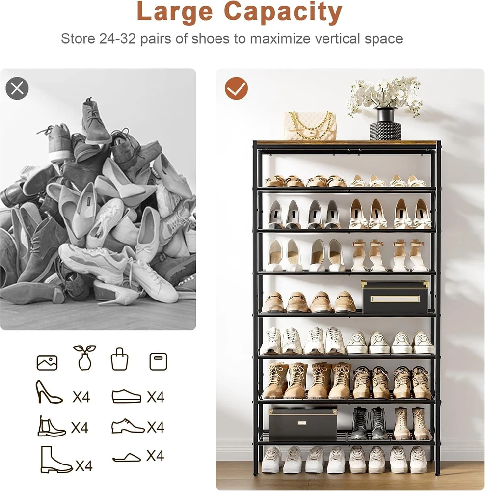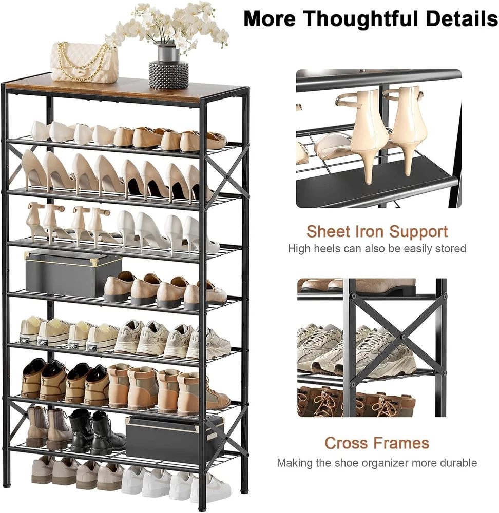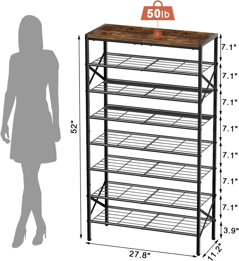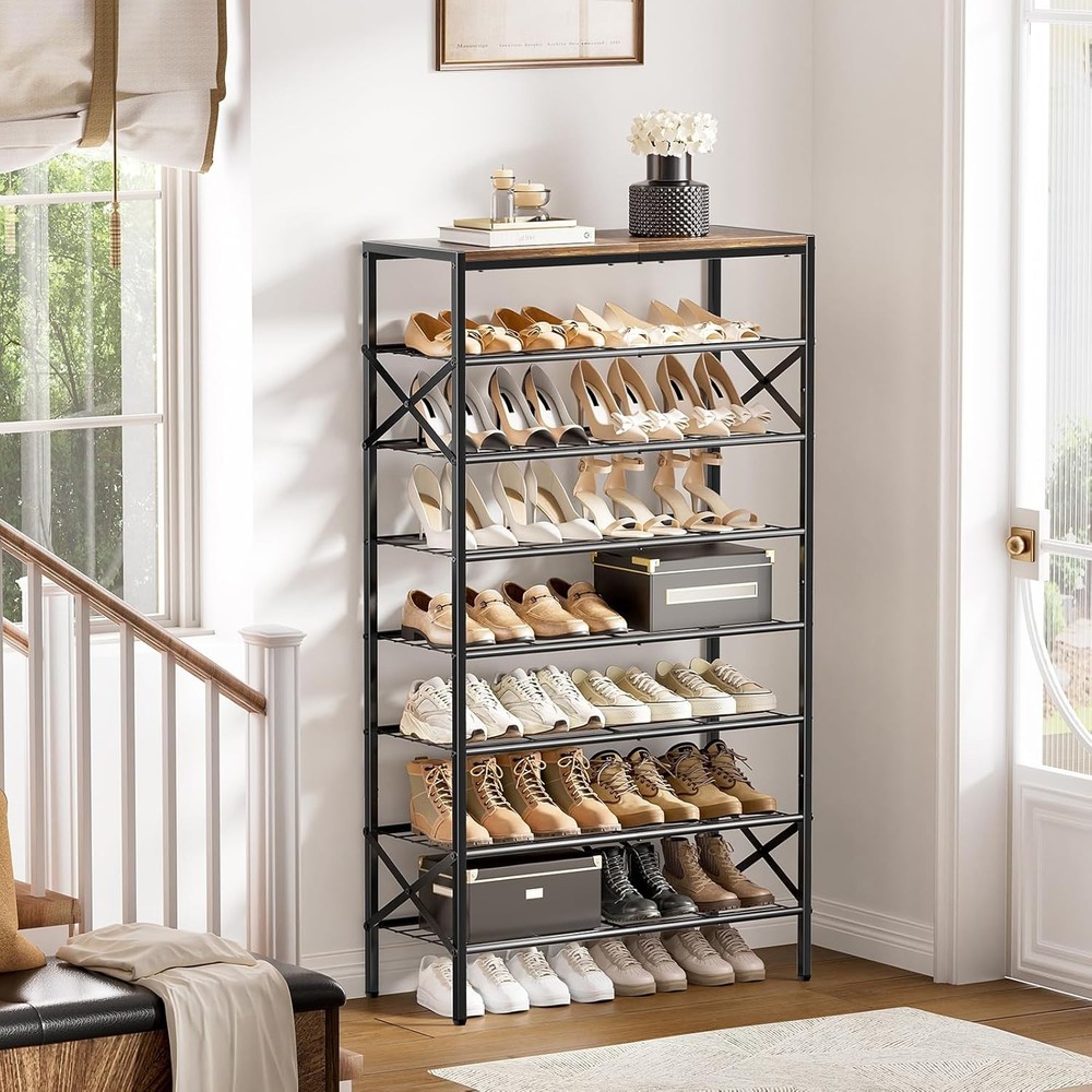 8-Tier Tall Shoe Rack Organizer Storage for 8-tier, Rustic Brown Product Details Room Type: Closet Entryway Number of Shelves: 8 Special Feature: Trees Product Dimensions: 11.2"D x 27.8"W x 52"H Style: Modern Age Range (Description): ALL Finish Type: Lacquered Brand: UNITSTAGE Product Care Instructions: Wipe with Dry Cloth Size: 8-tier Weight Limit: 3E+1 Pounds Assembly Required: Yes Recommended Uses For Product: Storing and organizing shoes in entryways, closets, garages, bedrooms, cloakrooms, dormitories, and living rooms Number of Items: 1 Manufacturer: UNITSTAGE Included Components: Assembly Tools Model Name: 8-Tier Tall Shoe Rack Organizer Furniture Finish: Wooden Installation Type: Freestanding Min. Required Door Width: 11.2 Inches Weight capacity: Maximum weight: 3E+1 Pounds Specific Uses For Product: Shoes, Photos, Keys, Bags, Decorations, Books, Greenery, Flowers, Artistic Works, Storage Unit Count: 8.0 Count Product Name: shoe rack Item Weight: 18.28 pounds Country of Origin: China MaterialMounting Type: MetalFloor Mount Shelf TypeShape: MetalRectangular Capacious and thoughtful Shoe Rack:The front door shoe rack sizes 27.8"L x 11.2"W x 52.0"H . This tall shoe rack boasts 7 storage shelves and 1 top shelf for 24-32 pairs of shoes, making it competent to store shoes of whole family.The metal shoe organizer is equipped with 2 iron sheets, so that the high heels can be smoothly placed on them. If you have tall shoes, you can remove a shelf Reliable Shoe Organizer:The wooden shoe rack for front door entrance is built with quality particleboard and metal, strong and bearable. The top panel can undertake 50 lb and each floor 30 lb. The side X-shaped design offers doubled enhancement for overall stability Multi functional shoe rack:The top shelf of this shoe storage organizer can house your photos, keys, bags, or decorations.Besides its original role of storing shoes, this metal shoe rack can be a display stand of books, greenery, flowers and artistic works in the living room, bedroom, office etc. powerful, practical and all-match Easy to assemble:The tall shoe rack has a simple structure and all accessories have been numbered in order. With detailed assembly instructions and necessary tools, the assembly can be completed without too long and can be quickly put into use Thoughtful Shoe Shelf: The combination of retro-finished panel and black mesh frame represents the industrial style. The multi-level design effectively stores your shoes with protection, beautiful and practical