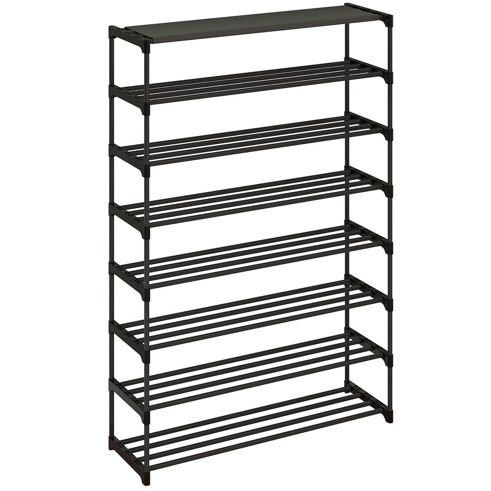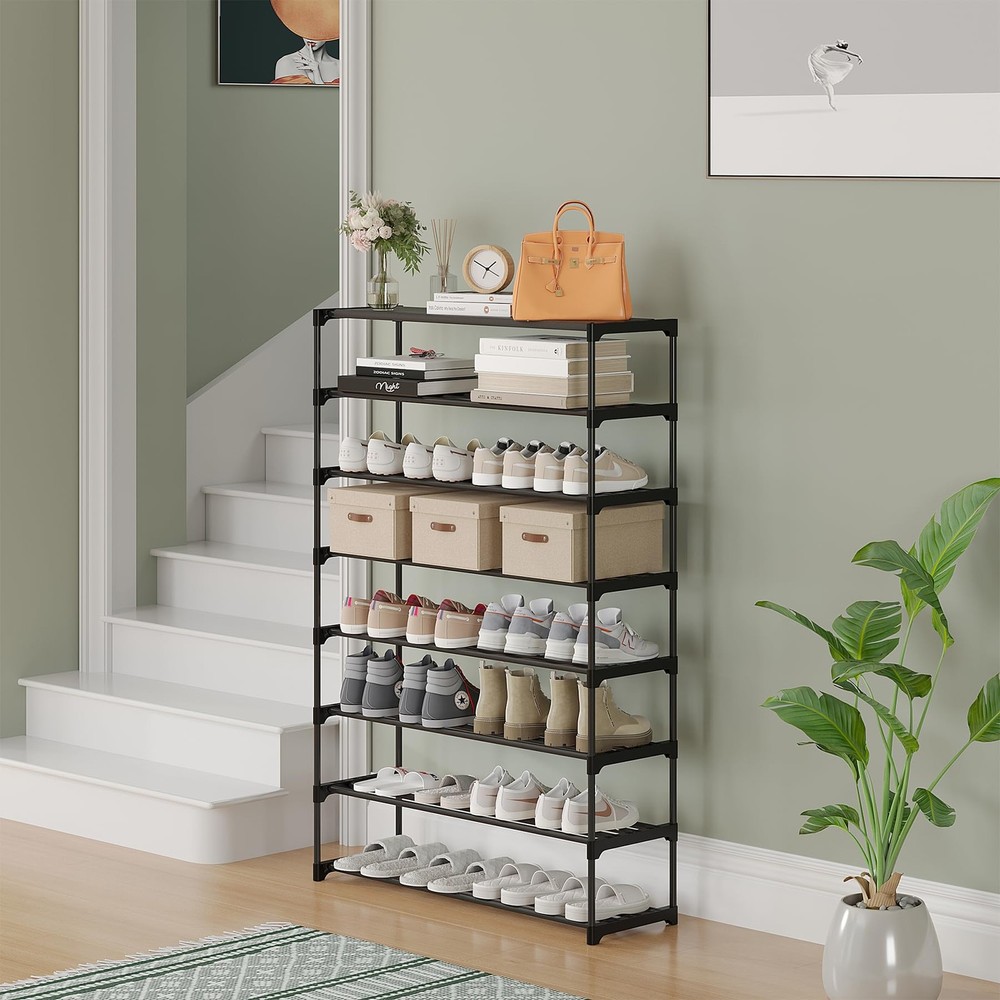 [ Stackable Shoe Rack] 8 tier shoe rack organizer for different spaces of the bedroom, entryway and garage. The shoe rack has a clean and simple design that not only provides ample shoes storage space also decorates your home corner. [Practical & Stable] Each shelf can hold 3 pairs of adult male shoes, or 4 pairs of adult female shoes, or even 5 to 6 pairs of children's shoes. The non-woven top shelf can hold lightweight items such as handbags, umbrellas or dolls. Fully meet the daily needs of a family. [Adjustable Shelf ] The height of each tier of this shoe rack can be adjusted to your personal preference. Metal shoe racks after stacking can disassemble one shelf to provide adequate storage space for taller boots. [High-quality Materials] Equipped with high-quality plastic connectors and a thickened metal frame, this shoe rack is more stable and sturdy than ordinary plastic shoe racks. The metal rods are painted, not easy to oxidize and firm. [Tips for Use] Install the shoes rack in minutes! We are equipped with the corresponding installation instructions, labeled pieces. For a more stable shoe rack, our recommendation is that you follow the principle of heavy weight below and light weight above.