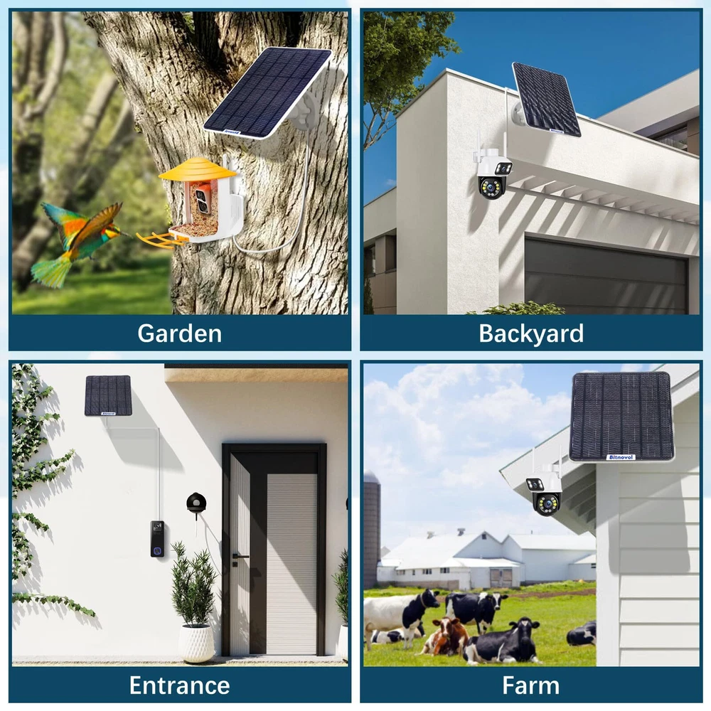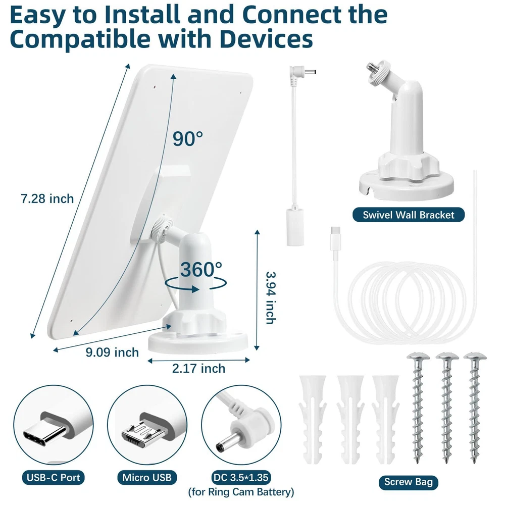 【8W Higher Effciency】:Durable 8 watt Solar panel, 8W solar panel for security camera is made of high quality A+ grade silicon, charging efficiency is up to 26% higher than ordinary 6W solar panel. Even if you have to go out for a long time, you don't have to worry about power.It can be used at Type-c or Extensible DC 3.5*1.35mm Port for Ring camera,Ring Spotlight Cam Plus/Pro ,Ring Stick Up Cam ,Ring doorbell pro,Netvue birdfy feeder cam,birdfy hummingbird feeder camera,etc. 【365 Days Non-stop Power Supply】: solar panel can absorb sunlight and offers non-stop power supply for your camera. 8W power output and high-efficient materials ensure reliable performance. You do not need to uninstall your camera frequently. You can also charge power banks and Bluetooth devices when traveling. 6Vsolar panel,solar panel for security camera,security camera solar panel,simplisafe solar panel. 【Durable & Waterproof】: Solar panel for security cameras matches IP66 weatherproof design, resist heavy snow, rain and other severe weather conditions. Equipped with Micro USB-C port cable, with a waterproof rubber cover adaptor head to prevent the infiltration of waterr. DO NOT Compatible with:USB-A,Arlo,Google,Nest,ring blink indoor camera,wyze cam v3,stich up Cam Plug-In,Spotlight Cam Wired,Spotlight Cam Plus/Pro. 【Super Higher Efficiency ETFE】: Upgraded 8W solar panel is composed of higher efficiency solar cell arrays, which can convert up to 26% of solar energy into free green energy than ordinary solar panels. There is a rear leg, which help to find the best angle of inclination to convert maximum sunlight. Can be used in environments with insufficient sunlight. solar charger for cell phone,Solar Charger for feeder camera,Solar Charger for fan,Solar Charger for outdoor camera,Solar Charger for battery-powered doorbell. 【Easy Install and Use】: Full set of accessories make it easy to install and connect the devices, complete installation in 5 minutes by yourself. Security camera solar panel absorb and convert energy uninterrupted, keeping rechargeable devices running day and night.Hummingbird feeder with solar panel,Bird feeder with solar panel,Solar panel for bird feeder camera,solar charger for Bird camera,solar panel for security camera usb c,toucan solar panel charger,Birdfy solar panel - type c adapter. solar charger for cell phone,Solar Charger for flashlight,Solar Charger for fan,Solar Charger for pad,Solar Charger for laptop 【What You Get & Support】: You will get Packing list: 1 x Solar Panel, 1 x USB-C to DC 3.5*3.15 convert line,1 x 10ft Charging Cable , 1 x 360-degree swivel and 90-degree tilt adjustable wall mount, 3 x Screws. Note: Any clouds or covers may affect the charging efficiency. If you have encountered any problem with the product, please feel free to contact us and we will reply within 4 hours., 1-month money back guarantee for this flexible solar panel, lifetime after-sales Serve. High quality monocrystalline solar panel with better performance, perfect gift for outdoor sports enthusiasts.