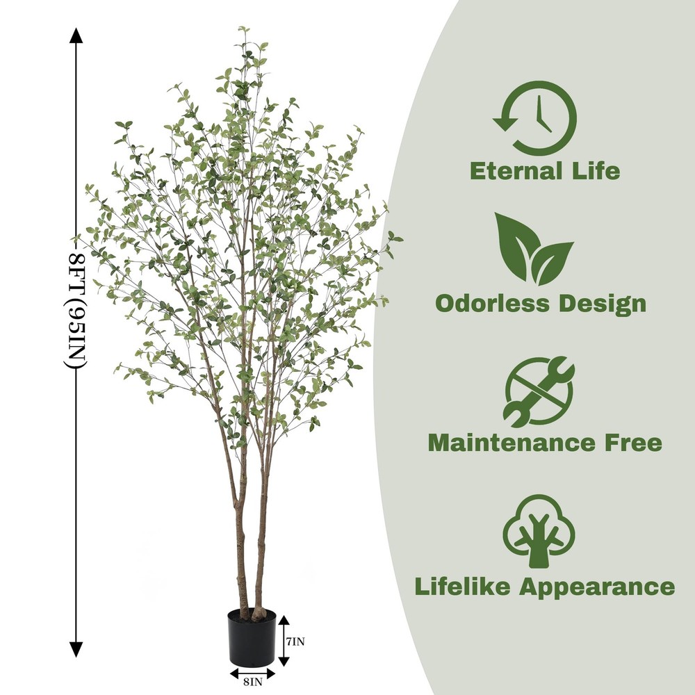 【Realistic Artificial Plants】Tall 8feet faux black olive tree features realistic branches and leaves , using mature technology to create a fake plants that mimics the foliage of a natural olive tree. It will be a beautiful scenery in your home or other places 【Easy To Adjust】:Our artificial black olive trees are easy to adjust branches and leaves,You can effortlessly shape it according to your preferences. The cement flower pot base adds stability, preventing any accidental tipping 【Exquisite Decoration】: This 8ft tall fake olive trees can be used in various occasions, such as offices; hotels, shopping malls, homes, living rooms, bedrooms, patios, dining rooms, entryways, outdoor spaces,perfect for interior decorating and adding vitality 【Easy To Maintain】: Faux black olive tree requires no watering or pruning. No matter where you place your artificial plant, it will stay green all year round. No need to spend a lot of time caring for it. Just dust it regularly and it will stay in perfect condition 【Easy To Assemble】: When you receive the fake plants, simply follow the instructions to install it. You can place the faux black olive trees in the planter, which will enhance the decorative effect