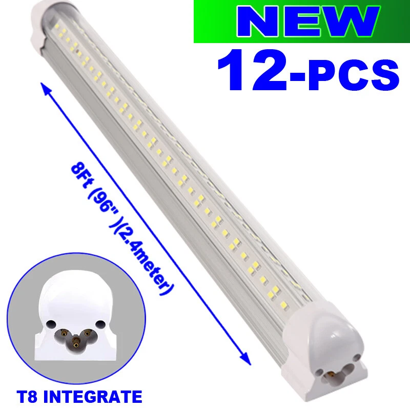 FAST DELIVERY - Ship from New Jersey or Los Angeles Warehouse via FedEx , 3-7 Days Delivered Your Door . SCIENTIFIC DESIGN - 8Ft LED Shop Lights Fixture is Made of 6500K Cold White SMD2835 LED Chip ,Plastic Clear Cover , Aluminum Bracket Housing ,and AC85-277V Constant Current Driver . It can work in -68F to 120F Temperature Conditions EASY INSTALLATION - The Integrated Tube Fixture Can be Install on Wall or Ceiling ,Easily Replace Traditional Fluorescent Tube Bulb . Plug and Play , Free Accessories (Power Cords, Connector , Extension Cords , Clip and Screw ) Come with Tube Lights Together WIDE APPLICATION - Linkable 8Ft Bulbs Widely Used in Garage Ceiling , Barbershop , Schools, Hospitals Basement , Factory Warehouses , Supermarkets Cooler Door , Offices, Shops,Hotels, etc 8ft LED Shop Light 144W 18000LM 6500K Daylight White V-Shape Clear Cover 12 PACK FAST DELIVERY - Ship from New Jersey or Los Angeles Warehouse via FedEx , 3-7 Days Delivered Your Door . SCIENTIFIC DESIGN - 8Ft LED Shop Lights Fixture is Made of 6500K Cold White SMD2835 LED Chip ,Plastic Clear Cover , Aluminum Bracket Housing ,and AC85-277V Constant Current Driver . It can work in -68F to 120F Temperature Conditions EASY INSTALLATION - The Integrated Tube Fixture Can be Install on Wall or Ceiling ,Easily Replace Traditional Fluorescent Tube Bulb . Plug and Play , Free Accessories (Power Cords, Connector , Extension Cords , Clip and Screw ) Come with Tube Lights Together WIDE APPLICATION - Linkable 8Ft Bulbs Widely Used in Garage Ceiling , Barbershop , Schools, Hospitals Basement , Factory Warehouses , Supermarkets Cooler Door , Offices, Shops,Hotels, etc