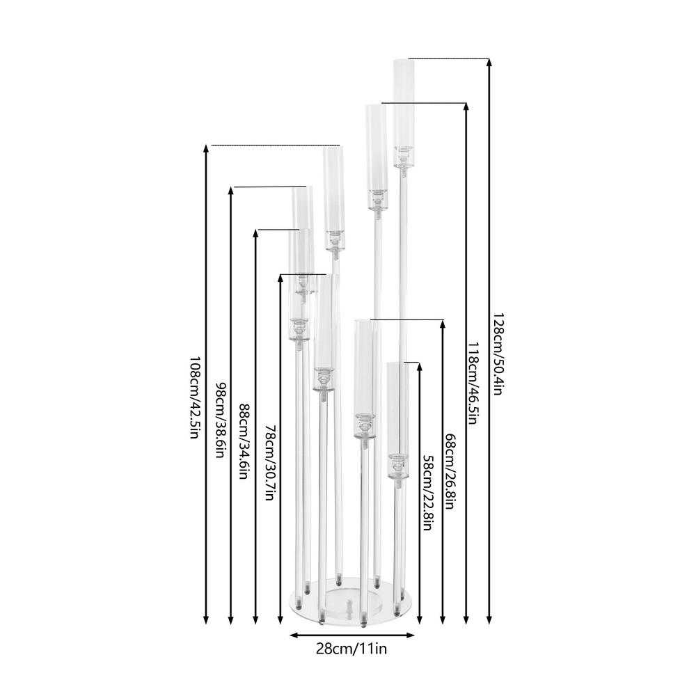 8-head Candle Holder Acrylic Clear Candle Stand for Wedding Birthday Party Decor Description Indulge in the luxury of a beautiful candle holder that illuminates your space and creates a serene ambiance for all your special occasions. The 8-head candle holder is not just a piece of decor but an expression of elegance that adds a touch of refinement to your homes, banquets, weddings, or any other space and occasion you desire. Key Features High-quality and Durable: Made of premium acrylic with an injection molding process, this product is less prone to wear and corrosion and can keep clear and beautiful for a long time. Exquisite Appearance: Straight candle holders of different heights can form an upward spiral, and clear acrylic makes them look crystal clear, simple, and modern and can adapt to various decoration styles. Elegant Decoration: The clear acrylic candle shades and pillars will refract brilliant light under the candlelight, making it a striking decoration for your banquet or dinner. Good Stability: The thick round base (11 inches) and solid pillars ensure good stability, allowing you to use this product without worrying about it shaking and tipping. Details 8 Heights: The candle holders in 8 heights can meet the use of different scenes and you can DIY assemble them to create different effects according to your own needs. Smooth Edges: The smooth and burr-free edges enhance the beauty of the product and better care for your skin when installing and cleaning it. Application It is suitable for candles measuring the diameter from 0.83 inches to 0.87 inches and can be used for a living room, dining room, kitchen, entryway, bar, family house, hotel, club, farmhouse, and other places, and can be used as decoration for weddings, festivals, engagement, parties, celebrations, candlelight dinner, hotel restaurant. Specification Color: Clear Style: Modern Shape: Round Material: Acrylic Process: Injection Molding Assembly Required: Yes Mount Type: Freestanding Applicable Candle Diameter: 2.1-2.2cm/0.83-0.87in Base Diameter: 28cm/11in Candle Holders Height: 58cm/22.8in, 68cm/26.8in, 78cm//30.7in, 88cm/34.6in, 98cm/38.6in, 108cm/42.5in, 118cm/46.5in, 128cm/50.4in Package Size: 105*45*11cm/41.34*17.72*4.33in Net Weight: 2.15kg/4.74lbs Gross Weight: 3.32kg/7.32lbs Package Included 1* 8-head Candle Holder Other Accessories for Assembly Notes Please note that this product is not resistant to high temperatures and can only be used with electronic candles (not included). Before first use, it is recommended to wash the product separately in warm soapy water, thoroughly rinse, and wipe dry with a lint-free cloth (not included). To achieve the best smoothness and transparency, a 50/50 vinegar solution (not included) can be used for cleaning, and then leave them to stand for several hours, then rinse clean and wipe them dry. The surface of the base has a protective film, please remove it before use. The edge of the candlestick is relatively sharp, please be careful not to be scratched. Please allow the slight color difference caused by the shooting light and 1-3cm error due to manual measurement, and make sure you do not mind before ordering. Payment Delivery details Terms of sales About us Contact us Payment We accept ebay payment 。 Fees such as import duties, taxes are not included in the item price or shipping costs. These charges are the buyer's responsibility. Delivery details Shipping: 2-9 working days to: USA Terms of sales We maintain high standards of excellence and strive for hundred percent customer satisfaction. Feedback is very important to us. We hope that you contact us immediately before you give neutral or negative feedback, so that we can address your concerns. It is impossible to address issues if we do not know about them! About us Your satis faction is our ultimate goal. We work hard to earn your trust and future business. Our certified technicians have tested each item before shipping. The unit comes with 1 year limited warranty on all manufacturing defects. a) If you receive a defective item, you may return it or ask for a discount. Please contact us within 14 days after you receive the package. b) What you returned must be intact and in its original packaging as re? u. Customer is responsible for shipping costs of the returned item. c) We will cover the cost of shipping back t with the shipping rate indicated in the registration page. We will send you a new unit or refund the full payment you paid. Thank you. Contact us Business Hour Business Hour: Monday To Friday: 8:30 AM to 5:00 PM (Beijing China time) Due to time zones, our reply to your questions may not be immediately. But within above working time, we will reply your email within 24 hours. If it's non-workdays, please kindly be patient and wait till Monday. Please contact us with ebay message. Please feel free to contact us if you have any questions. Monday To Friday: 8:30 AM to 5:00 PM (Beijing China time) Due to time zones, our reply to your questions may not be immediately. But within above working time, we will reply your email within 24 hours. If it's non-workdays, please kindly be patient and wait till Monday. Please contact us with ebay message. Please feel free to contact us if you have any questions. On Jan 21, 2026 at 19:35:37 PST, seller added the following information:
