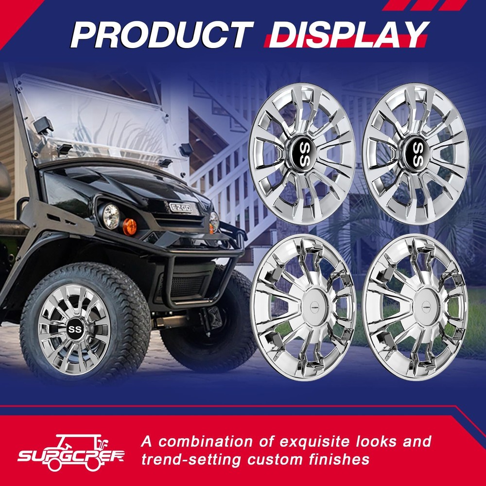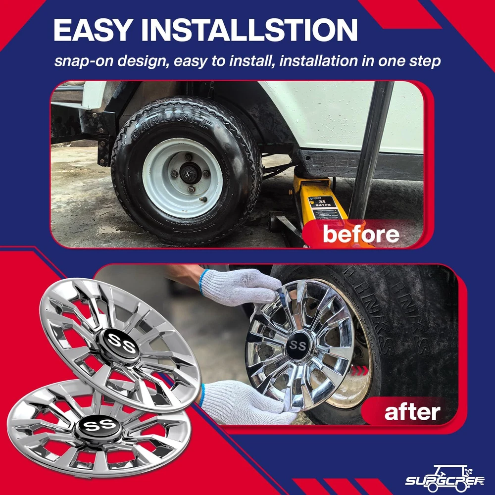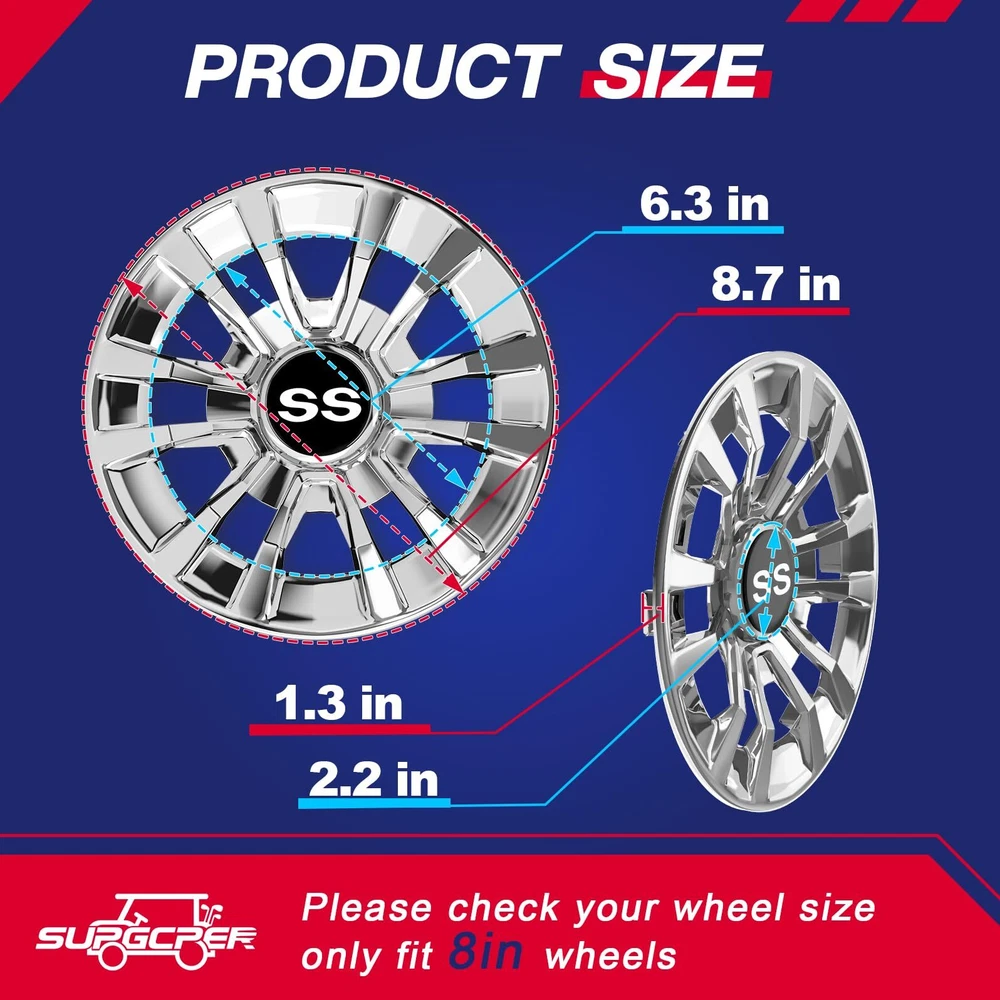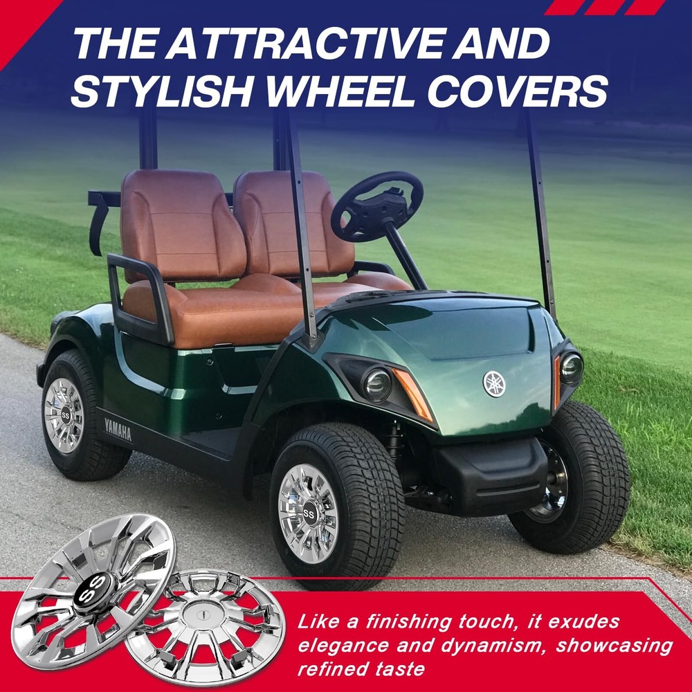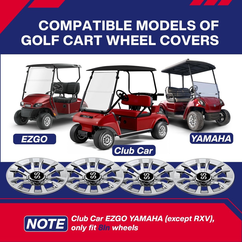 Golf Cart SS Wheel Covers, Golf Cart Hub Caps for Club Car EZGO Yamaha and Most Golf Carts, 6-Spoke Design, 8 Inch Golf Cart Wheel Hubcaps (Set of 4), Snap-on Installation, Not Fit EZGO RXV [Suitable Models]: Golf cart wheel covers hub caps compatible with EZGO Club Car YAMAHA (except EZGO RXV), only fit 8 Inches wheels [Consummate Craft]: Golf cart stylish wheel covers hub caps take chrome technology instead of spray paint treatment, scratch-resistant, 6-spoke design refresh your golf cart’s appearance, show off your personality [Quality Material]: Our golf cart wheel hubcaps are made of high quality and durable ABS material, using curing treatment with scratch-resistant, high gloss and long service life, exquisite workmanship brings ultimate enjoyment [Easy Installation]: Golf cart wheel cover hubcaps is easy to install and remove, all you need to do is click it into the right place, no need to bend the clips [Package Include]: Golf cart wheel covers package include 4×golf cart 8 Inches wheel hubcaps [Post-sale Service]: If you have any questions, our professional customer service team will respond promptly within 24 hours, devoted to provide perfect post-sale service Shipping We offer FREE shipping on all orders! We ship within Three business days of payment, usually sooner. We use a selection of shipping services such as UPS, FedEx, USPS etc. We only ship to the lower 48 states, no APO/FPO addresses or PO Boxes allowed. Local pickups and combined shipping options are not provided at this time. Return You can return a product for up to 30 days from the date you purchased it. Any product you return must be in the same condition you received it and in the original packaging. Please keep the receipt. Payment We accept payment by any of the following methods: PayPal Please pay as soon as possible after winning an auction, as that will allow us to post your item to you sooner! Feedback Customer satisfaction is very important to us. If you have any problem with your order, please contact us and we will do our best to make you satisfied. Contact Us If you have any queries, please contact us via ebay. We usually respond within 24 hours on weekdays. Please visit our eBay store to check out other items for sale! Thank you for shopping at our store.