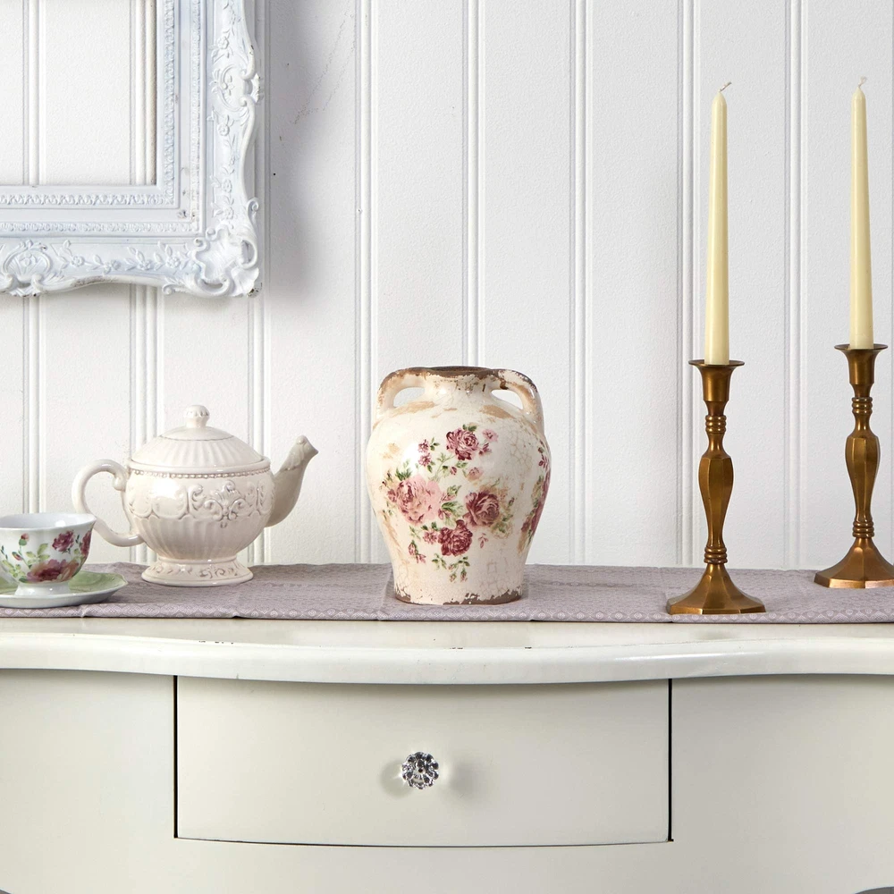 Arrange your faux-bulous flowers in this floral design jar (set of 1). The vintage ceramic planter has a homey feel with its palette of pinkish flowers against a rugged backdrop. DIY and have fun mix-matching for a country chic look that delivers that fresh farm to home style. No drainage holes and indoor use only. You may have noticed that we pay particular attention to the vessels our arrangements come in. Use this vase to plant your own creations, or simply display them empty - they really are that impressive. ELEGANT DESIGN: Arrange your faux-bulous flowers in this floral design jar (set of 1). The vintage ceramic planter has a homey feel with its palette of pinkish flowers against a rugged backdrop. DIY and have fun mix-matching for a country chic look that delivers that fresh farm to home style. No drainage holes and indoor use only. CRAFTED FROM QUALITY MATERIALS: This vase is made of Ceramic ensuring durability and longevity, making this not only functional, but also provides the perfect vessels for displaying your favorite blooms or greenery DIMENSIONS & SIZE: 6.5 in. W x 6.5 in. D x 8 in. H; Container Volume: 5.85 Qt. Our collection of planters and vases comes in a wide range of sizes, ensuring that you find the perfect fit for your plants and decor VERSATILE DECORATION: Decorating made simple with our versatile home décor that will add style to any room in your house. This vase allows you to achieve an effortless country chic look. No drainage holes and indoor use only. NOTE: For decorative purposes only, not food safe EASY TO MAINTAIN: Cleaning and maintaining this vase is a breeze. Simply wipe them down with a damp cloth to remove dust or dirt. The smooth surface prevents stains and makes it easy to keep them looking pristine. Upgrade your home decor with our exquisite vases and planters. Their elegant design, versatility, high-quality materials, perfect size, and ease of maintenance make them the perfect addition to any space.