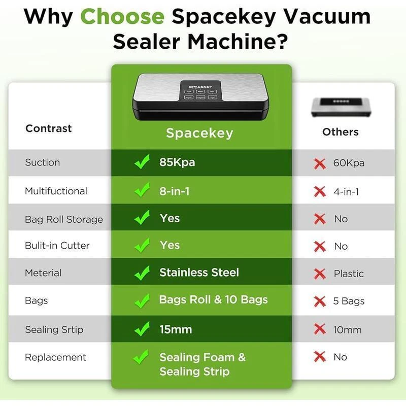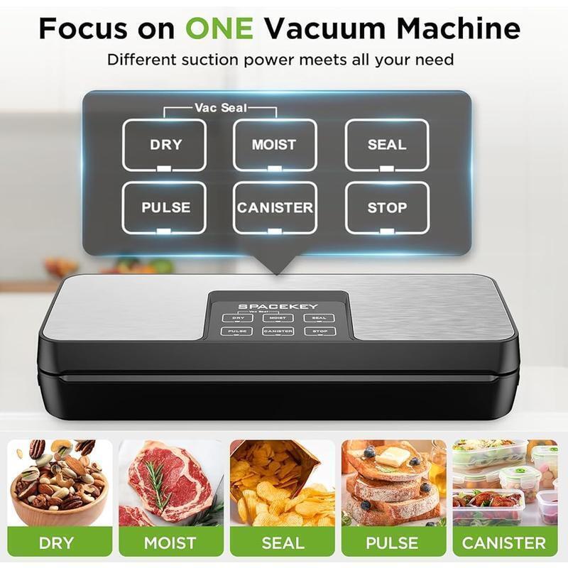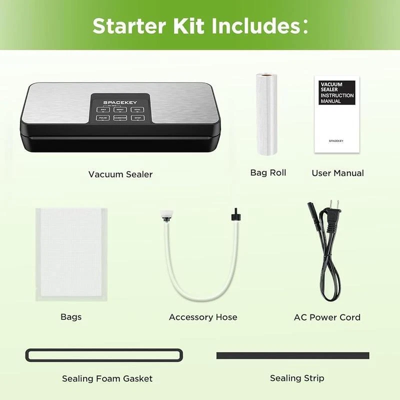 8-Pcs 17Qt Snap Top Clear Plastic Storage Tote Container Organizer Bin Box Gray 31.21 USD Free shipping 4 Tier Fabric 16 Pairs Shoe Organizer 16 Compartment Shoe Racks Storage Shelves 32.46 USD Free shipping Wide 3 Drawer Cross-Weave Tower Cement DRESSER CHEST CABINET for Living Room NEW 33.63 USD Free shipping 13.2 Gallon Trash Can Plastic Motion Sensor Kitchen Trash Can Garbage Can Home 42.0 USD Free shipping 16 QT Laguna Hard Sided Ice Chest Roller Cooler for Picnic Beach Camping Travel 34.82 USD Free shipping 12V Max Cordless Variable speed Impact Driver with 1.5Ah Battery and Charger NEW 43.65 USD Free shipping 12V Max Lithium-Ion Cordless Variable speed Impact Driver 1.5Ah Battery/Charger 43.65 USD Free shipping Rechargeable LED Headlamp Weatherproof Drop Resistant Work Light Bar Headlight 37.45 USD Free shipping Socket Set 1/4" Drive Socket &Ratchet Set 6-Point Socket &Ratchet Set 54 Pieces 34.74 USD Free shipping Grain-Free Chicken & Pea Recipe Dry Dog Food 24 lbs for Dogs of All Life Stages 43.62 USD Free shipping NEW Aquarium Fish Tank Filter for Aquariums 20-40 gallon Tanks 3-step Filtration 40.87 USD Free shipping Floodlight Max Solar Power LED Flood Light Motion Activated Solar Outdoor Light 37.42 USD Free shipping About this item Multifunctional in 1: Spacekey Vacuum Food Sealer is designed with multiple modes to provide your food with best possible preservation based on your different types of food. You can also reseal bags of rolls, chips and snacks that you only want to seal. The CANISTER function for vacuuming canisters, jars, or wine bottles 85KPA Strong Suction: Our vacuum sealer suction has increased to 85kPa. 130W full copper motor, higher-quality heating wire, making it easier and quicker to vacuum all kinds of food within 10-20 seconds Bag Roll Storge Space: The Vacuum Sealer Machine built-in bag roll storge space, fits up to 11'' width vacuum sealer bags and rolls. Compact size and lightweight design are easy to store and move around. And come with a sliding cutter, you could get a smoother customized bag by just cutting it Keep Food Fresher: Storing with the food seals keep your food fresh 10 times longer than ordinary storage methods in the freezer. Keep clean, tidy and no weird smell in the refrigerator. It is also help you to prep meals faster and more convenient, avoid waste, save your time and money Easy to Operate and Clean: Spackey sealer machine designed with stainless steel panel, LED indicator lights, electric plug in and the control center placed on the top panel provides a user-friendly for operate. Removable cover slabs and drip tray are designed to help you place the bag in the air chamber correctly and clean the vacuum sealer easily Widened Heating Strip: It's designed to widen the heating strip up to 15mm with strengthen sealing material, ensuring much more tight, durable and steady sealing effect. There is an extra heating strip replacement in the package Full Starter Kits: You will receive 1x vacuum sealer machine, 1x vacuum rolls (9. 8"x9. 8'), 10x pre-cut bags (BPA free, 7. 8"x9. 8"), 1x user manual, 1x Air suction hose, 1x AC power cord, 1x sealing gaskets, 1x Sealing strip. If you have any questions with the food sealer machine, please tell us, we will help until your problem is solved with a satisfying result › Material: Stainless Steel Color: Silver Product Dimensions: 16. 19"L x 7. 8"W x 4. 68"H Item Weight: 4. 5 Pounds You may also like Portable 50 Watts 12 Inch Oscillating Table Fan Lightweight 3-Speed for Home US 41.21 USD Free shipping 12 Gallon Trash Can Plastic Slim Lockable Step On Kitchen Trash Can Gray 32.43 USD Free shipping 25ft 10/3 30-Amp Extension Cord Weather Resistant RV and Marine Boat Power Cord 90.97 USD Free shipping Heavy-Duty Stacking Shelf Rack Home Storage Organizer Adjustable for Adult Use 28.17 USD Free shipping Step Stool Indoor/Outdoor Platform Stepping Stool with Slip-Resistant Top 440lb 25.38 USD Free shipping Multi-Surface Satin Acrylic Craft Paint Set 12 Colors 2-oz Arts Crafts Satin 31.96 USD Free shipping Leakproof Stackable Food Storage Containers 10 Piece Set Microwave Safe BPA Free 28.68 USD Free shipping Gas N Go Mower Toddler Push Toy Bubble Blowing Lawn Mower For Kids Boys Girls US 34.27 USD Free shipping 2-in-1 Stairway and Hallway Baby Safety Gate with Mounting Kit Ages 6-24 Months 43.7 USD Free shipping 3-Speed Oscillating Pedestal Fan w/Adjustable height Black for Home US New 41.02 USD Free shipping Versatile Light Duty Fence Welded Wire Rolled Wire Fencing 24in x 15ft 1x1in US 34.82 USD Free shipping 300TC Cotton Rich Percale Easy Care Adult/Teen Fitted Sheet Blue Cove King US 28.25 USD Free shipping