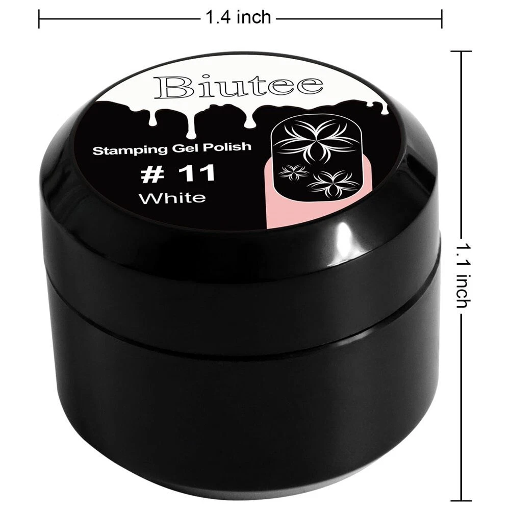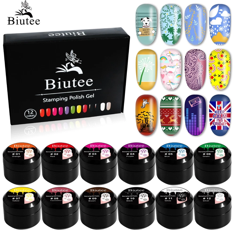 12Color 8ml Stamping Gel Nail Polish Painting UV Led Gel DIY Stamping Image Print Nail Art Design For Manicure Nail Gel Polish Feature: 1.from natural resin, low smell, NON-TOXIC.lets you stop worrying about hurting to your health. 2. Each color will meet with different patterns,it also can improve your DIY skill.Comes packed in exquisite gift box, a perfect gift for her. 3.Need to be cured under LED/UV nail lamp. TIME: Average for LED light 60-90 secs, UV light 2-3mins. 4.Using the stamping polish gel with Biutee nail stamping plate set will do better work to your nail. 5. 12 Pcs with different colors 8ML (Orange,Red,Pink, Purple,Blue,Green,Yello,PalevioletRed,Brown,Black,White,sliver). Specification: Brand: Biutee Quantity: 6/12 Bottle Capacity: Approx. 8ml Color: As the picture shows Package : 6/12 Color kit with box Why Choose Our Gel Polish? 1.It made of healthy, environmental, friendly, no poisonous, pungent chemical materials. 2.It is quick drying with any UV Light. 3.Long lasting for at least 15 days, fantastic and super bright nails for you. 4.This nail gel polish is easy to apply and soak off. 5.Allow you for professional or home nail art design. 6.A professional nail art gift for yourself or your girlfriend. How To Use Our Gel Polish? Step 1. Clean Nails then clip nail surface as normal nail art process. Step 2. Fully shake up the gel polish, it can make the gel polish color balanced. (Important) Step 3. Apply Base Gel first,which can make gel polish lasting longer, cure with UV lamp or LED lamp. (Necessary) Step 4. Apply first layer of color uv led gel directly, cure with UV lamp for 2 minutes or cure with LED lamp for 60 seconds. Step 5. Apply second layer of color gel and then immediately cure with UV lamp for 2 minutes or cure with LED lamp for 60 seconds. Step 6. Coat with no wipe gel top coat,cured by UV lamp or LED lamp. Gentle Tips: Avoid all skin contact. If redness or other signs of adverse reaction occur, discontinue use immediately.