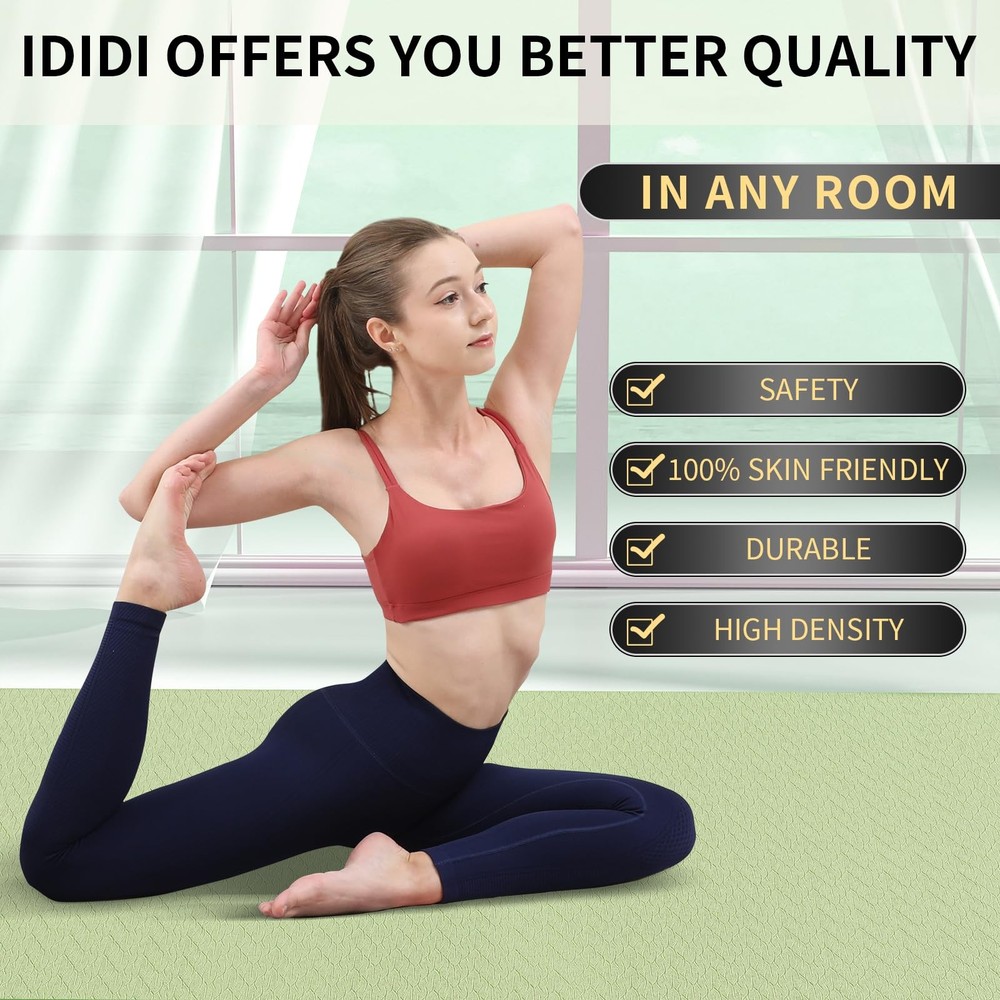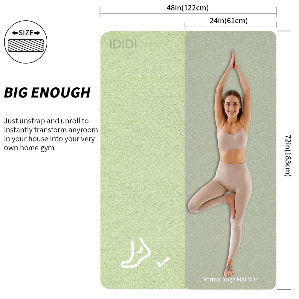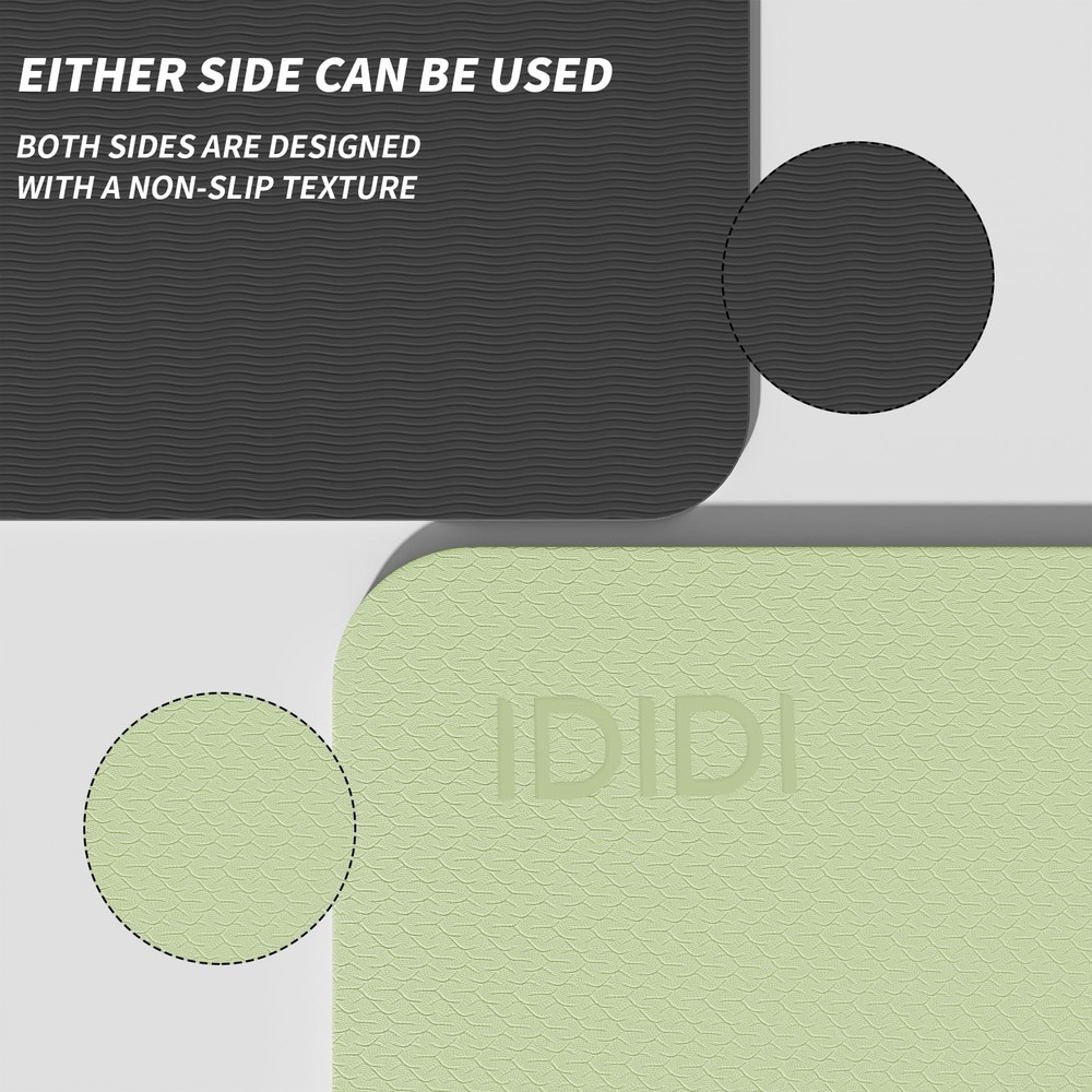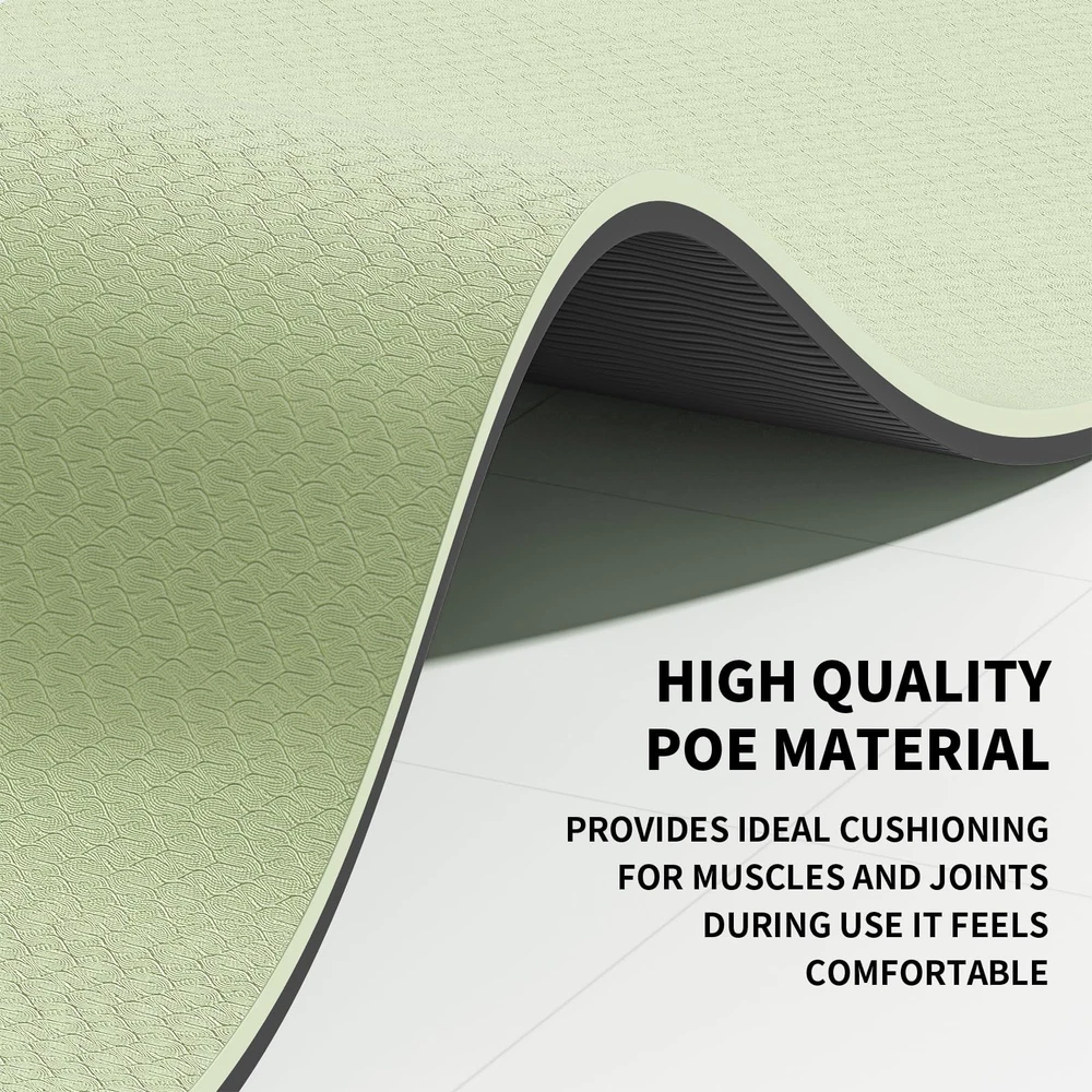 The POE yoga mat is a truly eco-friendly and odorless option. It is softer, lighter, more elastic, and more comfortable compared to TPE yoga mats. However, due to prolonged storage in a rolled state, the inner end of the mat might temporarily remain curled when first unrolled. Don't worry - simply reverse fold that end before use, then lay it flat for practice. After a few days of use, the mat will gradually flatten out completely. The POE yoga mat is a truly eco-friendly and odorless option. It is softer, lighter, more elastic, and more comfortable compared to TPE yoga mats. However, due to prolonged storage in a rolled state, the inner end of the mat might temporarily remain curled when first unrolled. Don't worry - simply reverse fold that end before use, then lay it flat for practice. After a few days of use, the mat will gradually flatten out completely. High Elasticity POE Yoga Mat - Superior Support and Comfort: This high elasticity yoga mat, measuring 72 x 48 x 0.32 inches, provides exceptional support and cushioning for all types of yoga and Pilates exercises. Non-Slip Surface for Safe and Stable Workouts: Featuring a textured non-slip surface, this high-density yoga mat provides excellent traction and grip, preventing slips and injuries during intense workouts. Perfect for maintaining stability in all types of yoga poses, from beginner to advanced levels. Lightweight and easy to store - this yoga mat weighs just 2.3kg, so you can simply roll it up and take it to the gym, office or home with our special yoga mat strap. Also suitable for outdoor hiking and camping. Reversible Yoga Mat - Our premium yoga mat has a reversible texture design to suit different personal preferences and a variety of exercise routines including yoga, Pilates, stretching and other barefoot floor exercises.