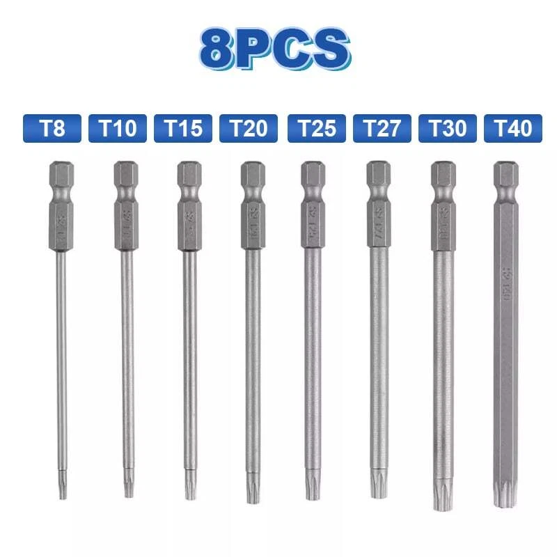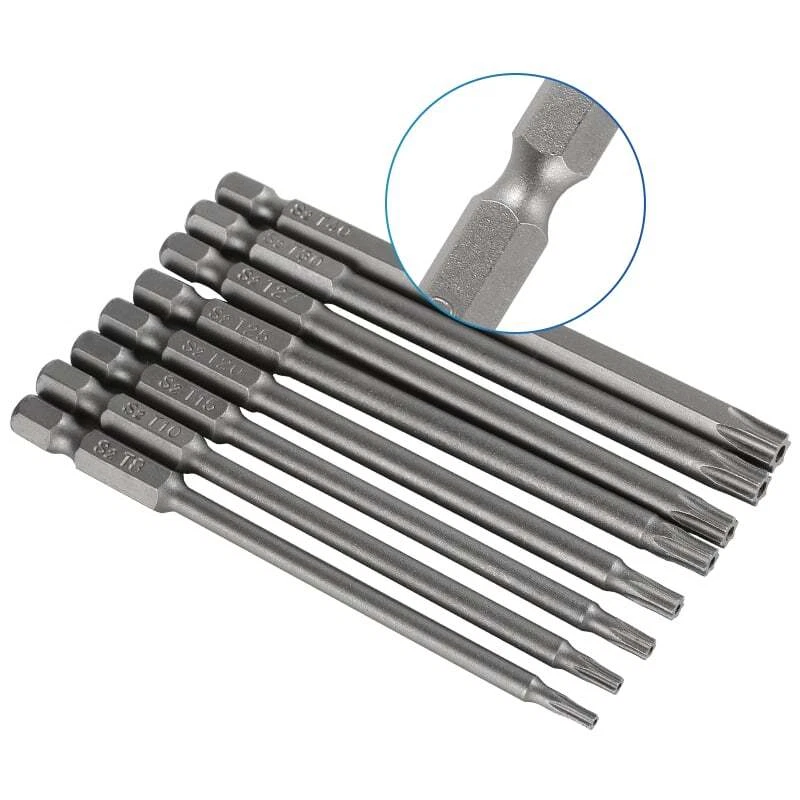 This Torx screwdriver bit set is a game-changer! The extra-long 100mm bits made from durable S2 steel provide excellent grip and precision. The strong magnetic tips hold screws securely, making DIY projects so much easier. Perfect for tight spaces, these bits fit snugly into screws without stripping them. The set includes all the common sizes I need, and the hex shank works flawlessly with my drill. Great quality at an affordable price—highly recommend for anyone tackling electronics, furniture, or automotive repairs!