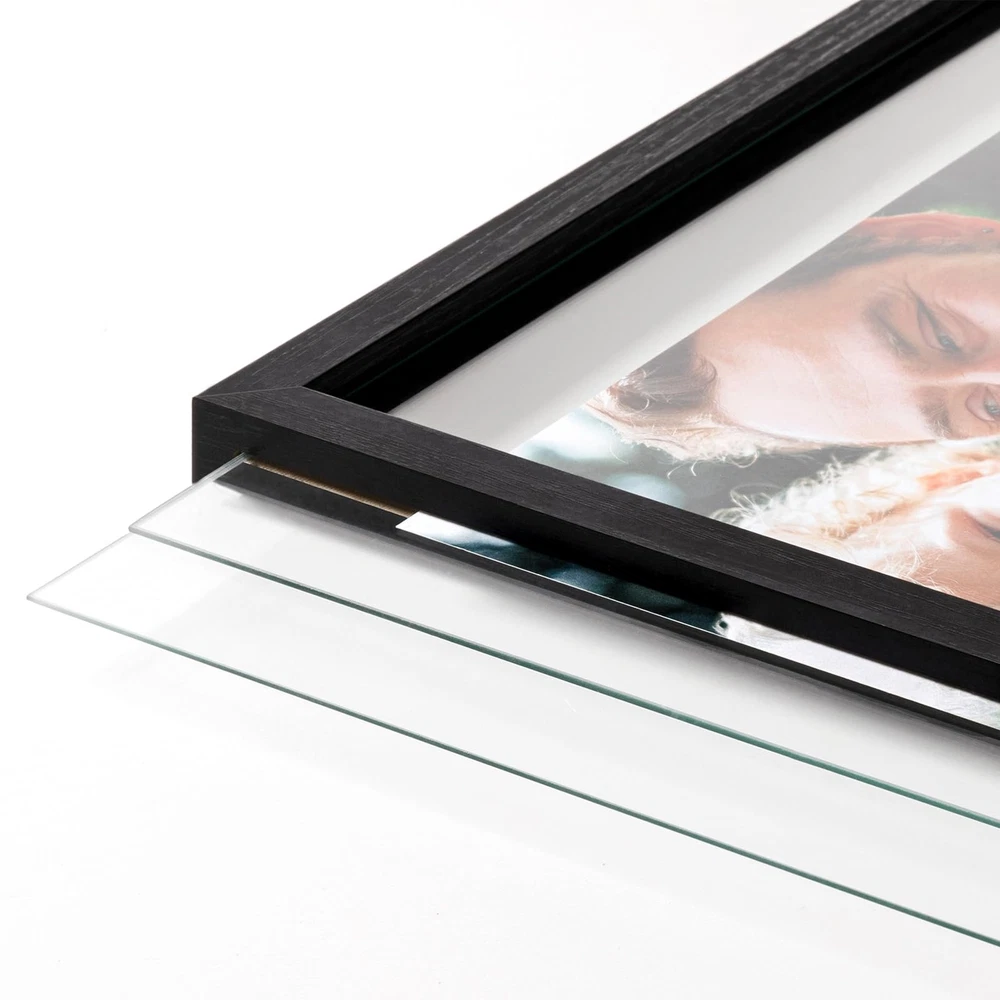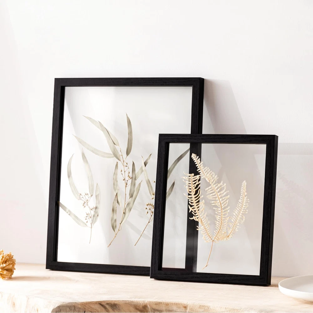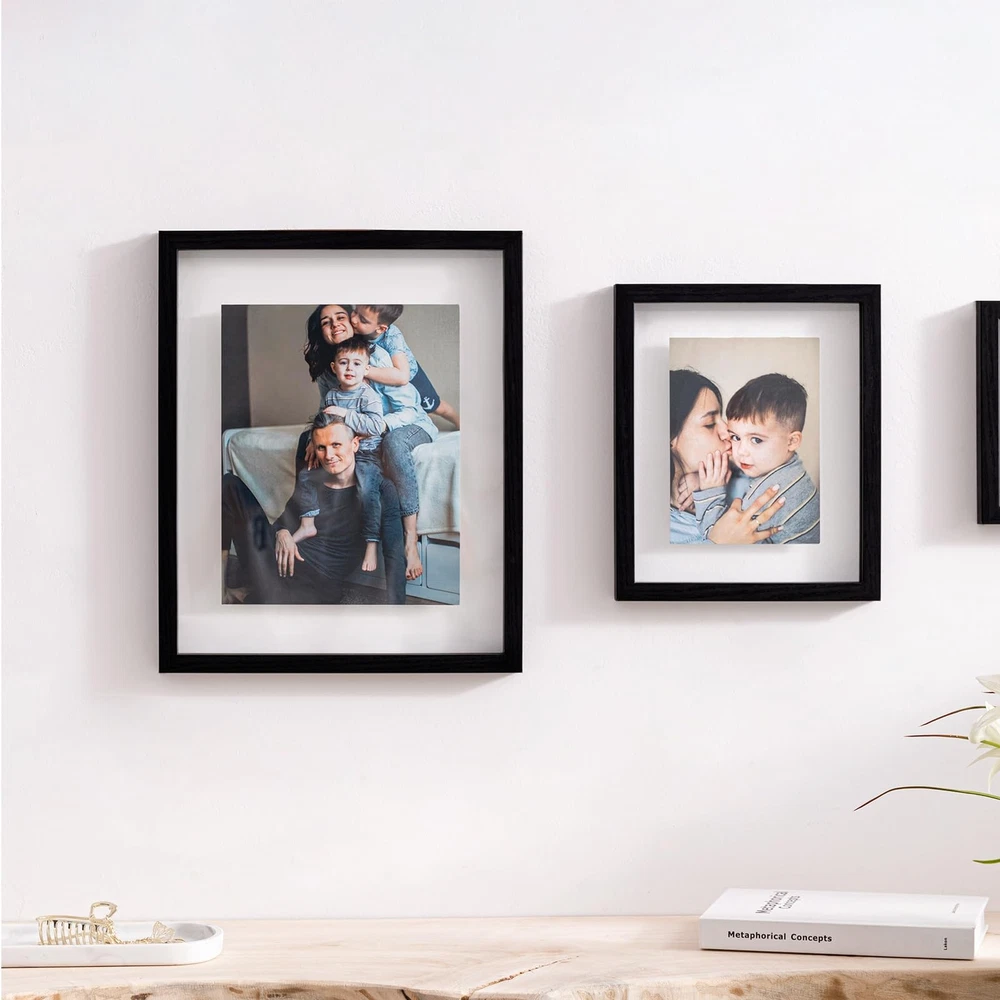 Floating picture frame Size: 8 x 10 inch Color: Black Multi Size: 8x10 floating picture frame has two pieces of reinforced glass, allowing you to float display 3.5x5, 4x4, 4x6 and 5x7 photos for the see-through floating effect. Or display 8x10 photo without the floating effect Design: These floating frames have two pieces of glass, which can perfectly display and protect your photos, and can insert 2 photos back to back at the same time Multi-Function: Our floating photo frames are great for displaying pressed flowers or plants, pictures, artworks, certificates, diplomas, documents, prints, postcards, and more Easy to Install: Floating picture frames are a breeze to set up - simply clamp your photos, flowers, certificates, artworks or other mementos between the two pieces of glass and insert them into the frame Thoughtful Accessories: Glasses cloth used to wipe the glass to avoid dirty glass, foam pad used to prevent the glass from slipping