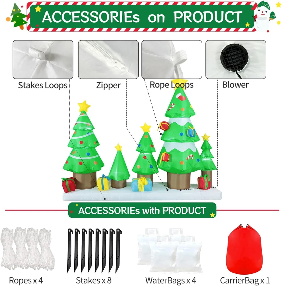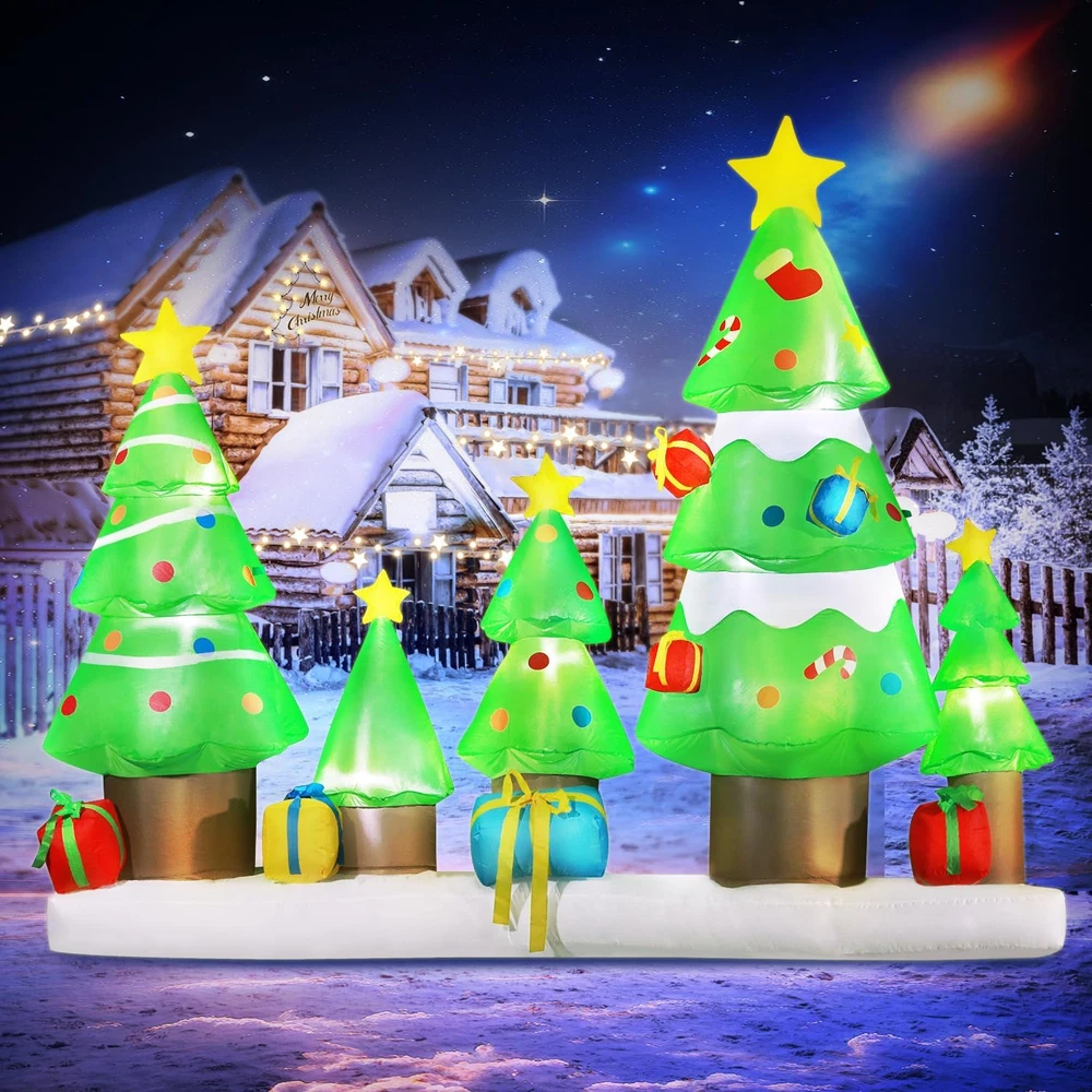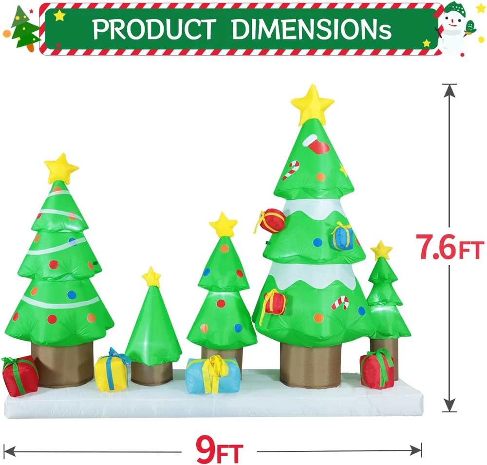 Menu Other Items Feedbacks About Us Contact Us Add To Favorites 9 FT Long Huge Christmas Inflatable Tree Set Outdoor Decoration with Gift Boxes, LED Lights Holiday Blow up Yard Decoration for Holiday Party Garden Yard Lawn Winter Decor 【Huge Size 】:Capture the spirit of the season with this inflatable Trees.Plug in the power and you will get a huge inflatable Tree Set Decoration, it will add luster to your lawn or backyard. 【Excellent Craftsmanship】:The inflatable decor is made of double-coated high-quality fabric.Excellent stitching improves the durability of the inflatable decoration.Powerful blower combined with high-quality fabrics, enough to make Trees plump after being inflated. 【Stable Enough】:Self-inflates and deflates, Just plug in this christmas inflatable built-in fan and fix it on the ground.The stable base design ensures that the inflatable tree is stable enough to stay standing in the wind. Don't worry this inflatable decoration will be blown away by the wind. 【Bright Lights】:Built-in LED lights, Bright LEDS light up your lawn with joy, this unique outdoor decoration will add fun and color to your outdoor holiday decoration. 【High-quality service】:Should you have any inquiries, please don't hesitate to reach out to us via the "Contact Seller" option. We provide exceptional after-sales support, including free power replacements within 365 days of purchase. Your satisfaction is our utmost priority. Product Description The video showcases the product in use. The video guides you through product setup. The video compares multiple products. The video shows the product being unpacked. 2024 New Santa with Reindeer Size 10FT Long Size 12FT Long Size 12FT Long LED Lights 10 PCS LED Lights 6 PCS LED Lights 8 PCS Item Specification Item Weight 4.55 pounds Item model number Christmas Tree Cluster Product Dimensions 16.54 x 7.87 x 11.42 inches Country of Origin China Dimensions Shipping Returns Additional Info Product Dimensions: 7.87 inches x 16.54 inches x 11.42 inches. Weight: 4.55 lb Fast shipping is very important for us. Our standard shipping service is FREE. Your order will be shipped within 1-3 business days upon full payment received. Most items are delivered within 3-5 business days, however, please allow 3-10 business days. We are shipping only to USA. We only ship to the confirmed Paypal address. We reserve the right to cancel any order for any reason at any time. We are not responsible for undeliverable addresses. We offer a 30 day return policy from checkout winning date. Your satisfaction is guaranteed! If for any reason you are unhappy with your item, just return it within 30 days for a full refund, minus shipping cost. Please contact us prior to initiating a return so that we can issue you a refund authorization. Items defective upon receipt must be packaged in their retail packaging as if new and returned with a detailed description of the problem. Return shipping fees are not refundable. We reserve the right to decline any returns if the above guidelines are not followed. All of our items, unless otherwise stated, will only run on 120 volts. Please check to make sure your country complies with these specifications. If you have a problem or question regarding your transaction please contact us before leaving any type of feedback. We will work with you to resolve any problem you may have.