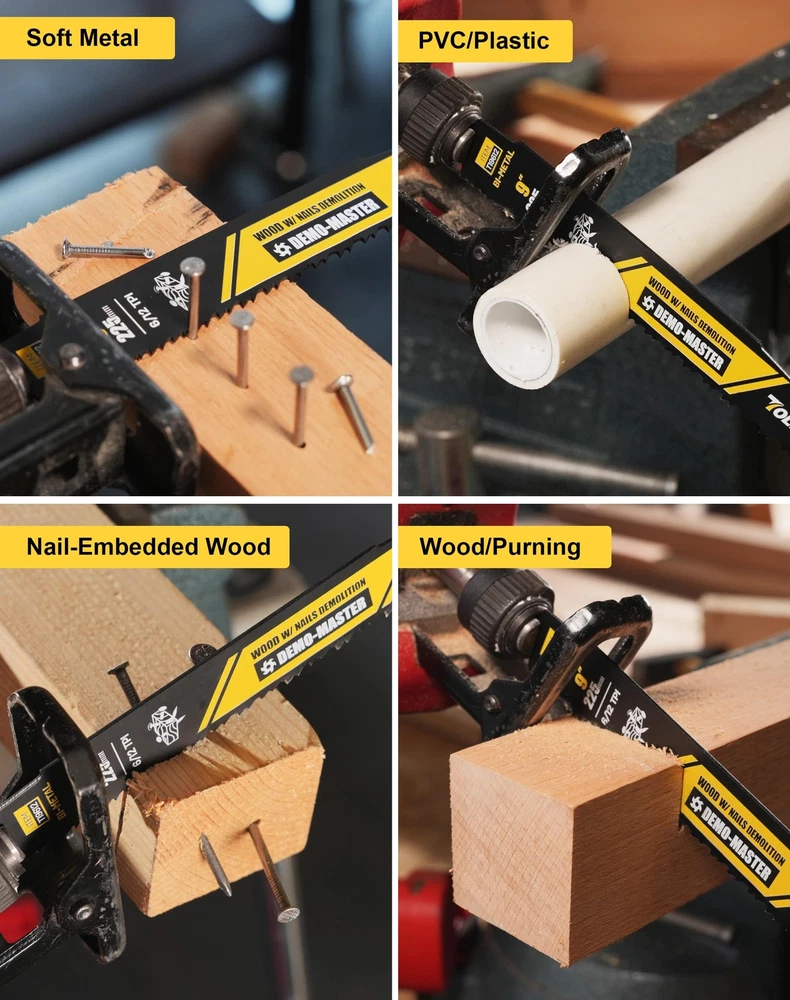 Excellent Cutting Performance: Bi-Metal 6/12T Reciprocating Saw demolition Blades are specifically designed for maximum performance in nail-embedded wood applications. when we trim wood containing nails such as abandoned fences, no longer have to worry about nail damage to the saw blade or frequently replace different kinds of reciprocating saw blades. Fast &Accurate Cutting : Designed with variable teeth, provides faster cuts with less vibration, Ensures optimal cutting performance on materials of varying hardness and thickness. High Strength Thickened Saw Blades: Unlike other bi-metal saw blades, constructed by high-density bi-metal with extra 8% cobalt, and 1.27mm thickness is thicker than many saw blades on the market, which means it has longer life span. More importantly, this will effectively reduce the risk of sudden blade breakage during cutting. Versatile Applications: Ideal for a wide range of materials including wood (with nails), common lumber, PE/PVC, OBS plywood, nails, screws, tires, wooden fences, plastic, and metal demolition, making them indispensable in various everyday tasks. Universal Shank Compatibility: Compatible with major reciprocating saw brands such as Bosch, Dewalt, Milwaukee Sawzall, SKIL, Makita, Black & Decker, Ryobi, Porter Cable, Hitachi, Flex, Hilti, and more, ensuring versatility and ease of use across different tools.