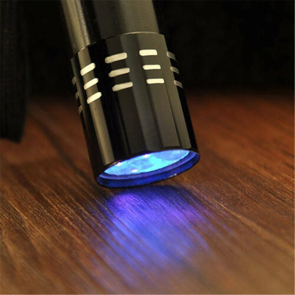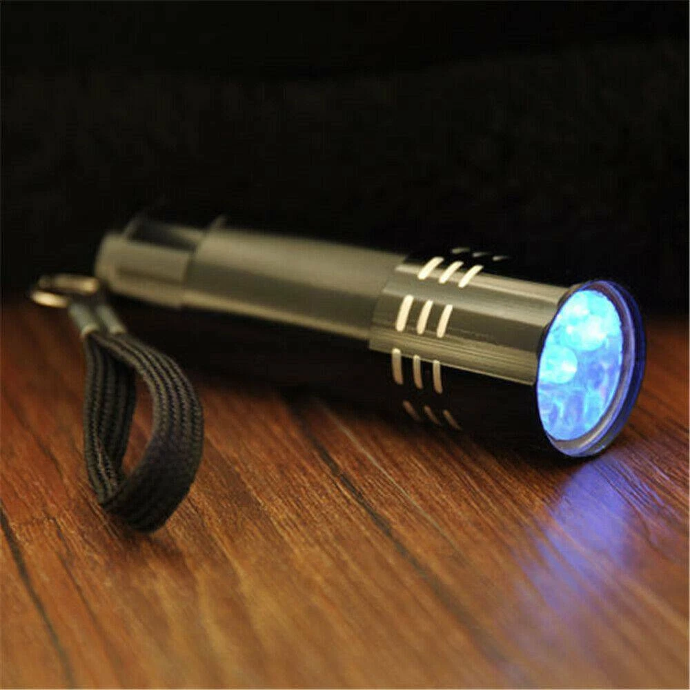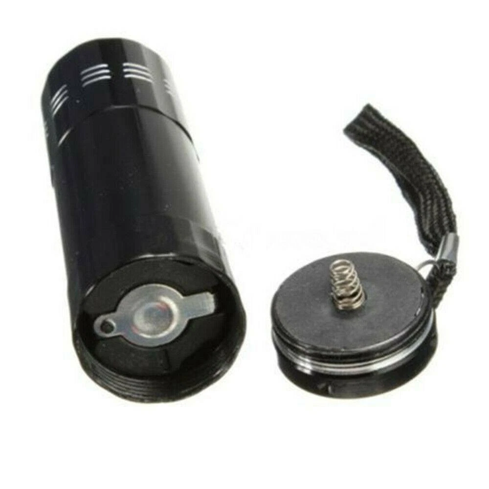 9 LED UV Torch Ultra Violet Flashlight Blacklight Lamp Camping Money Checker USA Description: Feature: Condition: Brand New Flashlight Color: Black Light color: Purple Material: Aluminum Size: 8 * 2.3cm Light bulb type: UV Light Note: Blacklight Flashlight=Ultra Violet Flashlight Switch type: Both Press on and press off type You need 3 x AAA Alkaline batteries in order to open the lamp (not included) Feature: 9 LEDs UV Light, energy conservation, ultra bright, Lighting for a long distance The strong and lightweight aluminum case made for the Flashlight So light for the weight of the lamp that you can compact and easy to carry Can be used on rainy days, because of the water resistance design Great for checking notes, credit cards, fluorescence inks (invisible inks), cracked glassware, or even crime scene, ect Weight: 27 g Package Includes: 1 X Flashlight Note: 1. Some pictures look bigger, please refer to the exact item size. 2. Please note that due to lighting effects, monitor's brightness and contrast settings, the color of the products may vary slightly between our photos and the item actually received. 3. We thank you for your understanding.