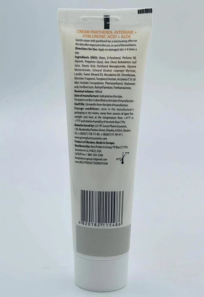 9% Intensive Panthenol Cream with Aloe Vera & Hyaluronic Acid | Deep Moisturizing, After Sun & Tattoo Care, Hair Transplant for All Skin Types, 3.4 Oz/ 100 ml - Buy Now with Fast Shipping! 9% Intensive Panthenol Cream with Aloe Vera & Hyaluronic Acid | Deep Moisturizing, After Sun & Tattoo Care, Hair Transplant for All Skin Types, 3.4 Oz/ 100 ml Product Details Brand: GPC GREEN PHARM COSMETIC Item Volume: 100 Milliliters Item dimensions L x W x H: 2.76 x 1.57 x 1.57 inches Age Range (Description): Adult Special Feature: Aromatherapy Product Dimensions : 2.76 x 1.57 x 1.57 inches; 3.53 ounces Manufacturer : GPC GREEN PHARM COSMETIC Country of Origin : Ukraine Key Features ✅ HYDRATION: 9% Panthenol with Hyaluronic Acid - Immediately soothes irritated skin, intensive moisturizing for dehydrated, sensitive skin. Ideal for daily hydration and skin recovery. Suitable for all skin types, including sensitive. Has a cooling moisturizing effect on the skin after sun exposure. ✅ WOUND CARE: Strong calming effect for Sensitive Skin / Dehydrated Skin. D-panthenol cream soothes skin in case of thermal burns. Vitamin B cream for face acts as softening, soothing moisturizer. ✅ TATTOO AFTERCARE: Protects & Maintains - Ensures healthy skin recovery after tattoo procedures, maintaining ink clarity and skin hydration. ✅ BABY CARE:Safe and gentle formula for baby's skin, effectively soothing and treating and sensitive skin conditions. ✅ AFTER-SUN CARE: Soothing Panthenol Instantly calms sun-exposed skin with a cooling effect, deeply hydrates, and supports natural skin recovery for a refreshed, healthy glow. Product Description