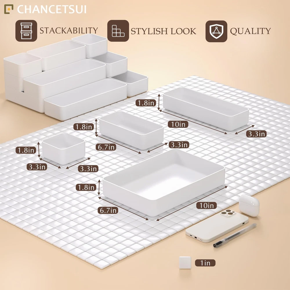 【9 Pcs Set】 These versatile stackable drawer organizer set are perfect for any place in your office or home. Package includes : 3.35 x 3.35" (2 pcs), 3.35 x 6.6" ( 2 pcs), 3.35 x 10" (4 pcs), 6.6 x 10" (1 pc). 【Sturdy and Durable】The desk drawer organizer trays set are made of durable PET plastic, ensuring a long life of use. Drawer organizer bins are break-resistant and could accommodate different items keeping the organiser nice and steadily stacked. 【Stackable and Space Saving】These stackable drawers are designed to save space, which can be used together or separately, so that you can efficiently organize your desk drawers and space. The drawer organizers can save your time to organize and find your stuff. 【Personalized】The variety of trays ensure there is a organiser for all your needs. You could use them individually or creative your own unique combo by stacking up the trays according to your needs and desire. Creating maximum storage with minimum spaces. hard to break, specially when stacking up heavy trays, keeping the organiser nice and steady. These trays can go a long way. 【Multifunctional Trays】The multi size tray set offers a wild range of storage spacing to fulfil your every needs. Fit all kinds of drawers, such as vanity / bathroom / kitchen / office drawers, ideal for organizing tools, office supplies, craft supplies, makeup tools, utensils, etc