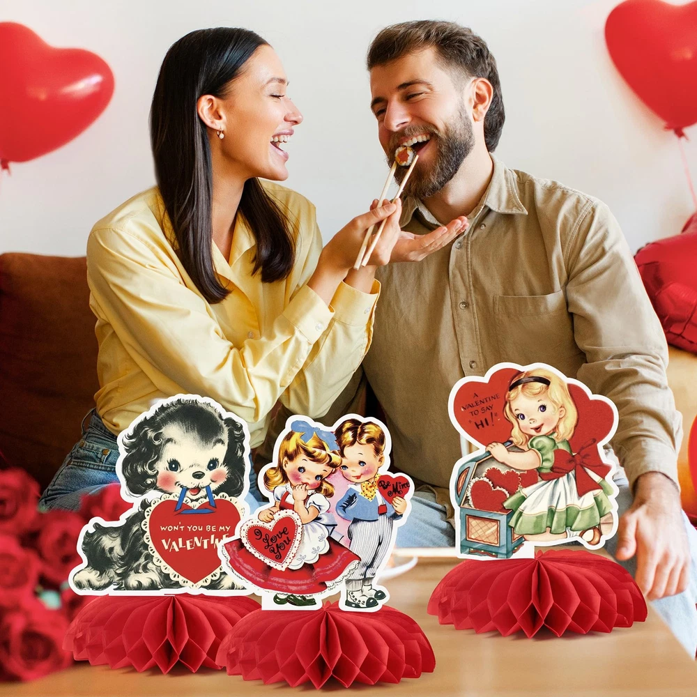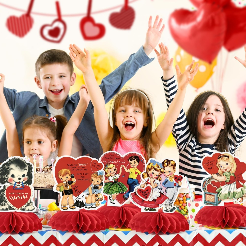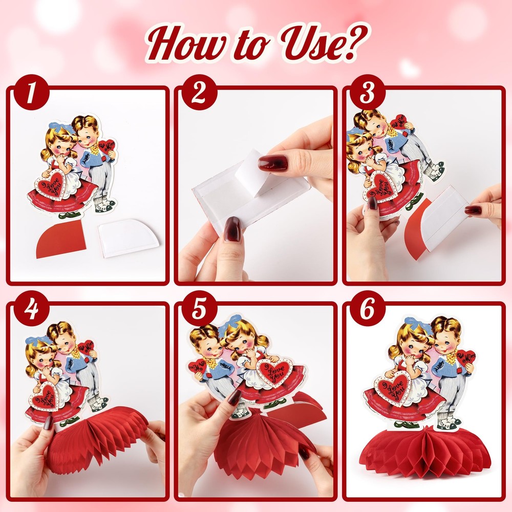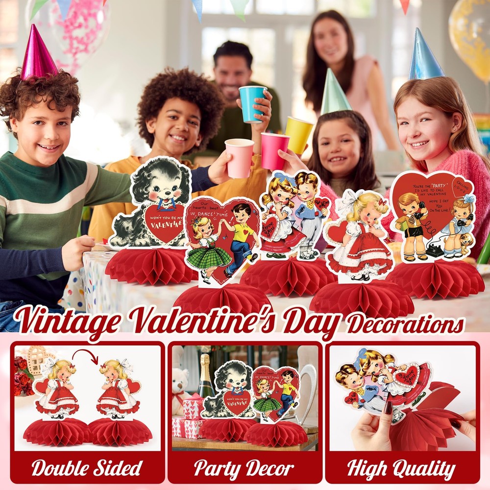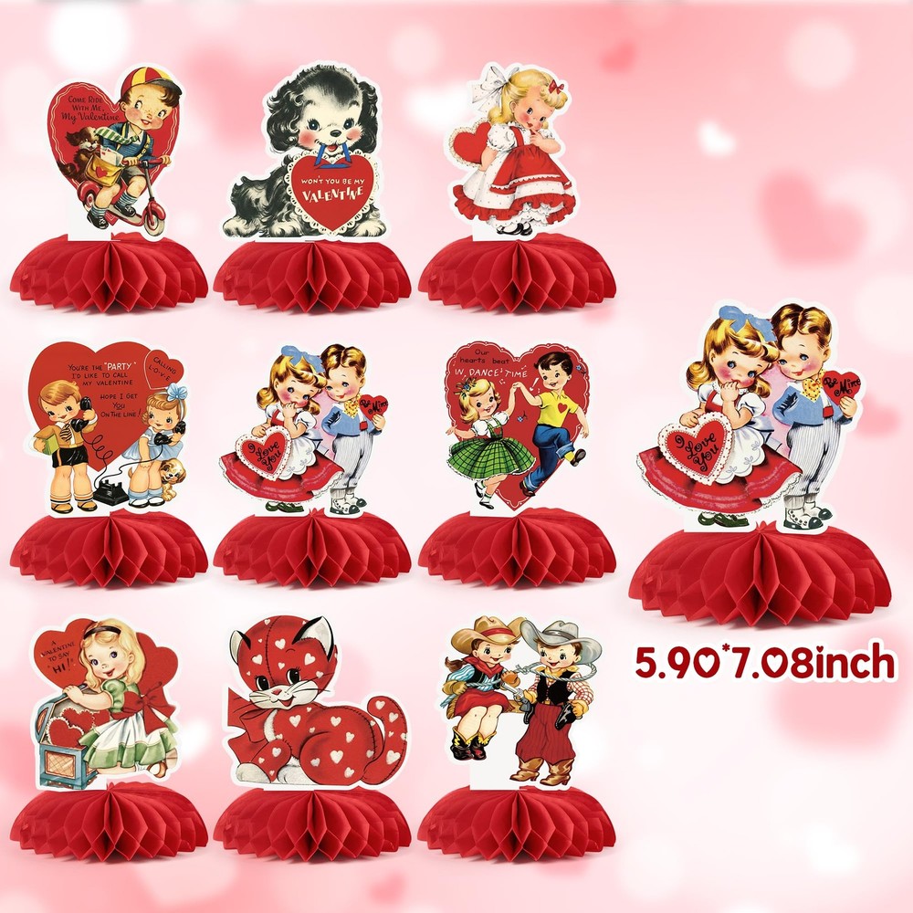 9 Pcs Vintage Valentine's Day Decorations Retro Red Heart Honeycomb Centerpieces Antique Victorian Style 3D Table Toppers Sign Decor for Classroom Wedding Anniversary Bridal Shower Party Supplies Product Details Vintage Valentine Charm: Each centerpiece features Victorian-style illustrations—sweet couples, playful pets, and adorable red-heart—bringing a warm, retro Valentine feel to any celebration. Perfect for those who love antique graphics and classic holiday decor. Striking 3D Honeycomb Table Toppers: This set includes 9 unique decorations with bright red honeycomb bases. Once opened, they form vivid 3D shapes that add depth and dimension to tables, dessert bars, or photo backdrops, creating a festive display. Durable & Reusable: Made from premium cardstock and honeycomb paper, sturdy enough to maintain its shape for multiple uses. Store flat after use for next year’s celebration, making it long-lasting. Simple DIY Assembly: Each centerpiece is lightweight and foldable, letting you enjoy the hands-on fun of decorating. Simply unfold the honeycomb shapes and place them on your table—no tools needed, just your creativity! Versatile for Any Celebration: Ideal for Valentine’s Day, weddings, anniversaries, bridal showers, romantic parties, classroom events, or dessert tables. Adds instant festive charm to any space, large or small.