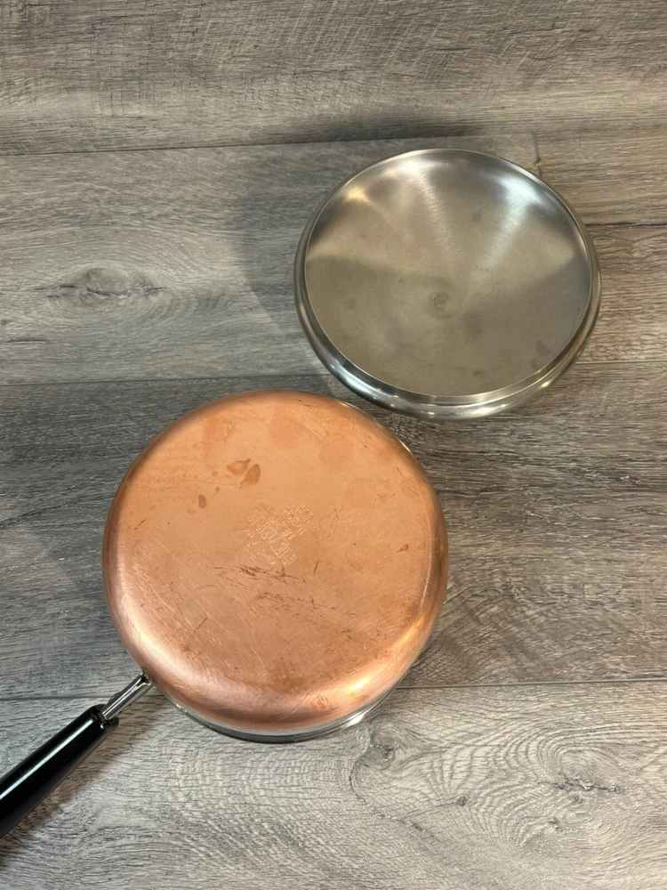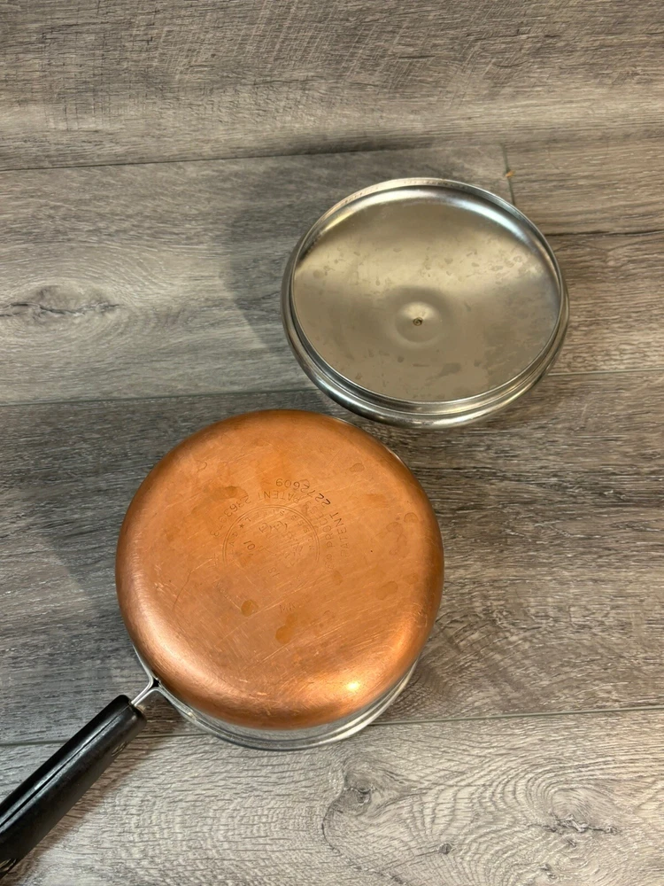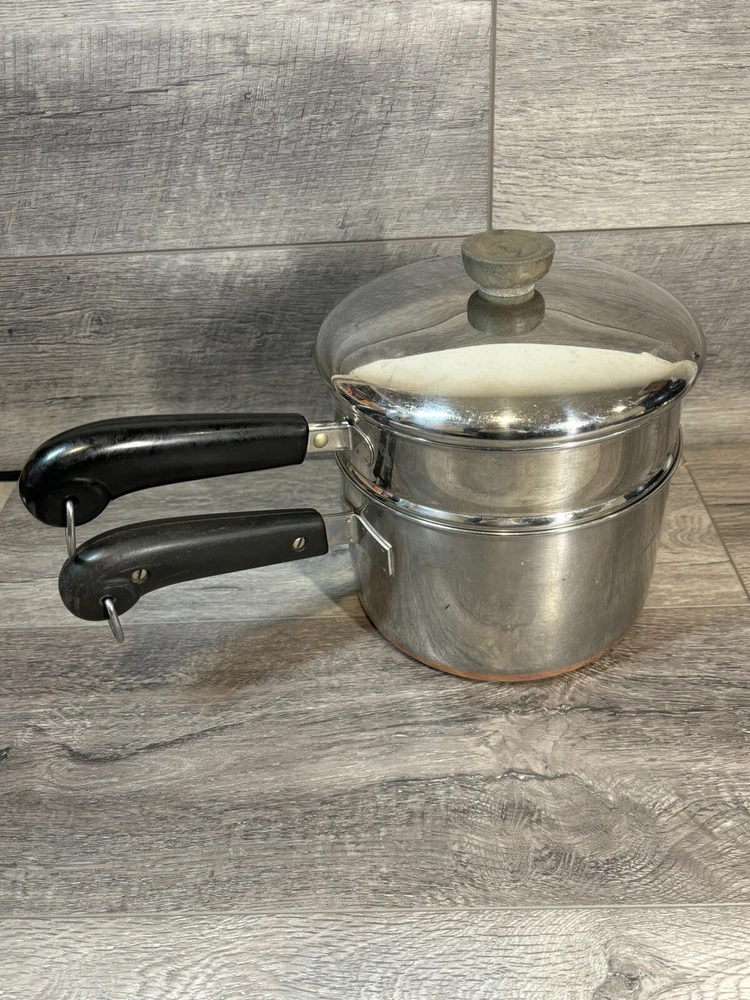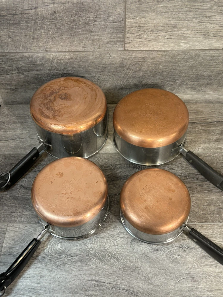 9 Piece Revere Ware 1801 Copper Bottom Cookware Set Sauce Pots Lids Steamer 3 Quart Sauce Pot with Lid 2 Quart Sauce Pot with Lid and Steamer 1.5 Quart Sauce Pot with Lid 1 Quart Sauce Pot with Lid
