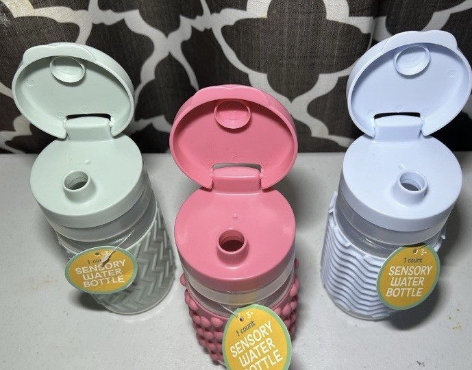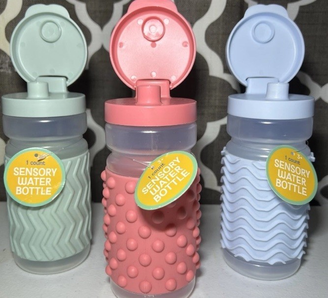 The product is a set of 9 sensory water bottles by Horizon Group USA, each in green, pink, and blue colors. With a total volume of 20.97 fl oz (620ml), these BPA-free plastic bottles are designed for cold drinks. Featuring a sensory grip and standing at 7" tall, they are perfect for camping, hiking, and other outdoor activities. The set includes 9 bottles, making it convenient for staying hydrated on the go. 3 of each color