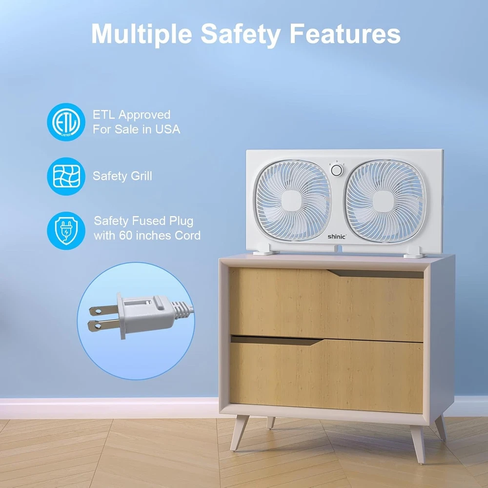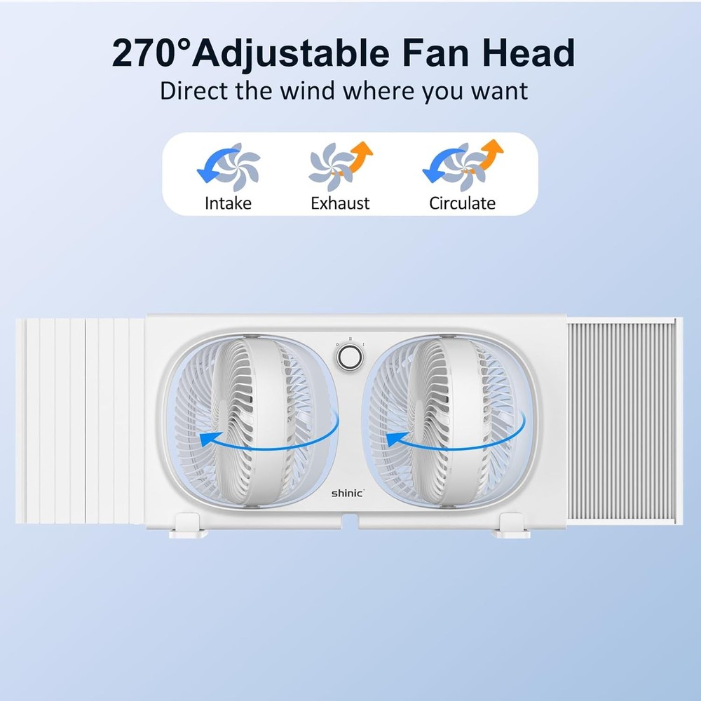 Product description For Exhausting, Cooling, Ventilating, Air Circulation Previous page Next page Stable And Fits Most Windows Details Two Adjustable Fan Heads Built-in 2 unique adjustable fan heads, each capable of a 270° rotation. Direct the airflow to where you want it. Easy to Use Controls Two-speed airflow with A simple knob control. Quiet operation to help move air without making noise. Removable Feet The window fan also comes with 2 detachable base, allowing it to be placed on a tabletop, providing additional usage scenarios. Portable Design The built-in handle can help easily remove this small window fan to the other place. Window Fan with Safety Design