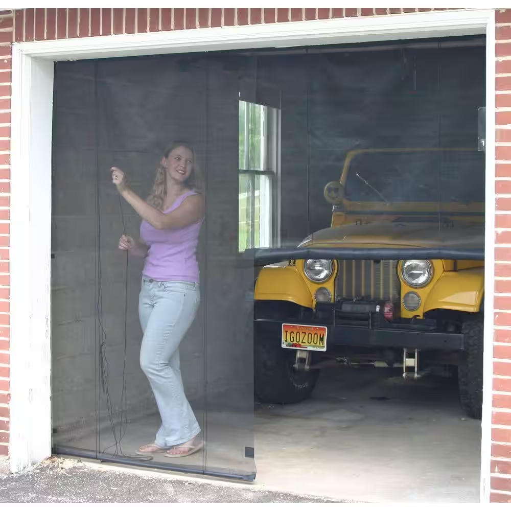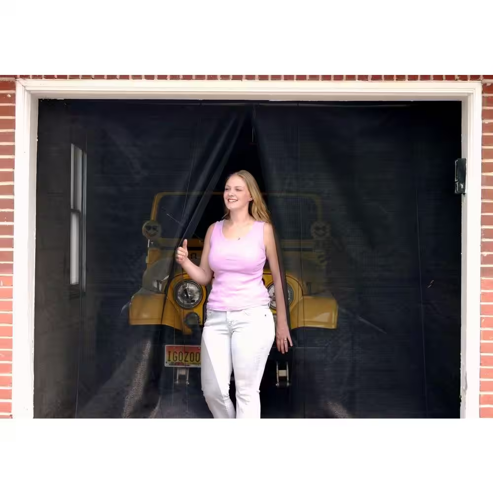 Multiple screens can be attached for larger garages Magnetic closure for easy opening and closing Features an easy-to-install design The Garage Instant Screen has multiple uses, not only for your garage, but also your awning, porch and more. The screen is made of durable black fiberglass screen for protection against the sun and insects. The Garage Instant Screen is the ideal solution for allowing you to work or entertain while enjoying the fresh air. Easy to install with hook and loop or screw hooks Roll-up accessory for easy storage (screw hook assembly only) Very durable black fiberglass screen Magnetic open and closure Attach two or more 9 ft. wide screens for larger garages